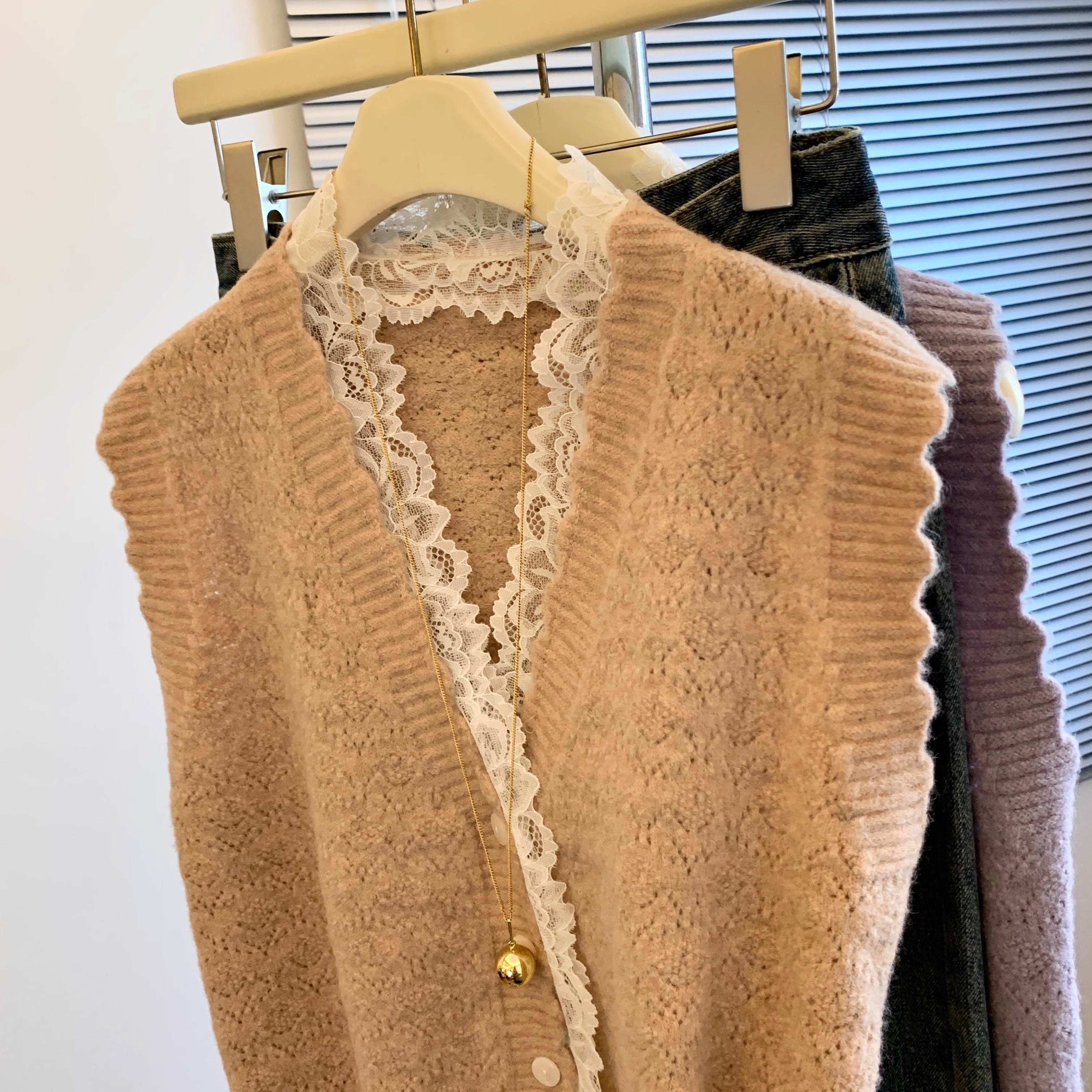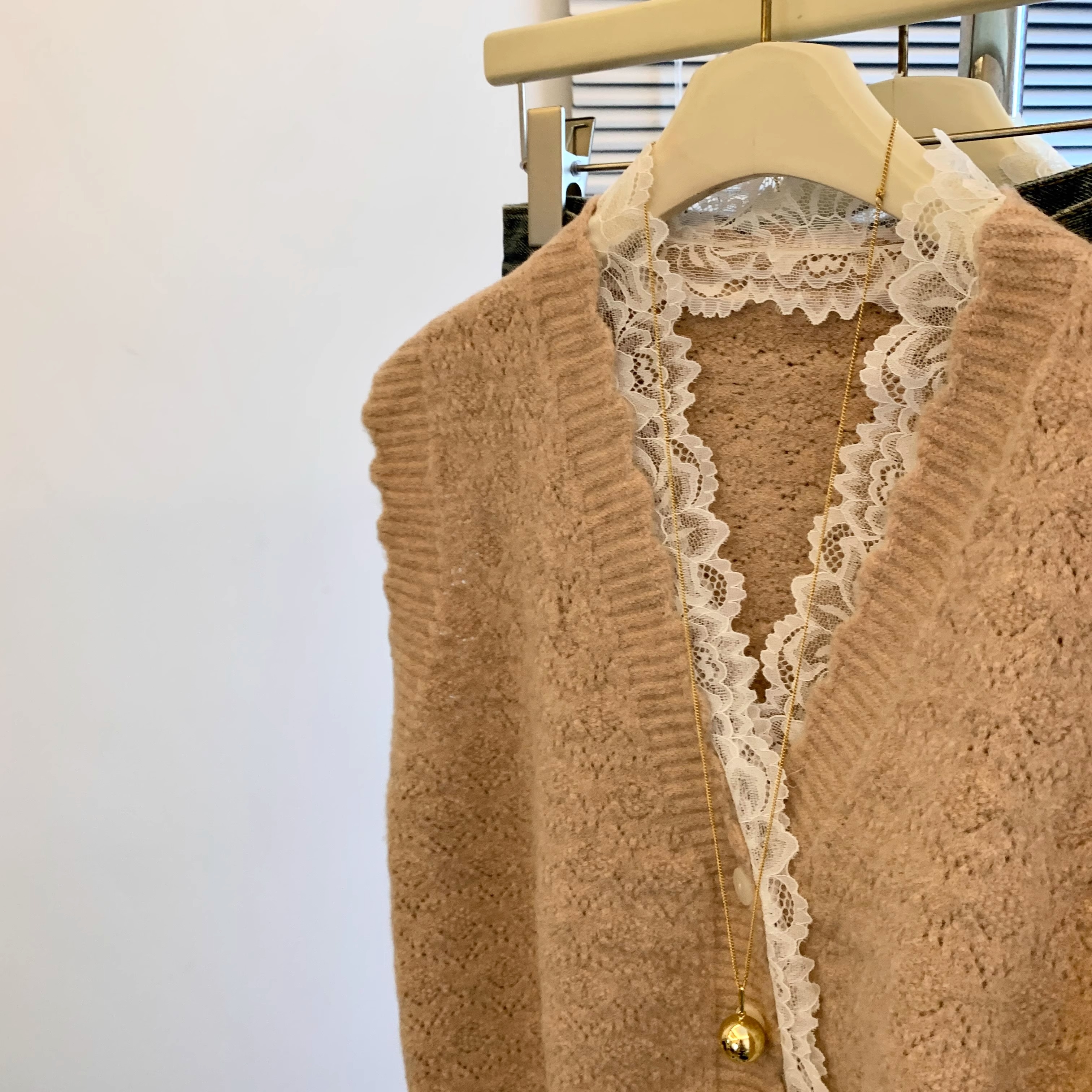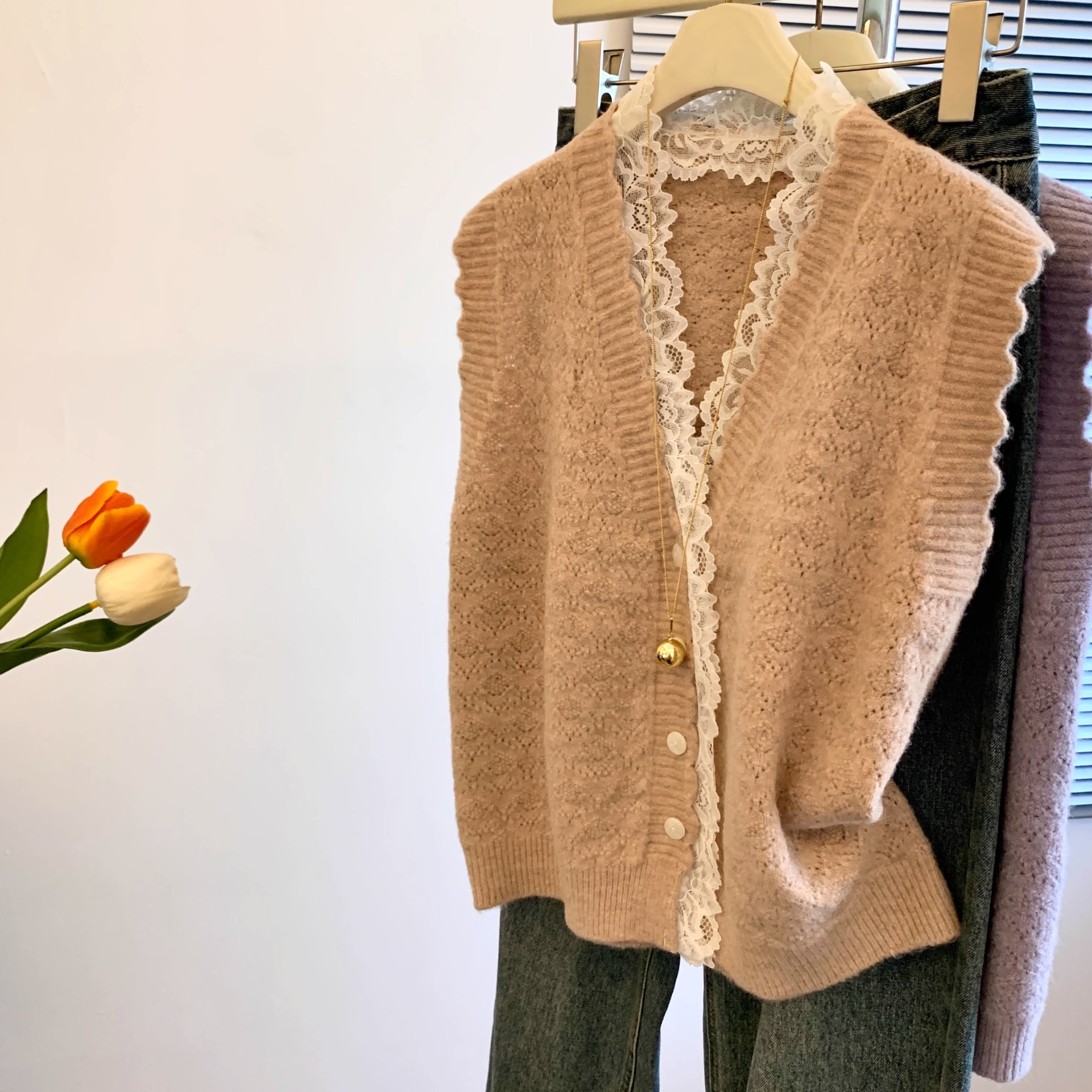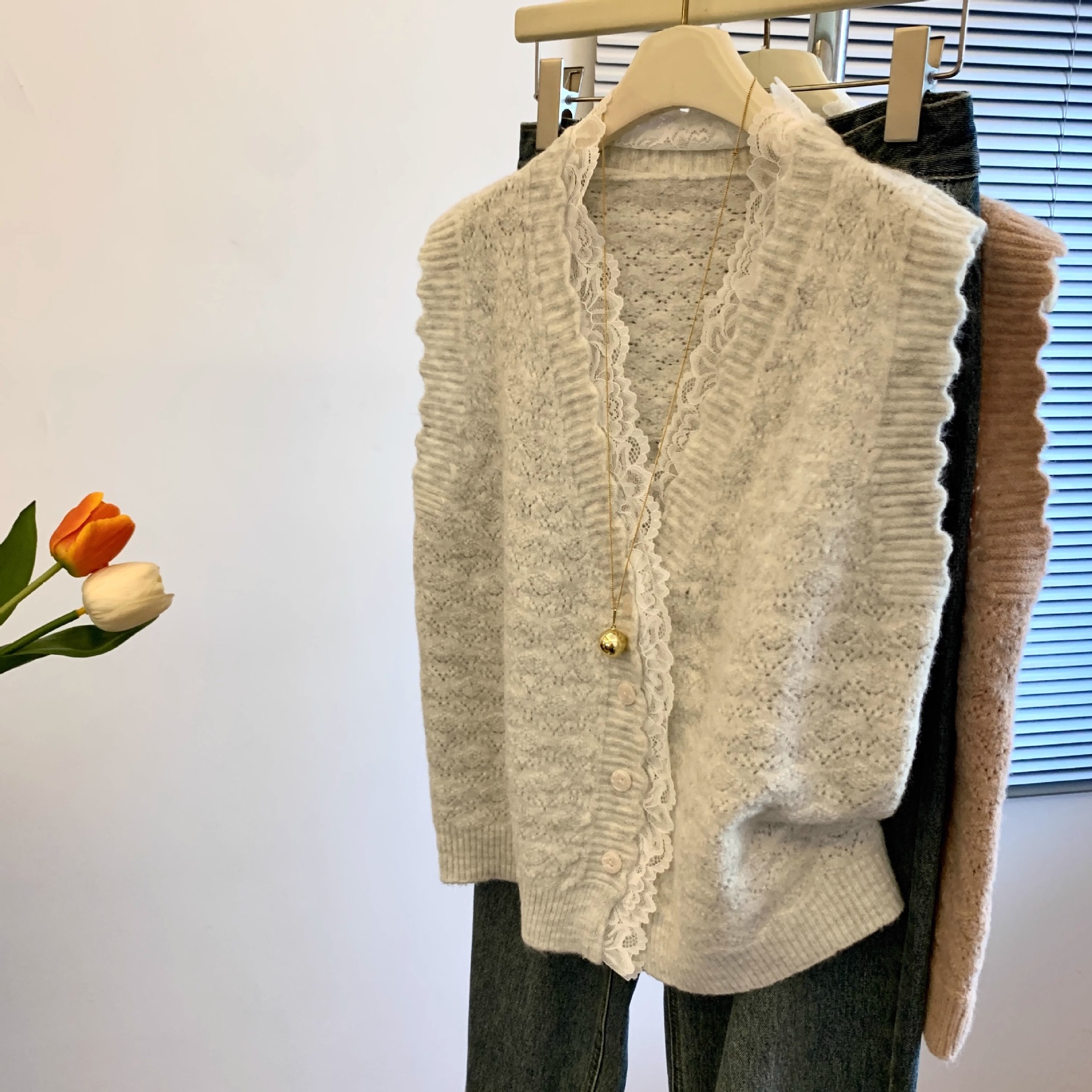 노란색 V 넥 레이스 스티칭 니트 조끼 여성 봄 2025 새로운 하이 엔드 카디건 양복 조끼 스웨터스토어 가기