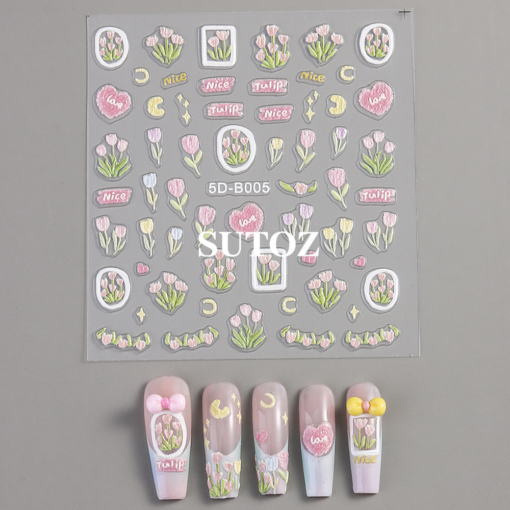 국경 간 뉴 네일 아트 스티커 Ins 달콤하고 신선한 핑크 튤립 스테레오 릴리프 네일 백 접착 스티커스토어 가기