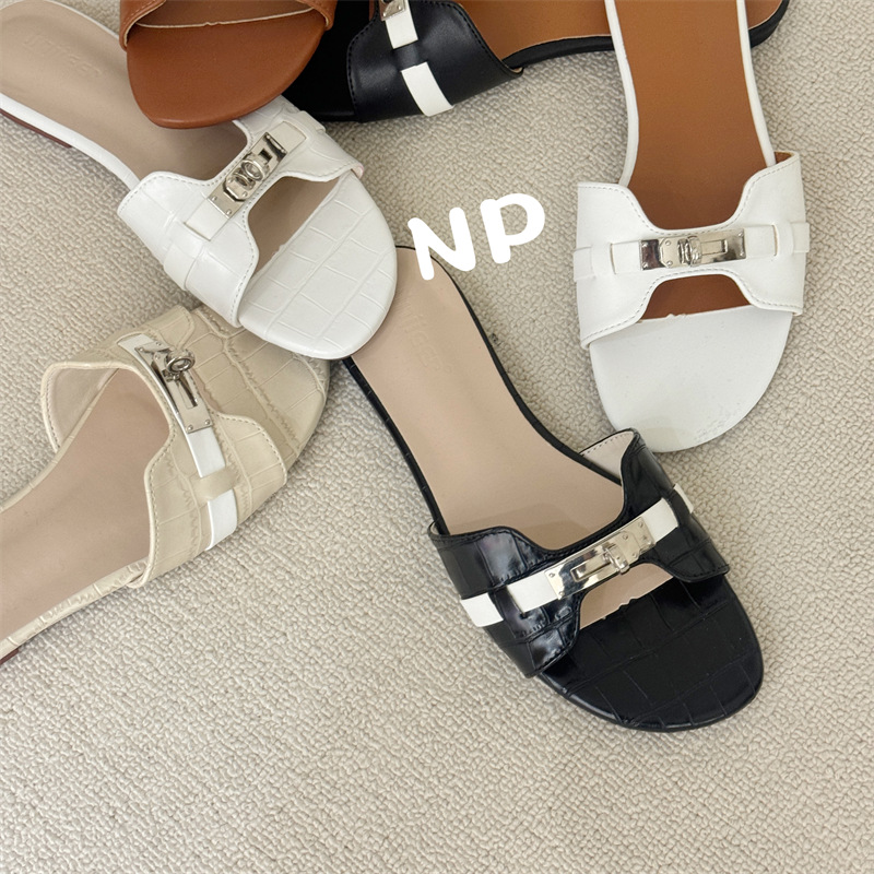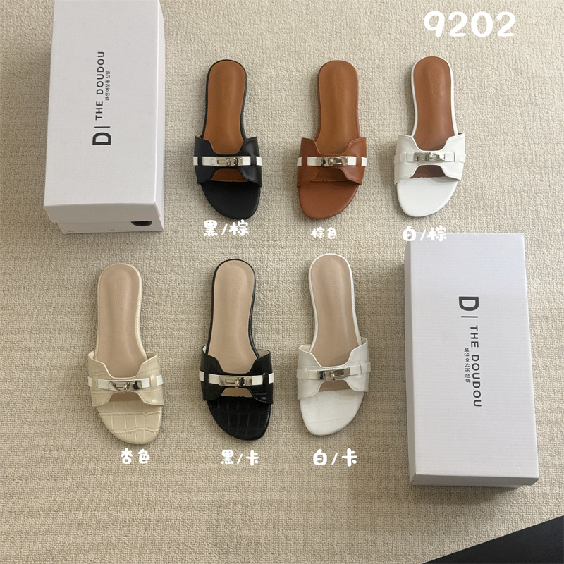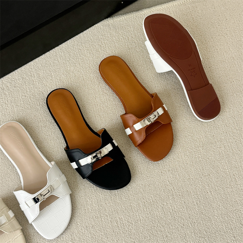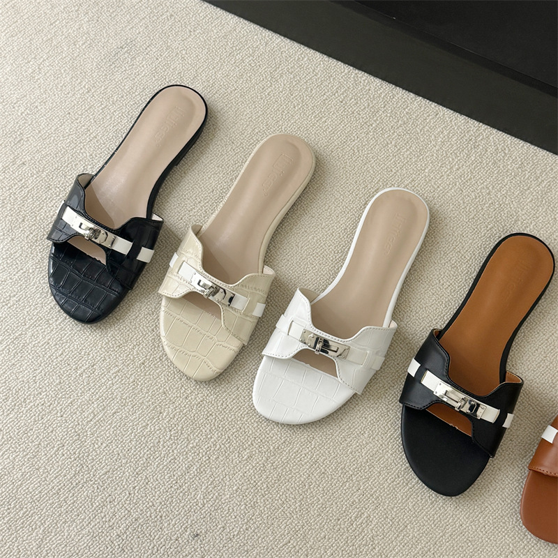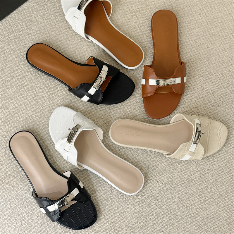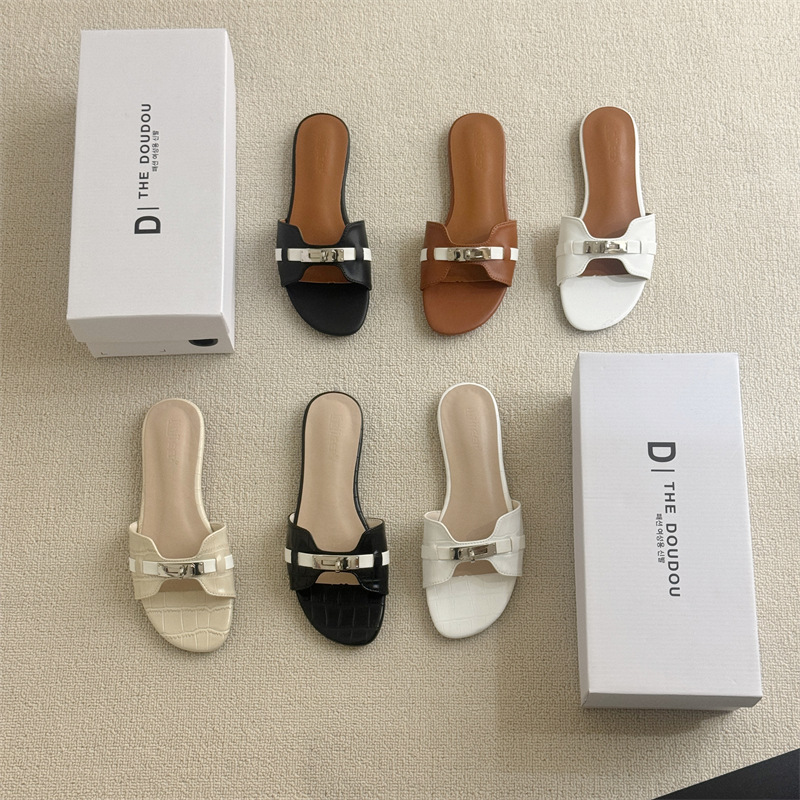 DOUDOU 한국 이스트 게이트 메탈 버클 플랫 슬리퍼 여름 여성을위한 우아한 오픈 토 할로우 착용 샌들