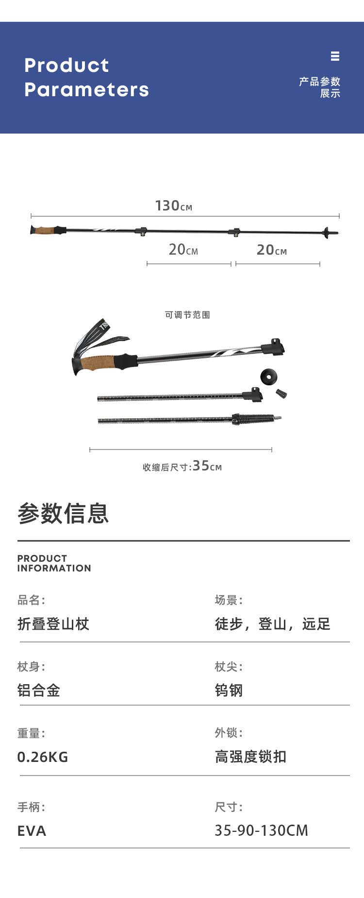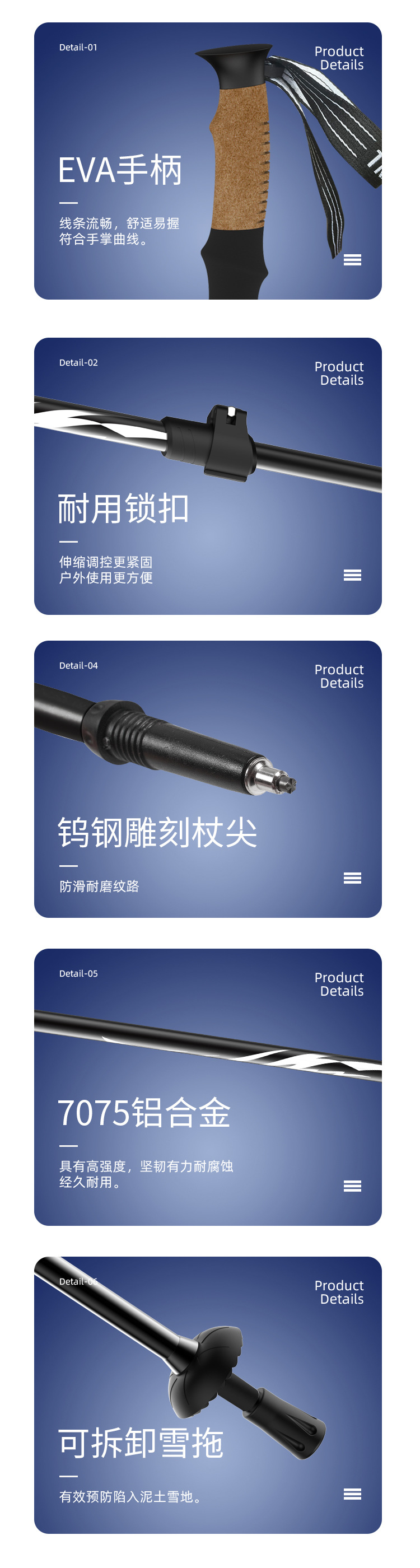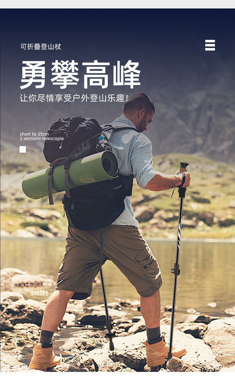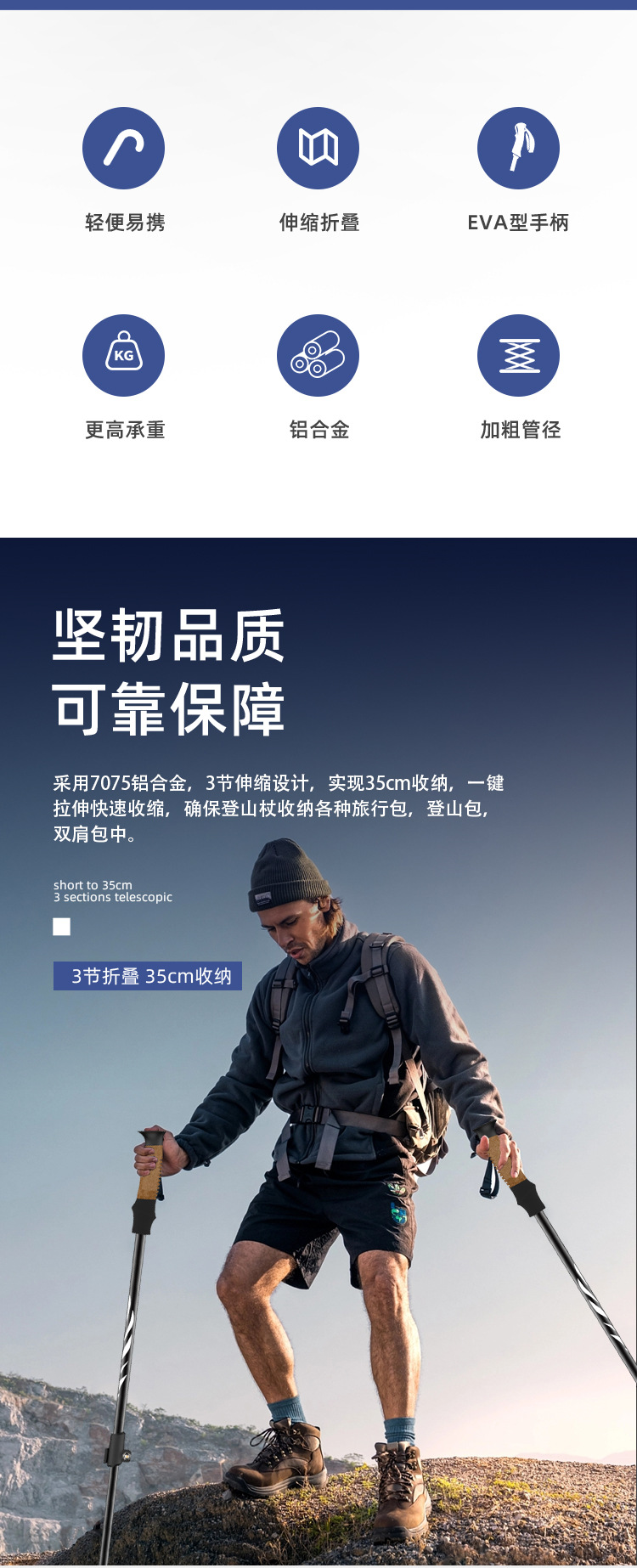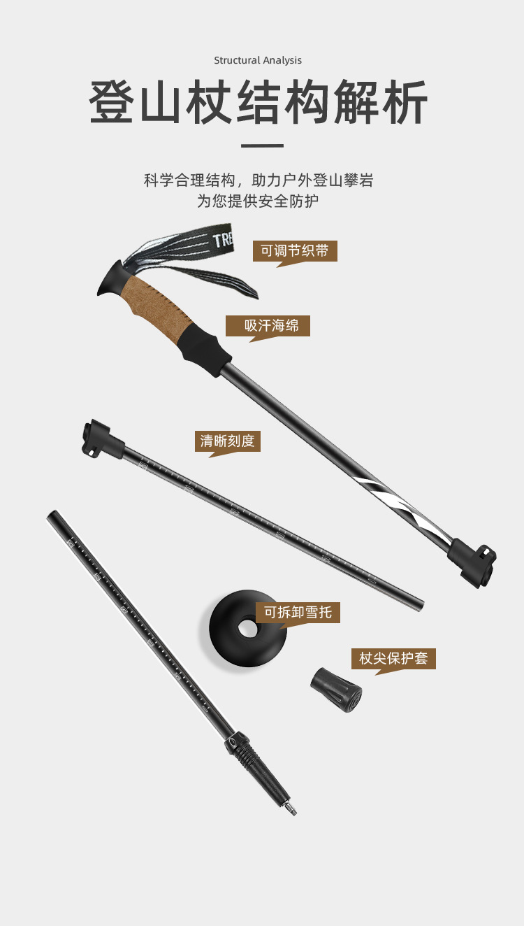 2. 登山杖操作规范:使用前检查杖身伸缩节、锁扣是否牢固,避免因部件松动导致登山杖断裂、滑落;调节长度时需确认锁扣完全锁紧,防止使用中突然缩短失衡。