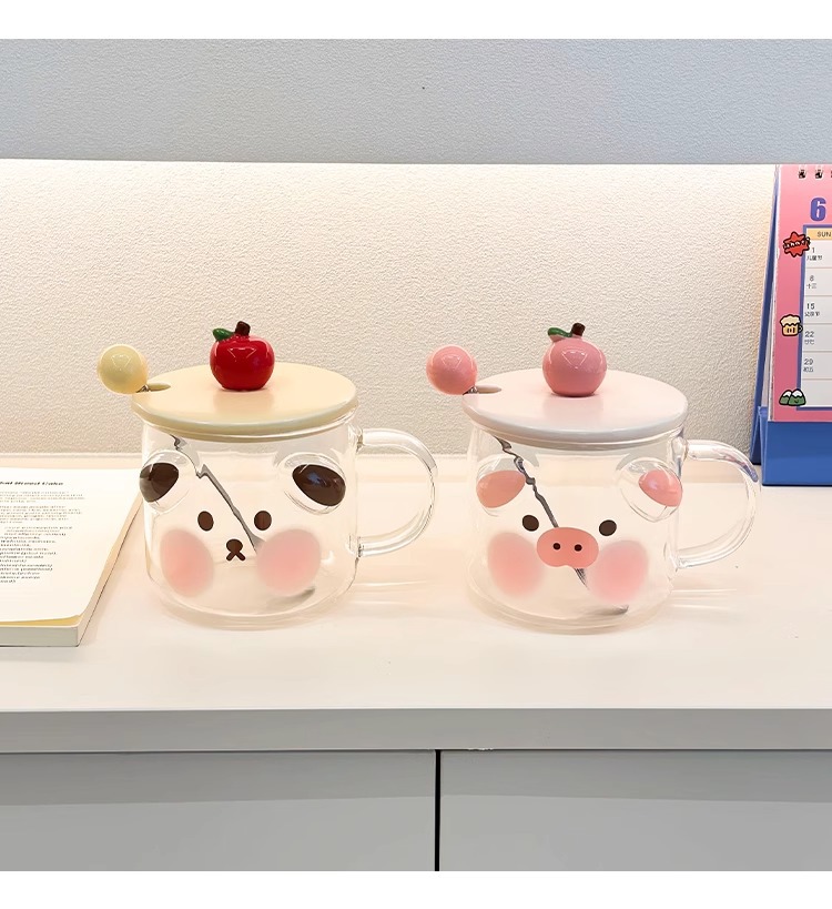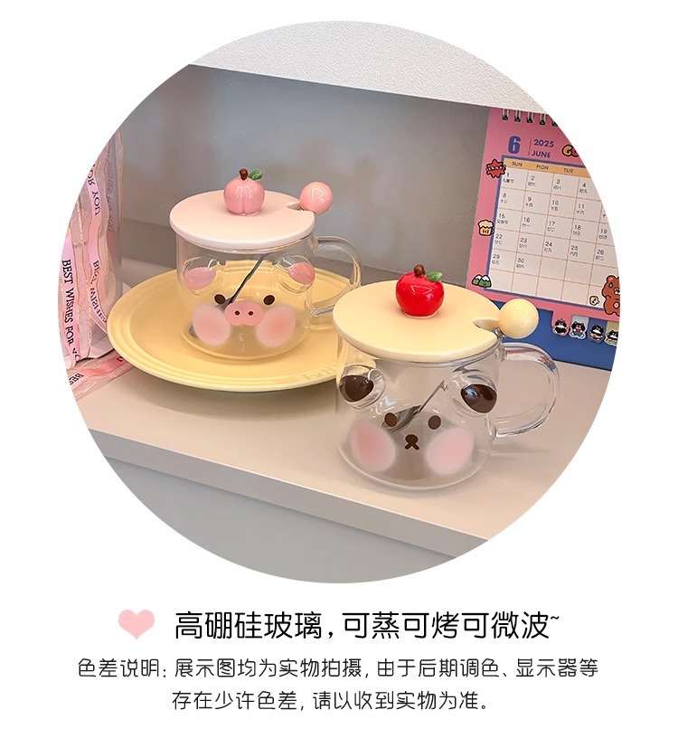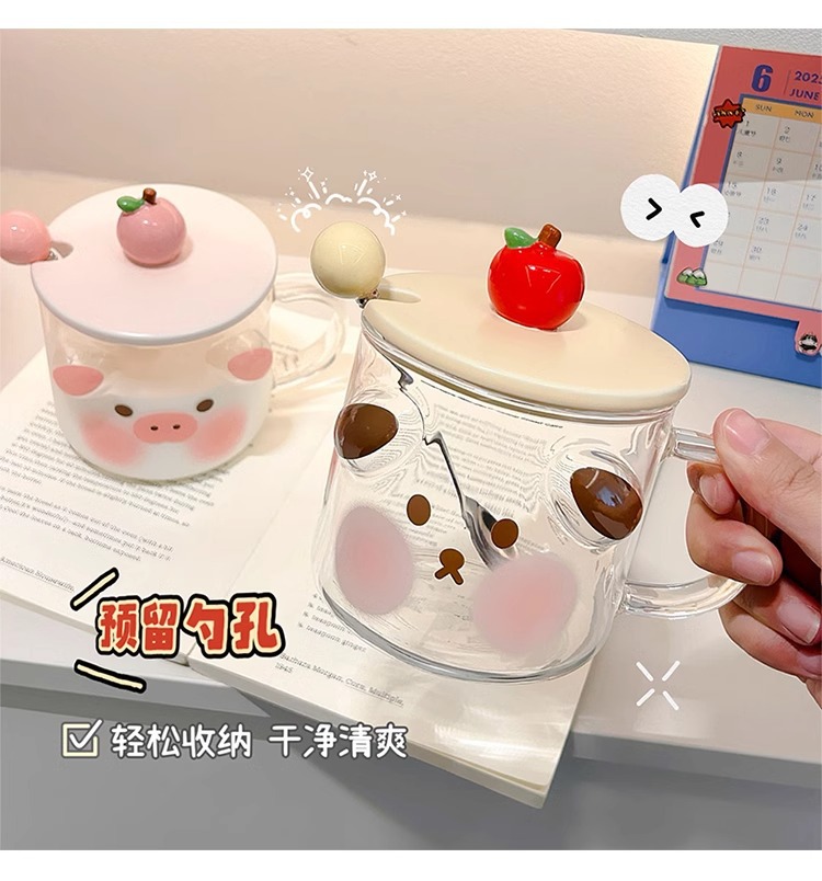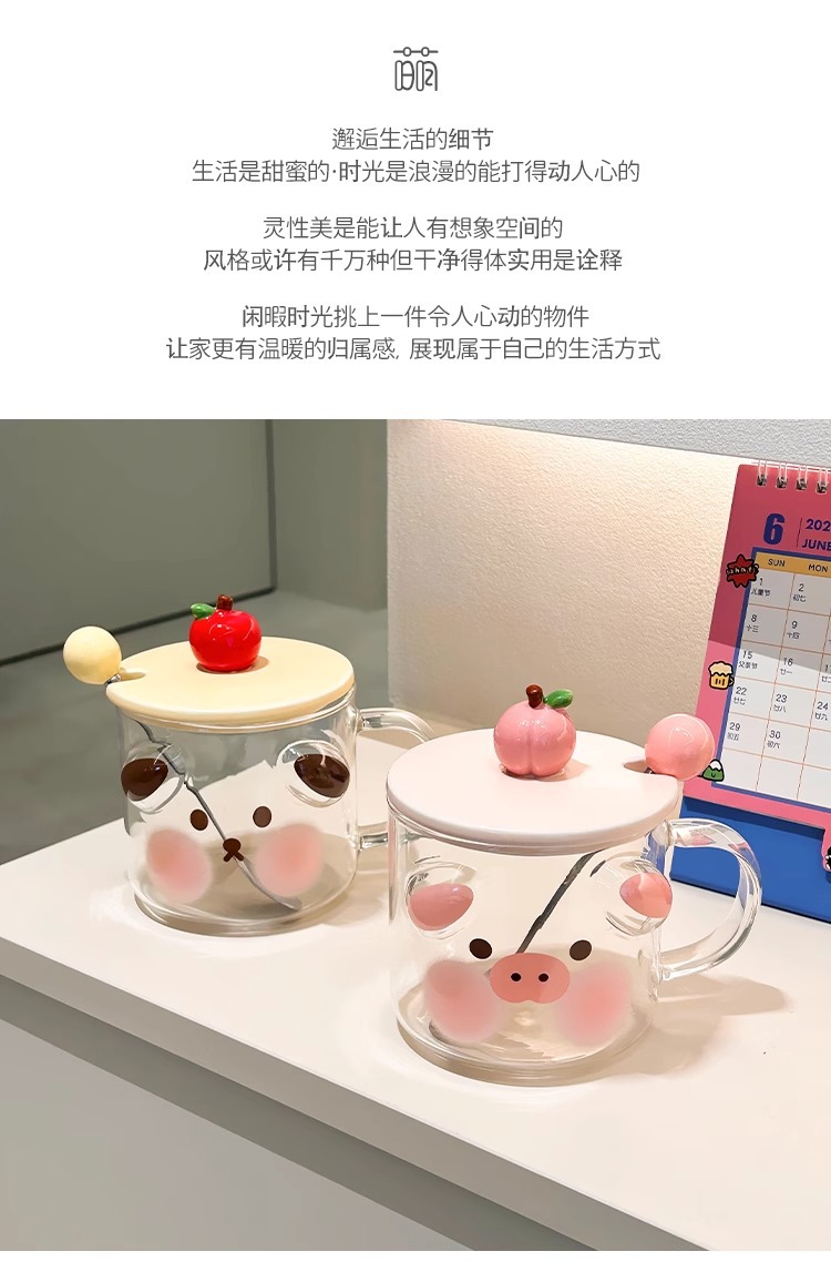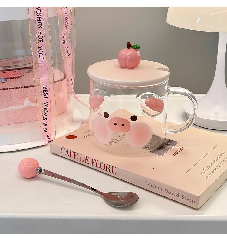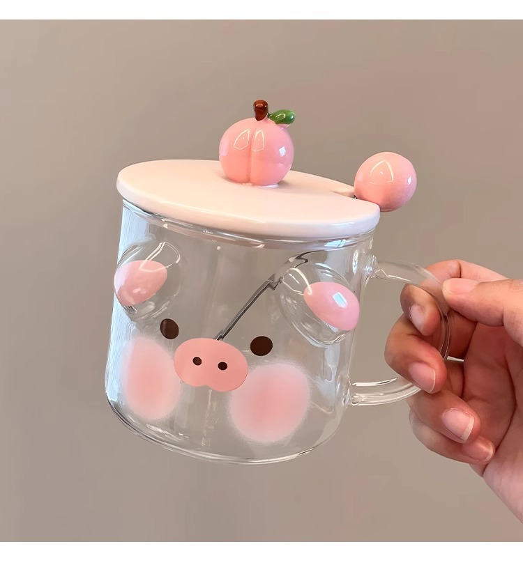 돼지 높은 색 가치 유리 머그잔 가구 전자 레인지 난방 컵 뚜껑 귀여운 마시는 컵 여자의 높은 온도 저항