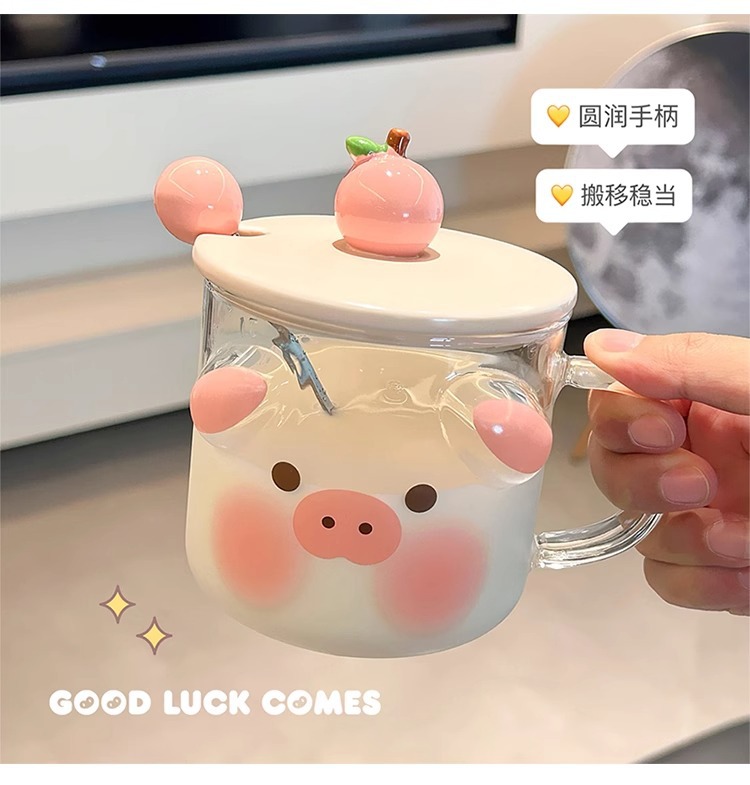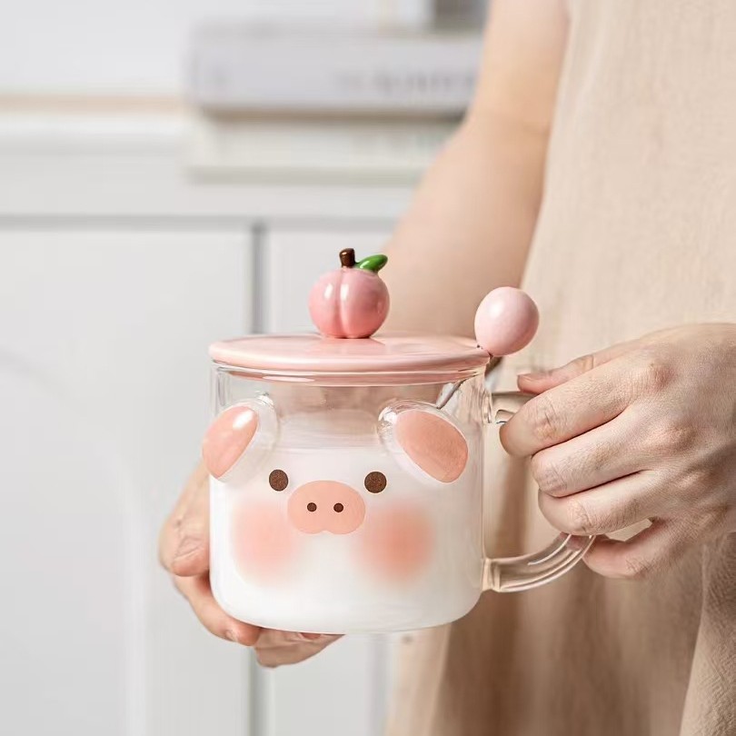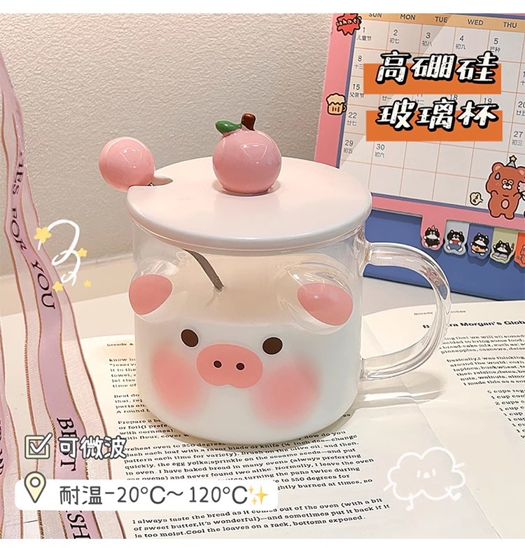 돼지 높은 색 가치 유리 머그잔 가구 전자 레인지 난방 컵 뚜껑 귀여운 마시는 컵 여자의 높은 온도 저항스토어 가기
