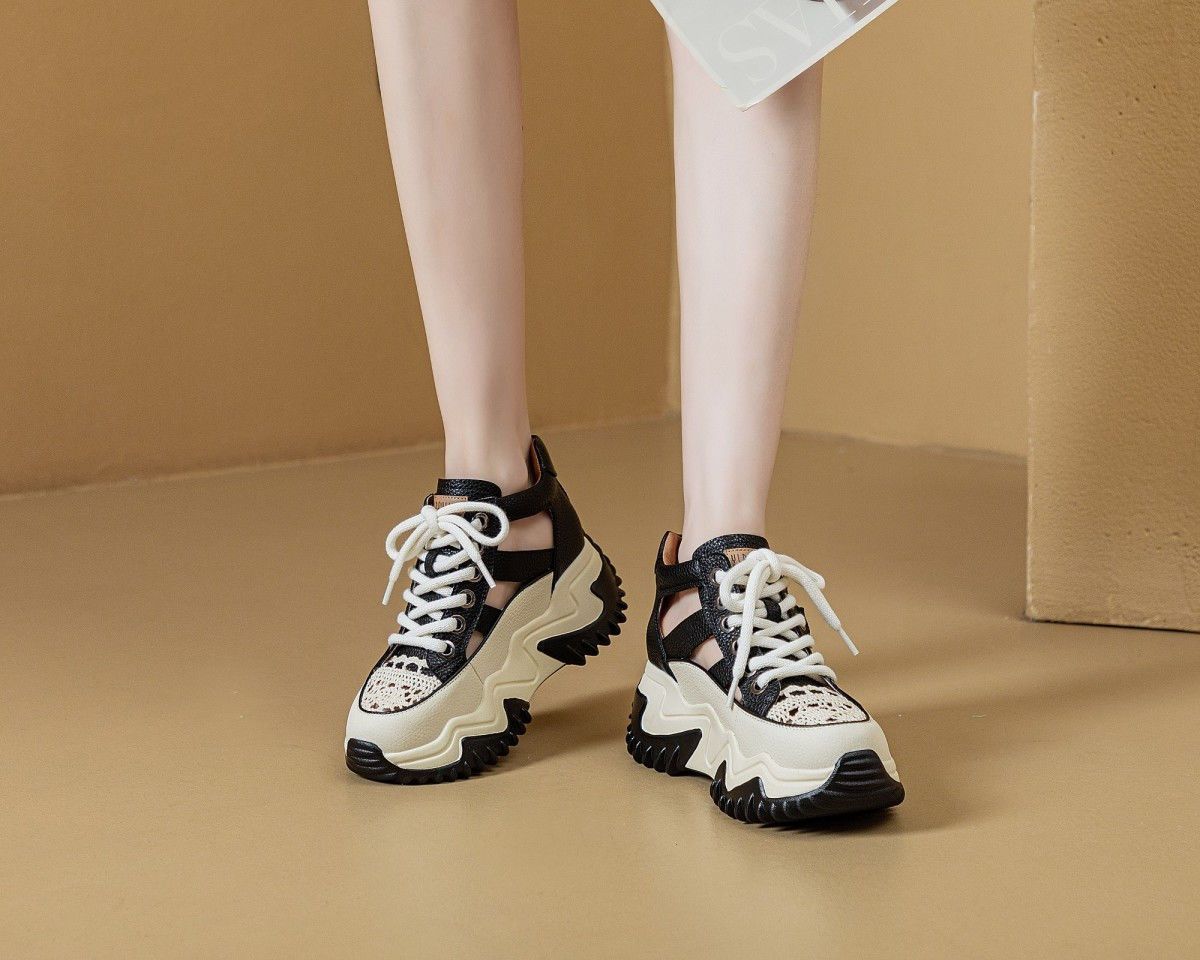 새로운 스타일 레이스 업 두꺼운 밑창 증가 토르 신발 여성 2023 년 여름 올 매치 패셔너블 컬러 할로우 통기성 운동화 여성