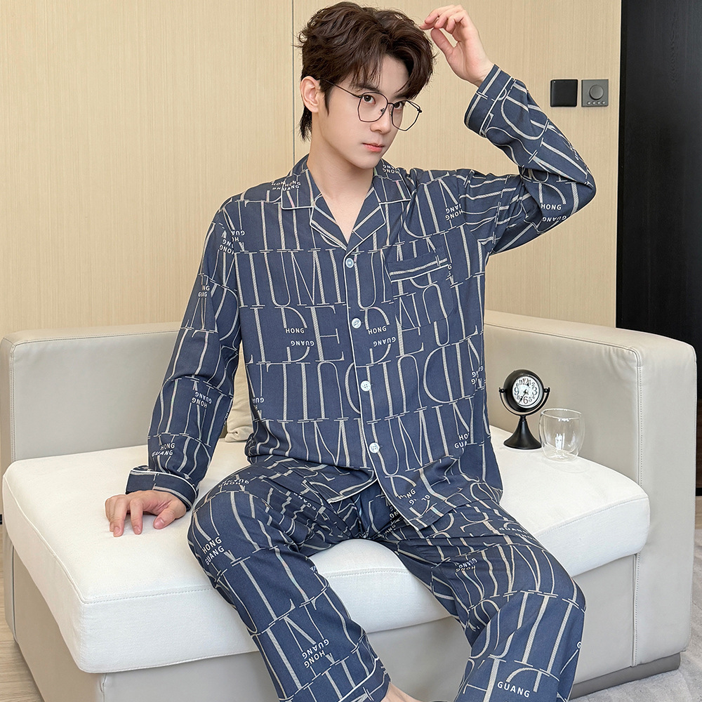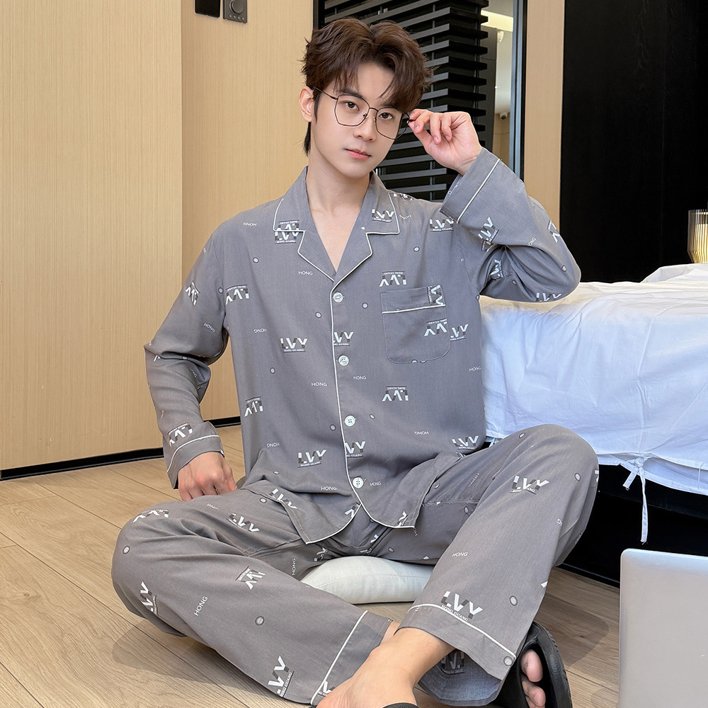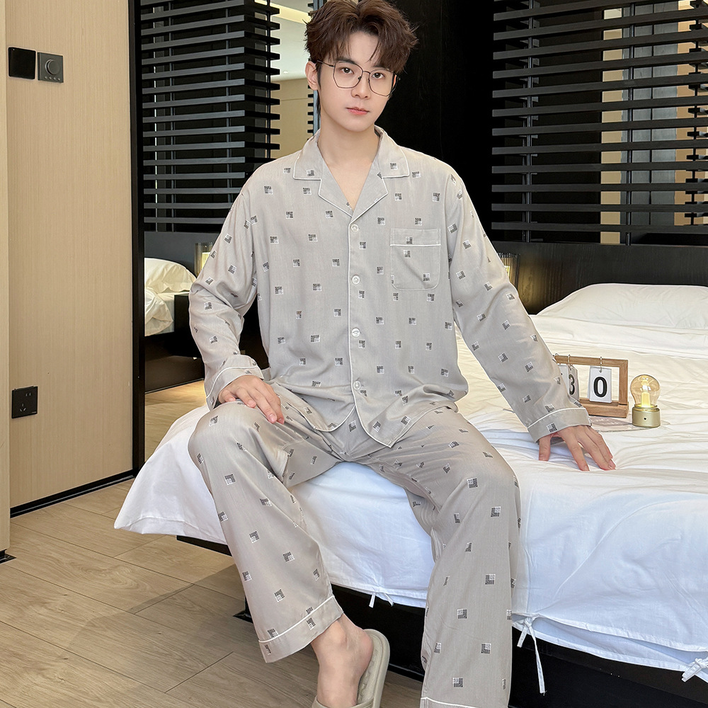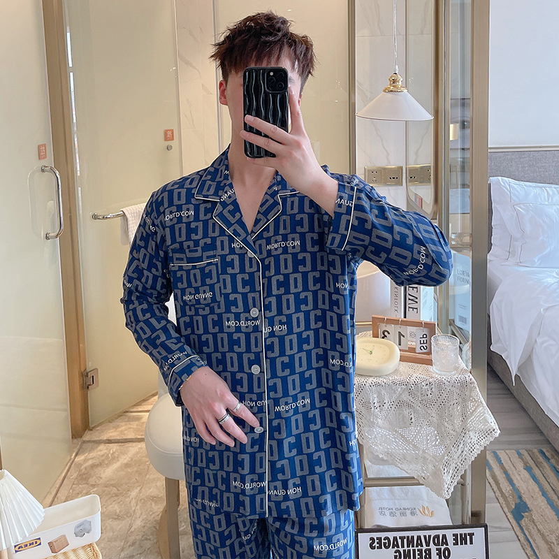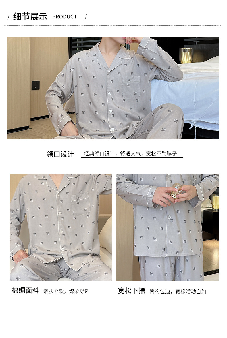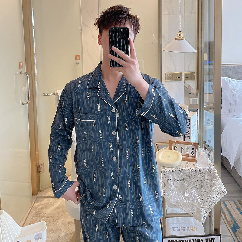 새로운 면 실크 잠옷 남자의 봄과 가을 긴팔 간단한 하이 엔드 얇은 남자의 여름 옷깃 홈 의류 세트스토어 가기