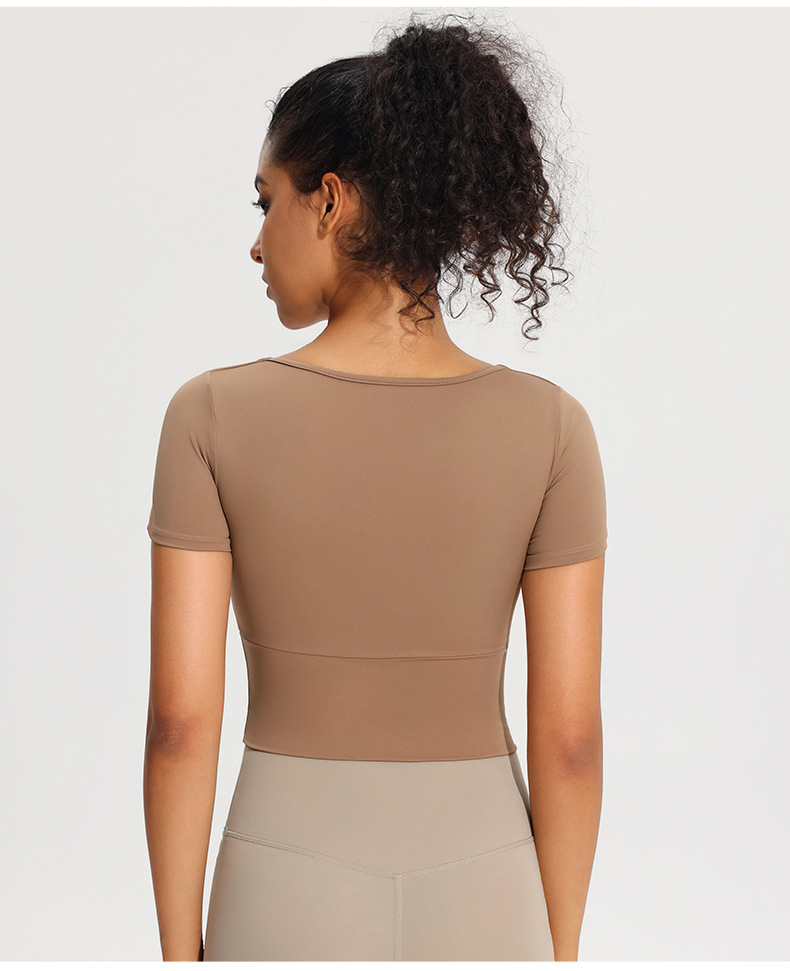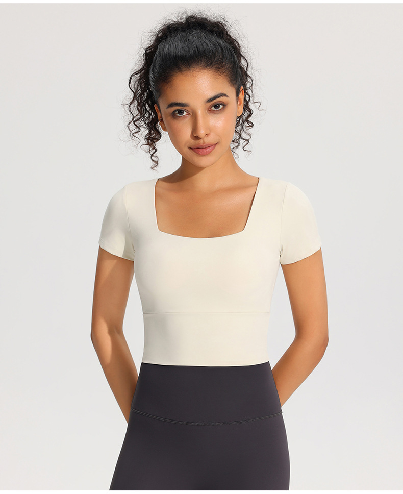 가슴 매트 여성용 슬림핏 슬리밍 스포츠 탑 하이 엔드 반팔 티셔츠 필라테스 스퀘어 칼라 피트니스 옷을 입은 요가 옷