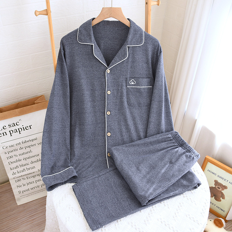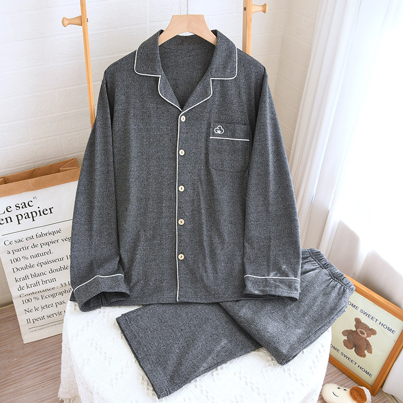 새로운 니트 코튼 남성용 잠옷 세트 두꺼운 간단한 옷깃 카디건 긴 소매 캐주얼 홈 의류 세트 도매