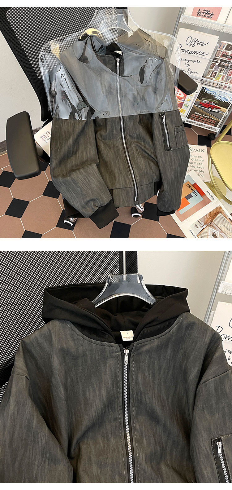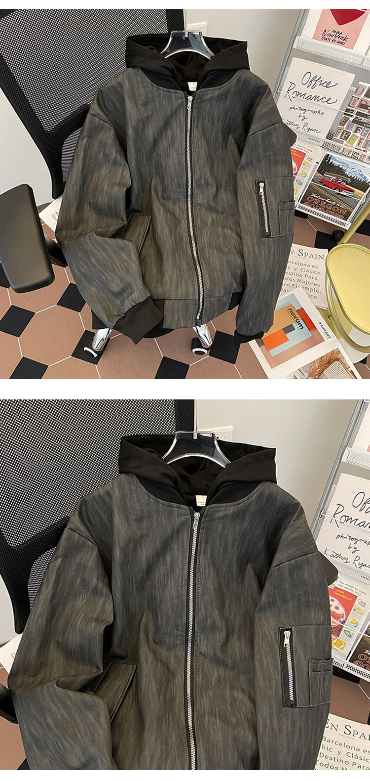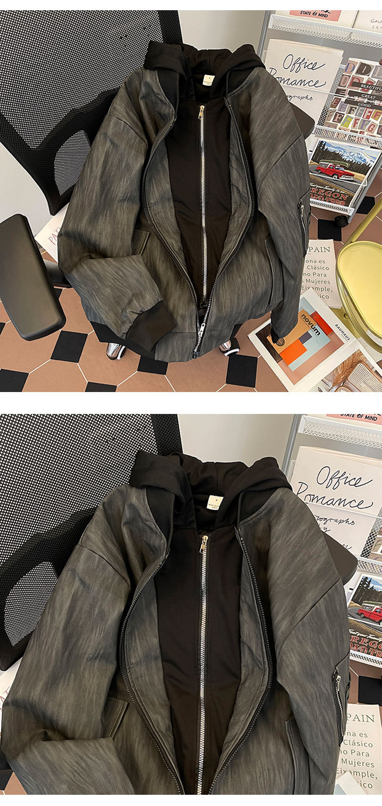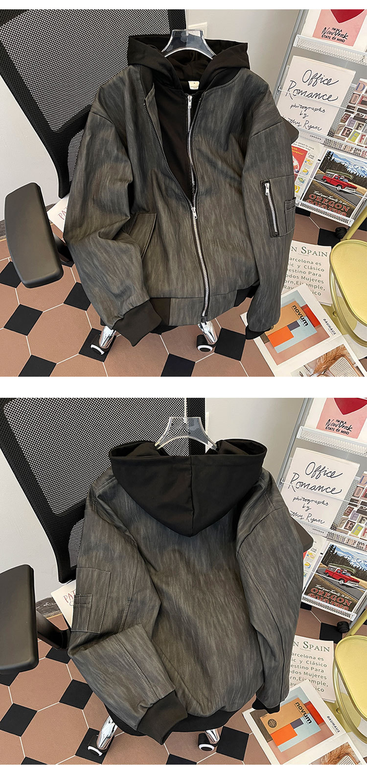 미국식 레트로 야구 세트 남자 가을과 겨울 느슨한 캐주얼 짧은 후드 가죽 질감 재킷 가짜 투피스 재킷스토어 가기