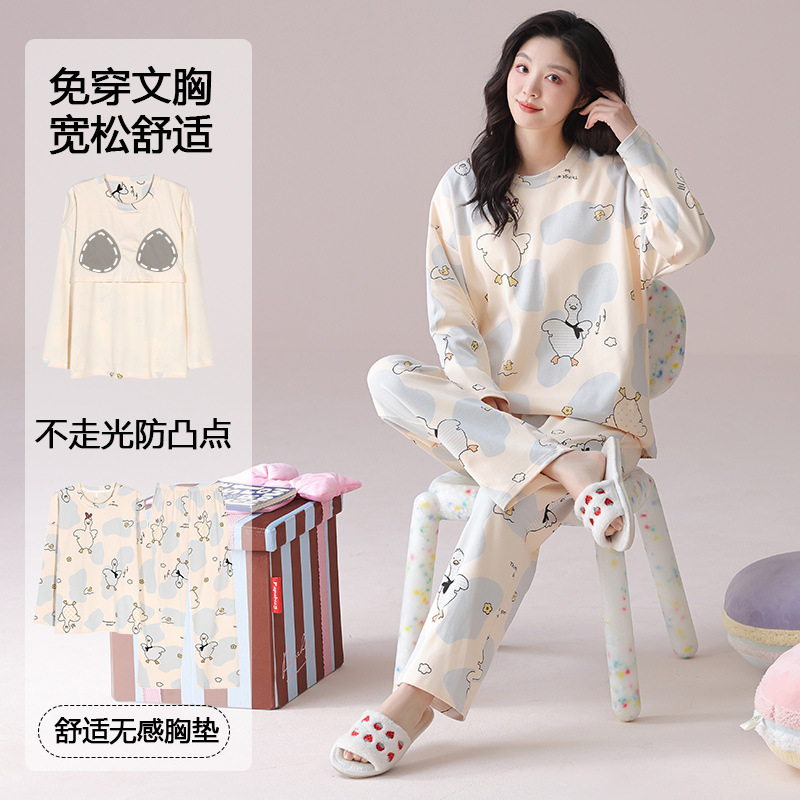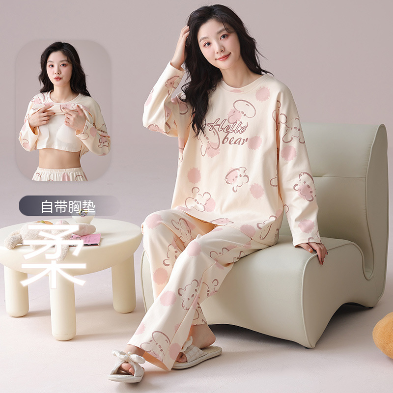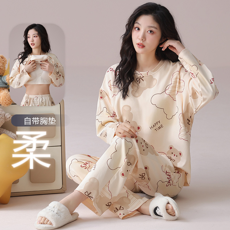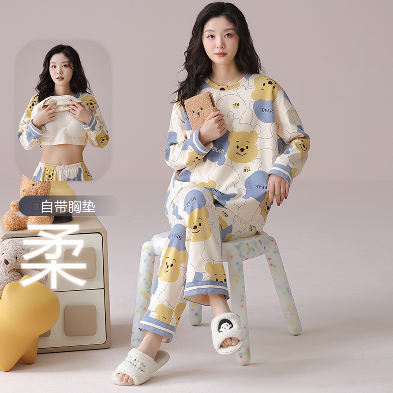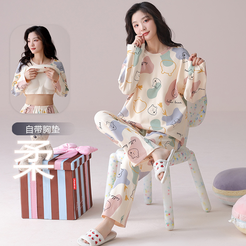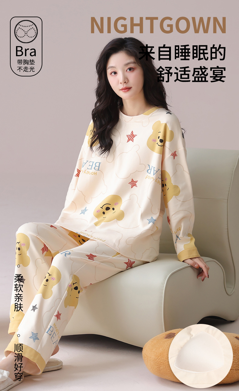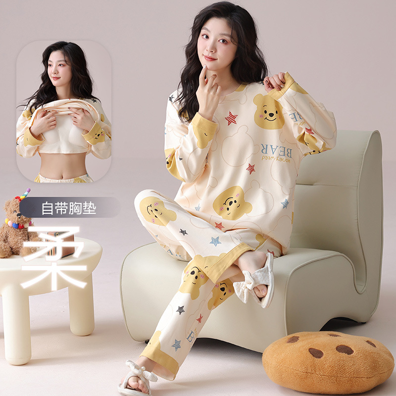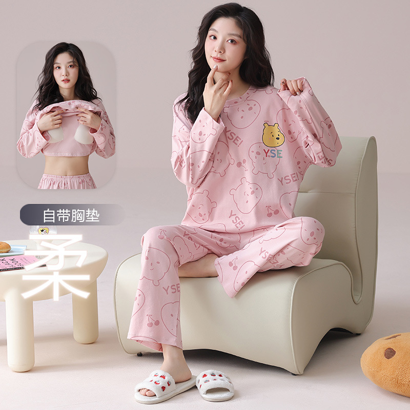 [순수한면] 가슴 패드를 가진 잠옷 여성 봄과 가을 긴 소매 패션 홈 의류 세트 가을과 겨울 귀여운 만화스토어 가기