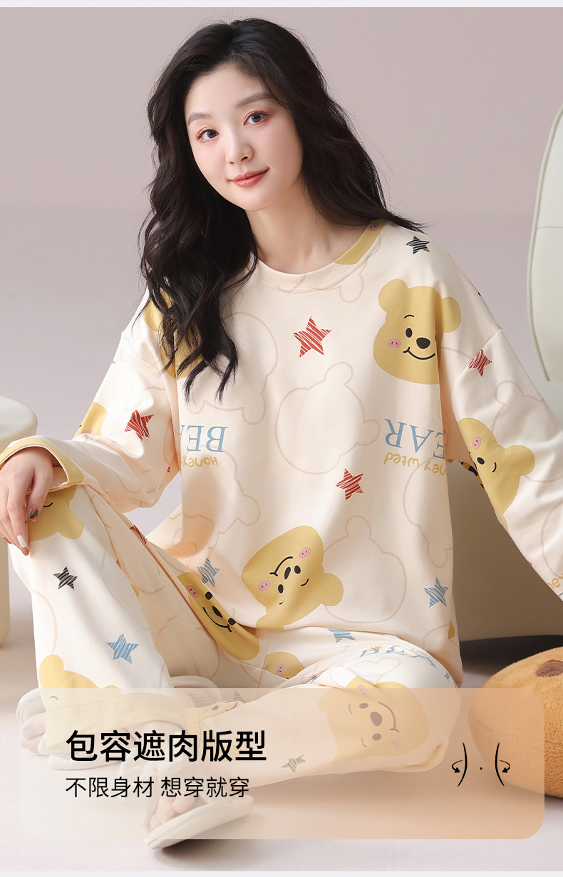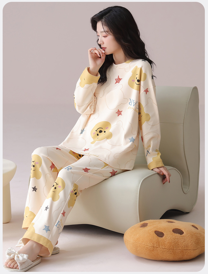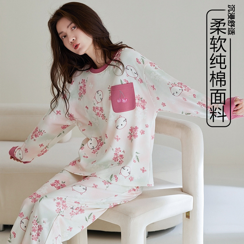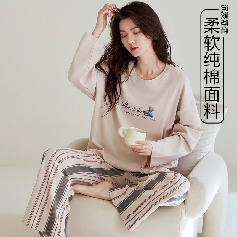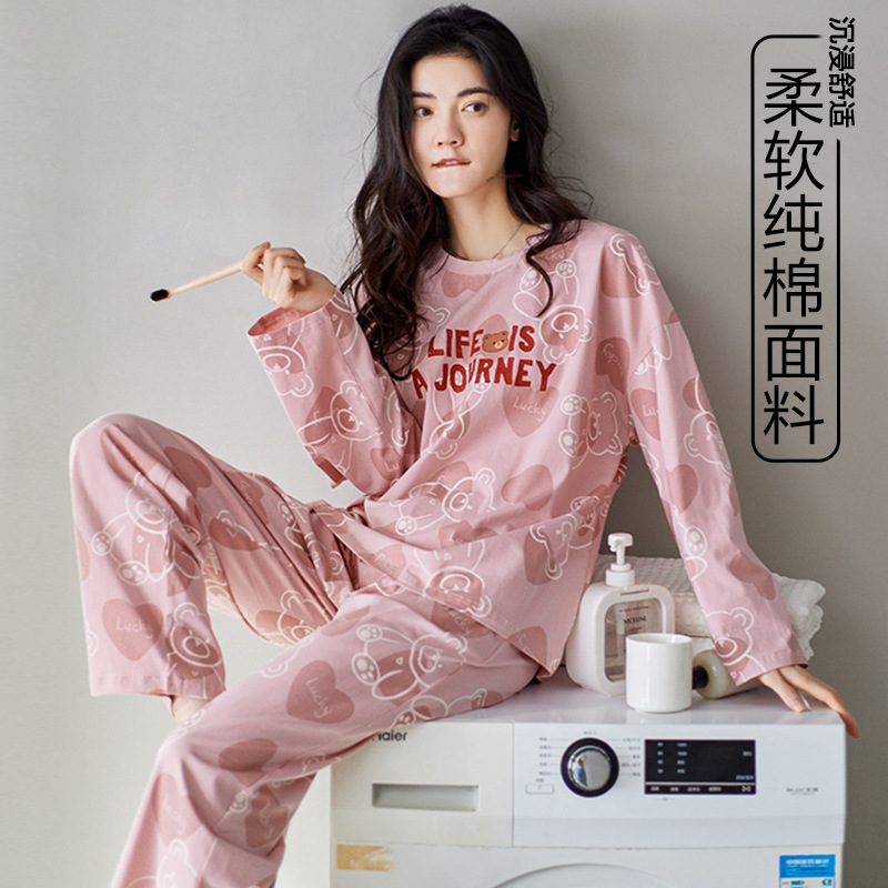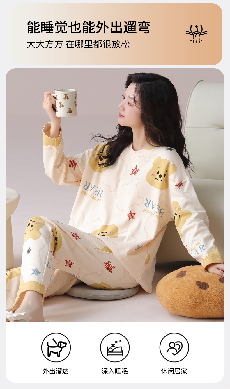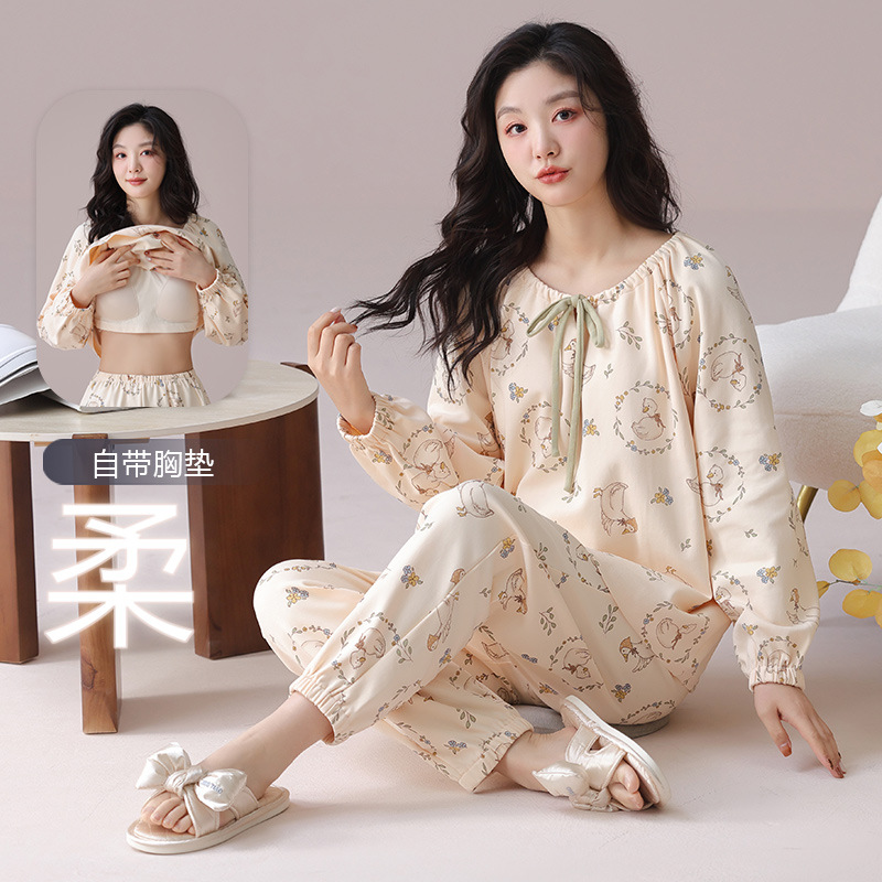 [순수한면] 가슴 패드를 가진 잠옷 여성 봄과 가을 긴 소매 패션 홈 의류 세트 가을과 겨울 귀여운 만화스토어 가기