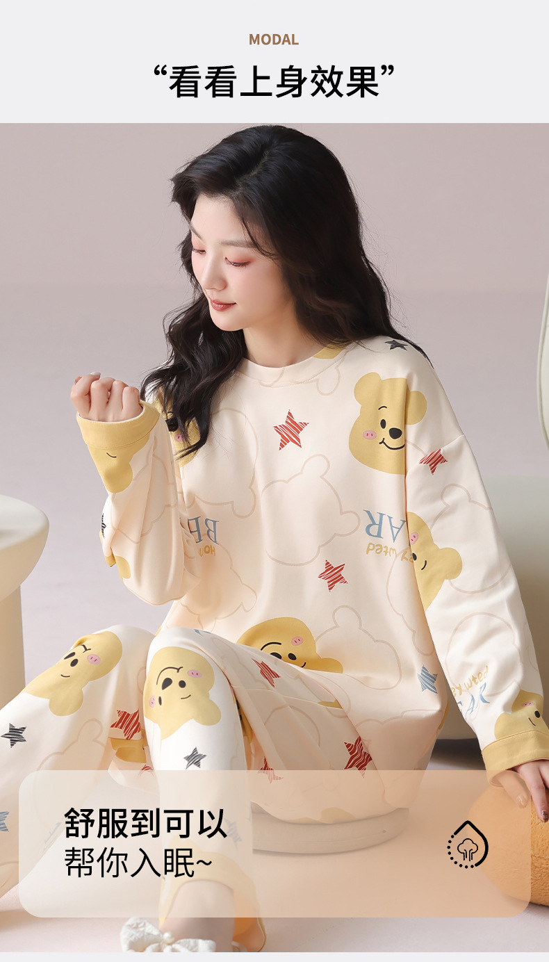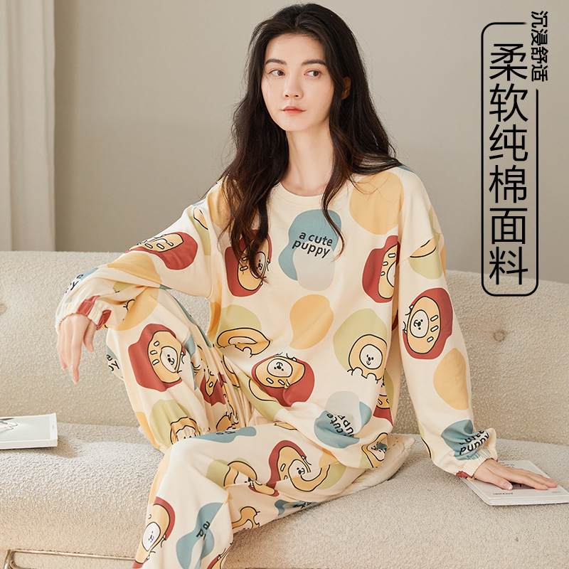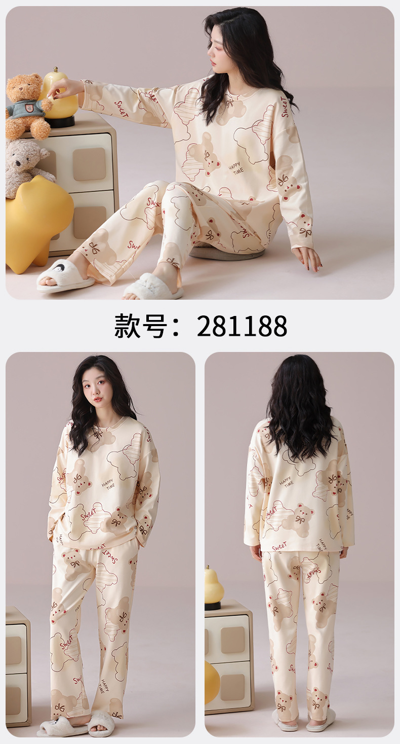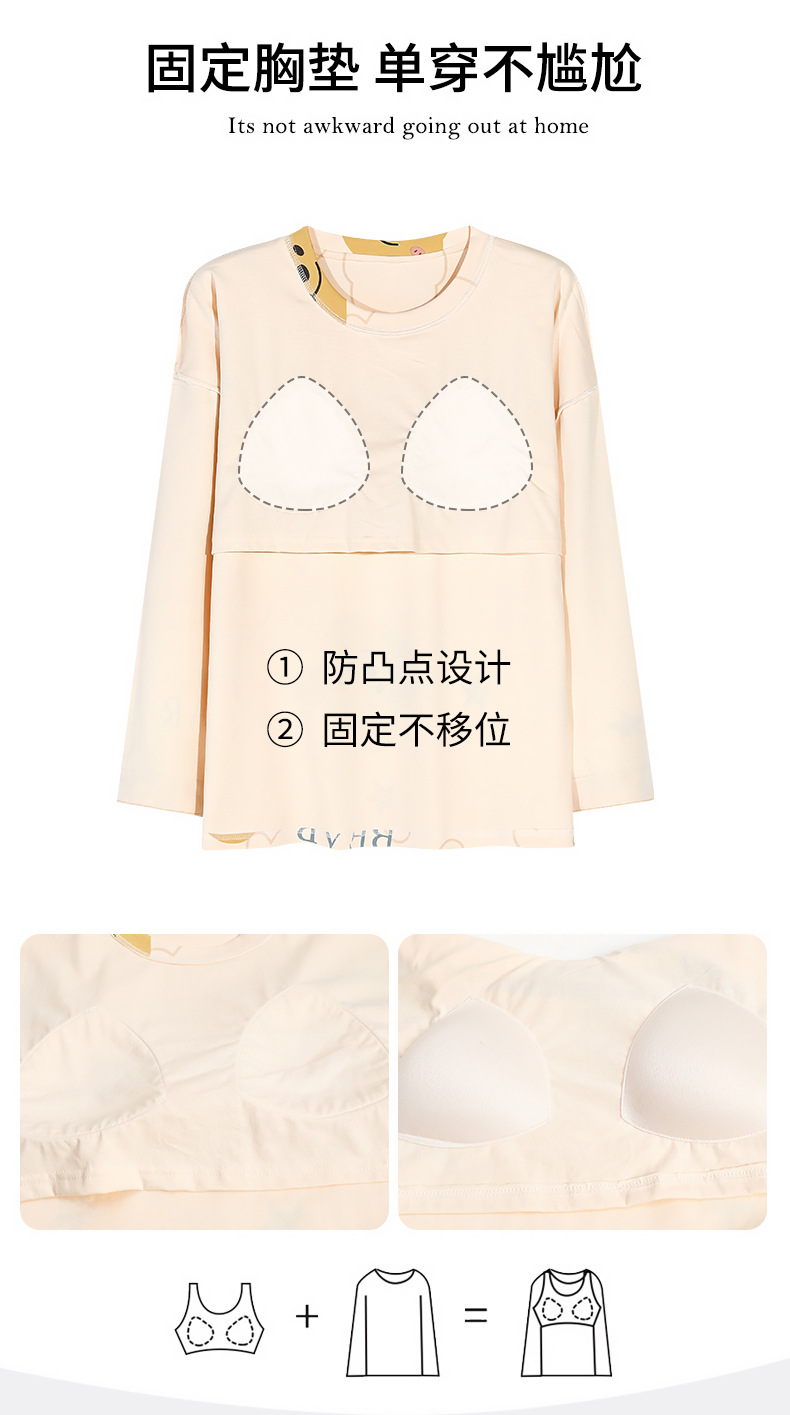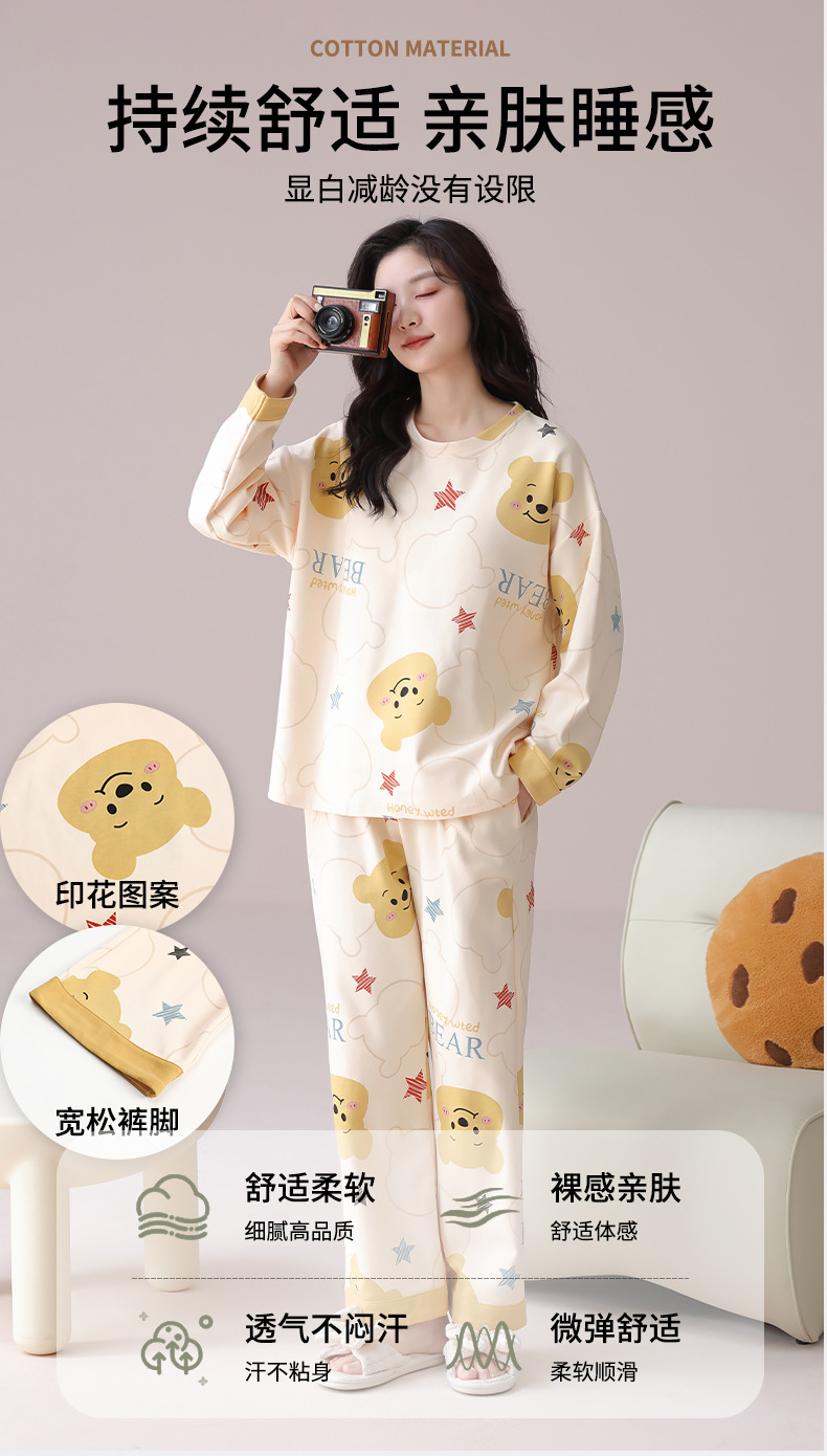 [순수한면] 가슴 패드를 가진 잠옷 여성 봄과 가을 긴 소매 패션 홈 의류 세트 가을과 겨울 귀여운 만화스토어 가기