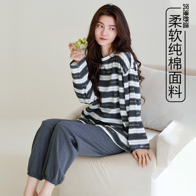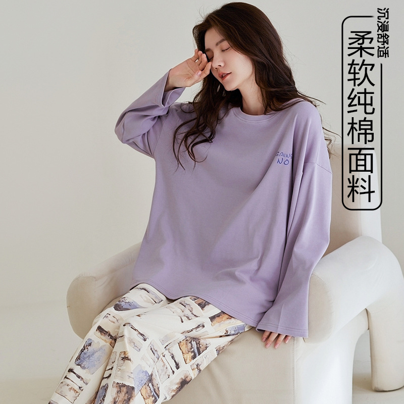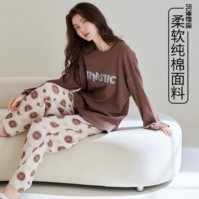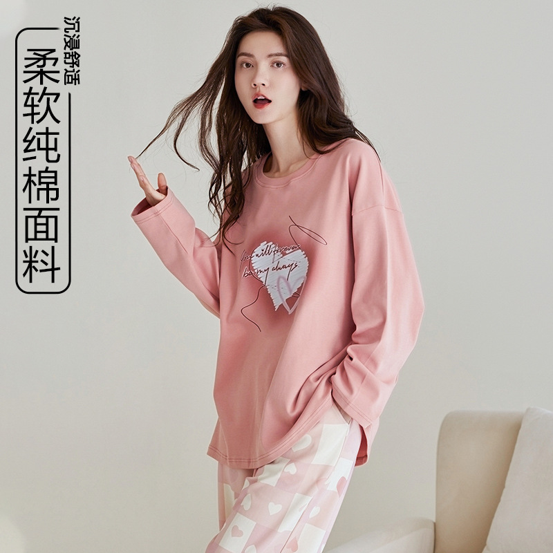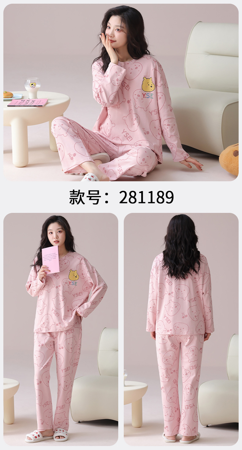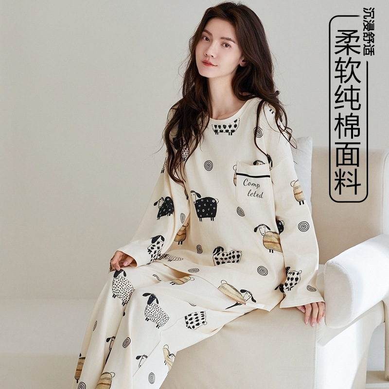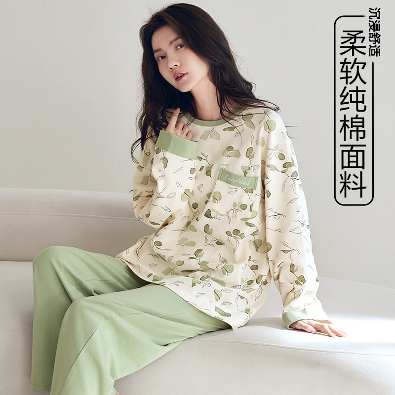 [순수한면] 가슴 패드를 가진 잠옷 여성 봄과 가을 긴 소매 패션 홈 의류 세트 가을과 겨울 귀여운 만화스토어 가기
