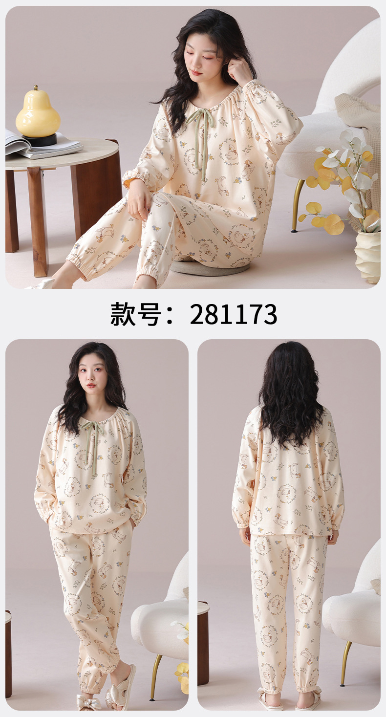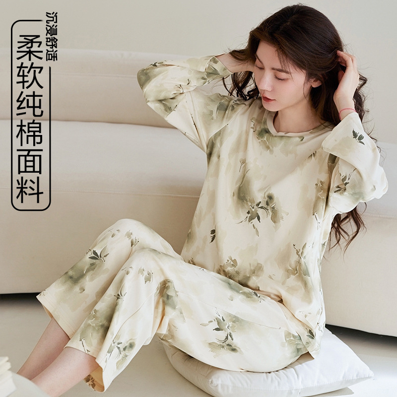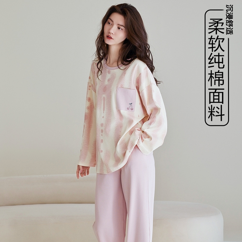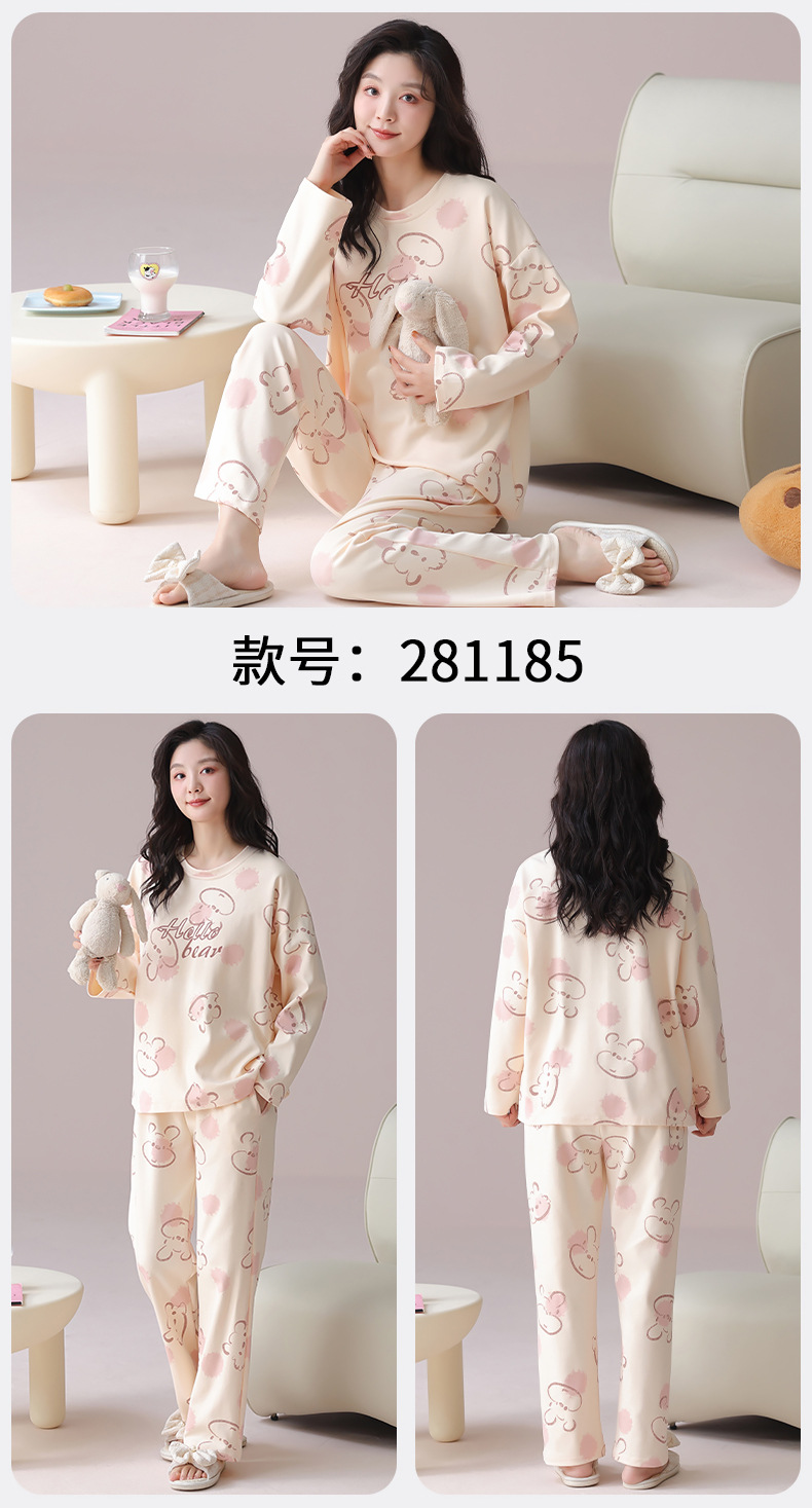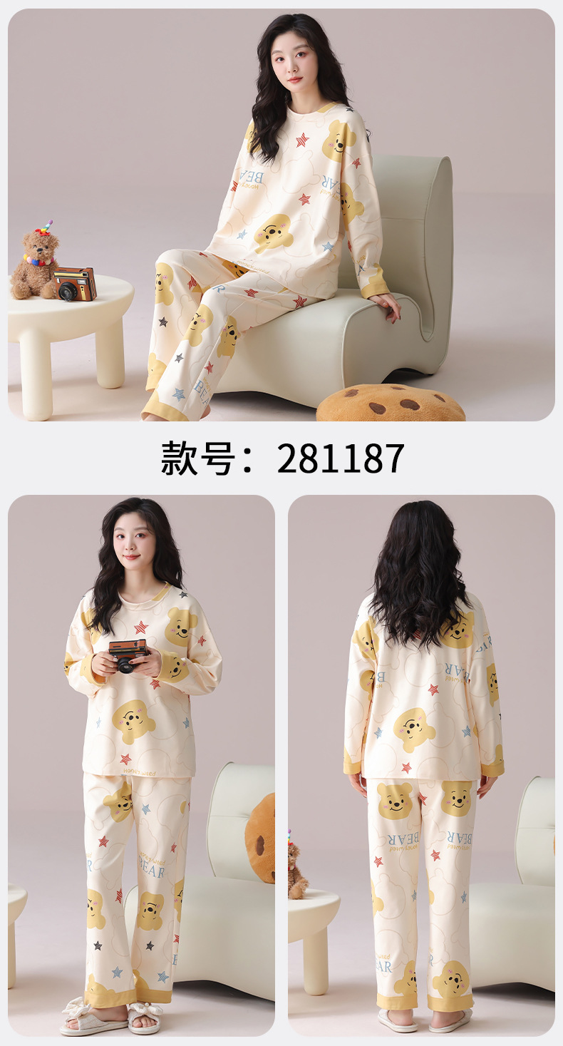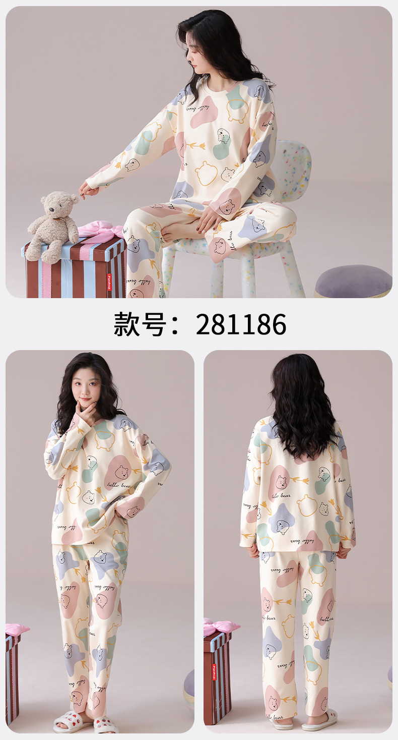 [순수한면] 가슴 패드를 가진 잠옷 여성 봄과 가을 긴 소매 패션 홈 의류 세트 가을과 겨울 귀여운 만화스토어 가기