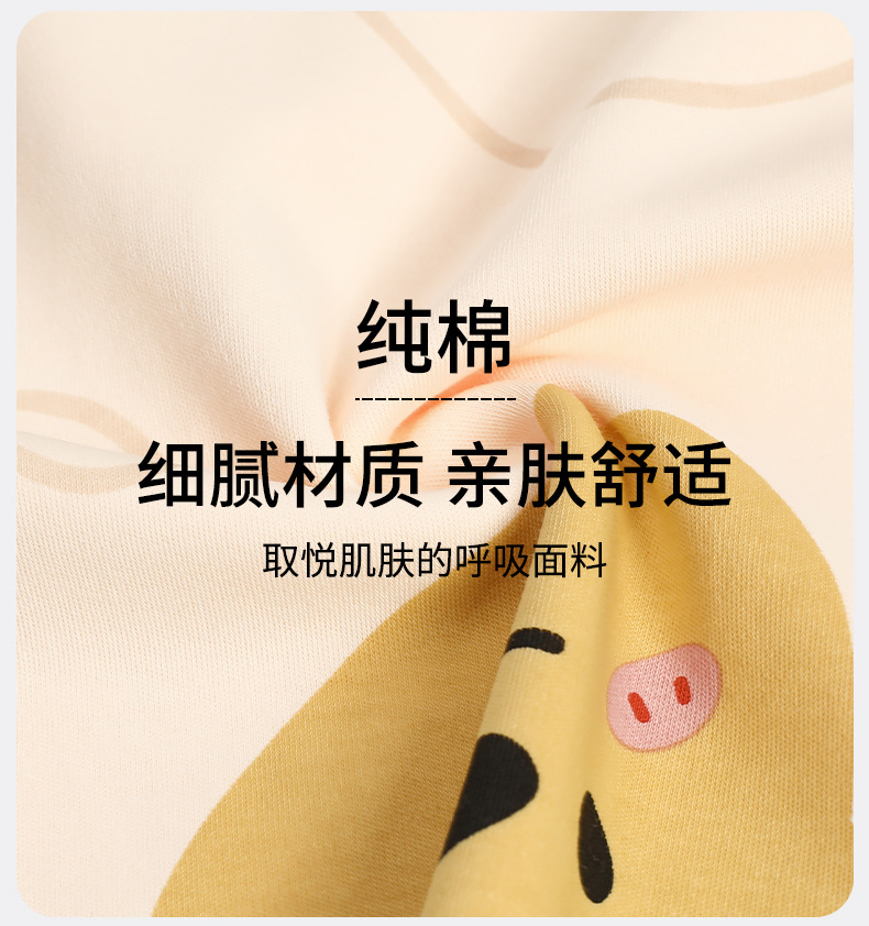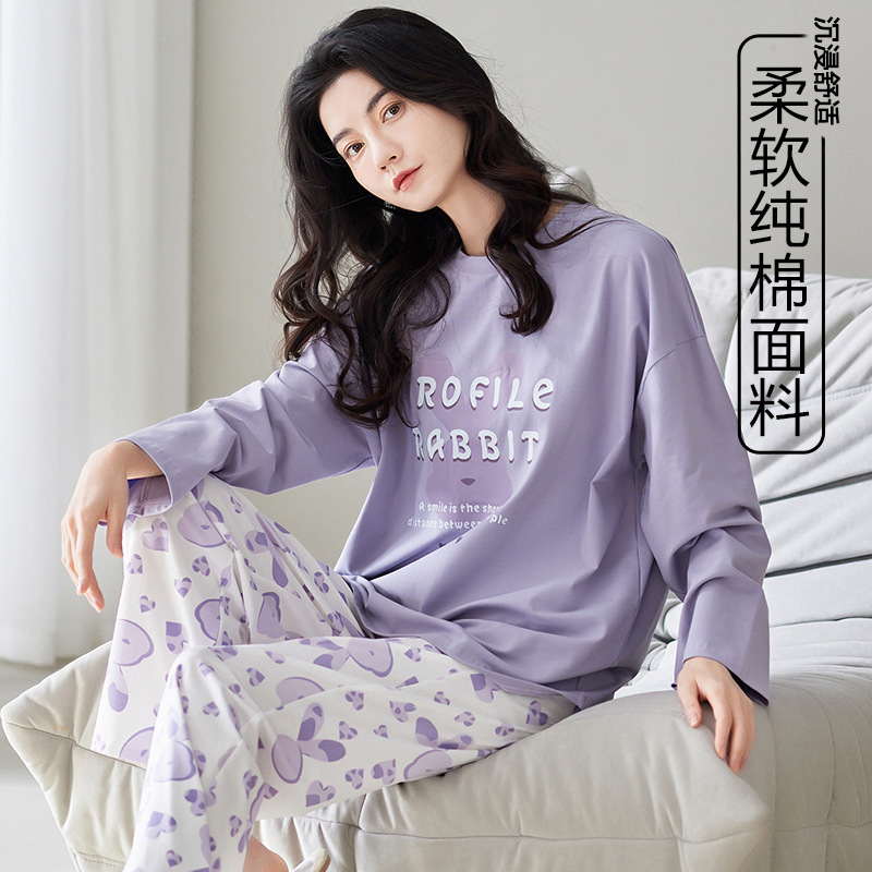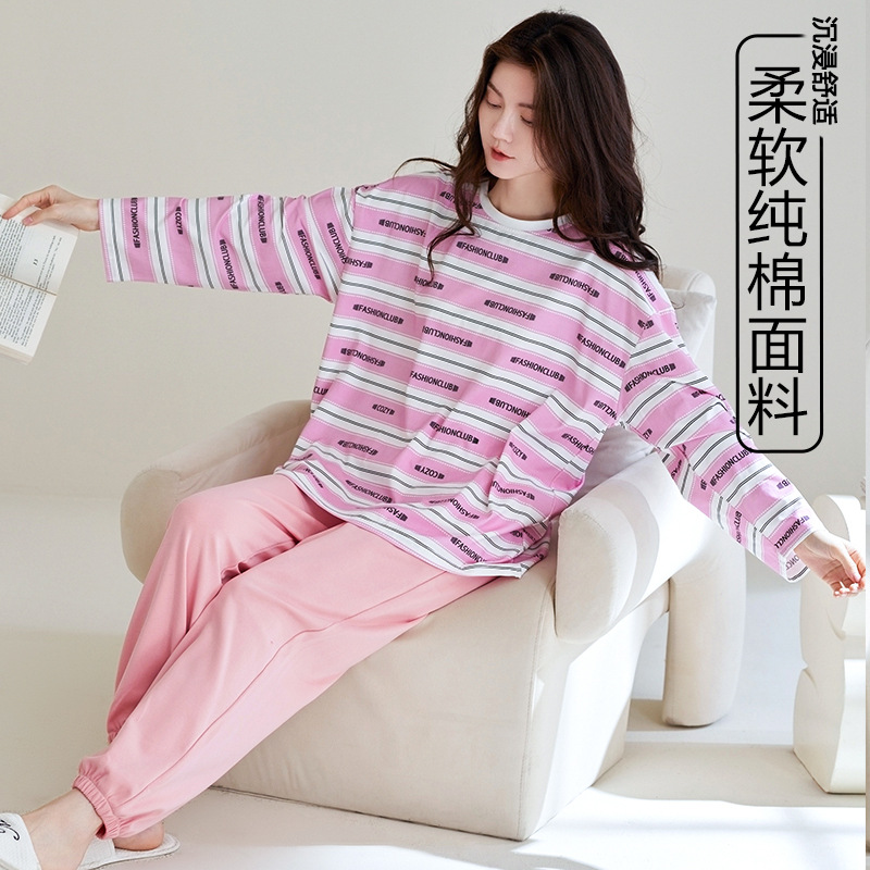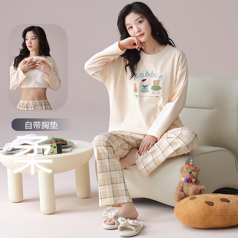 [순수한면] 가슴 패드를 가진 잠옷 여성 봄과 가을 긴 소매 패션 홈 의류 세트 가을과 겨울 귀여운 만화