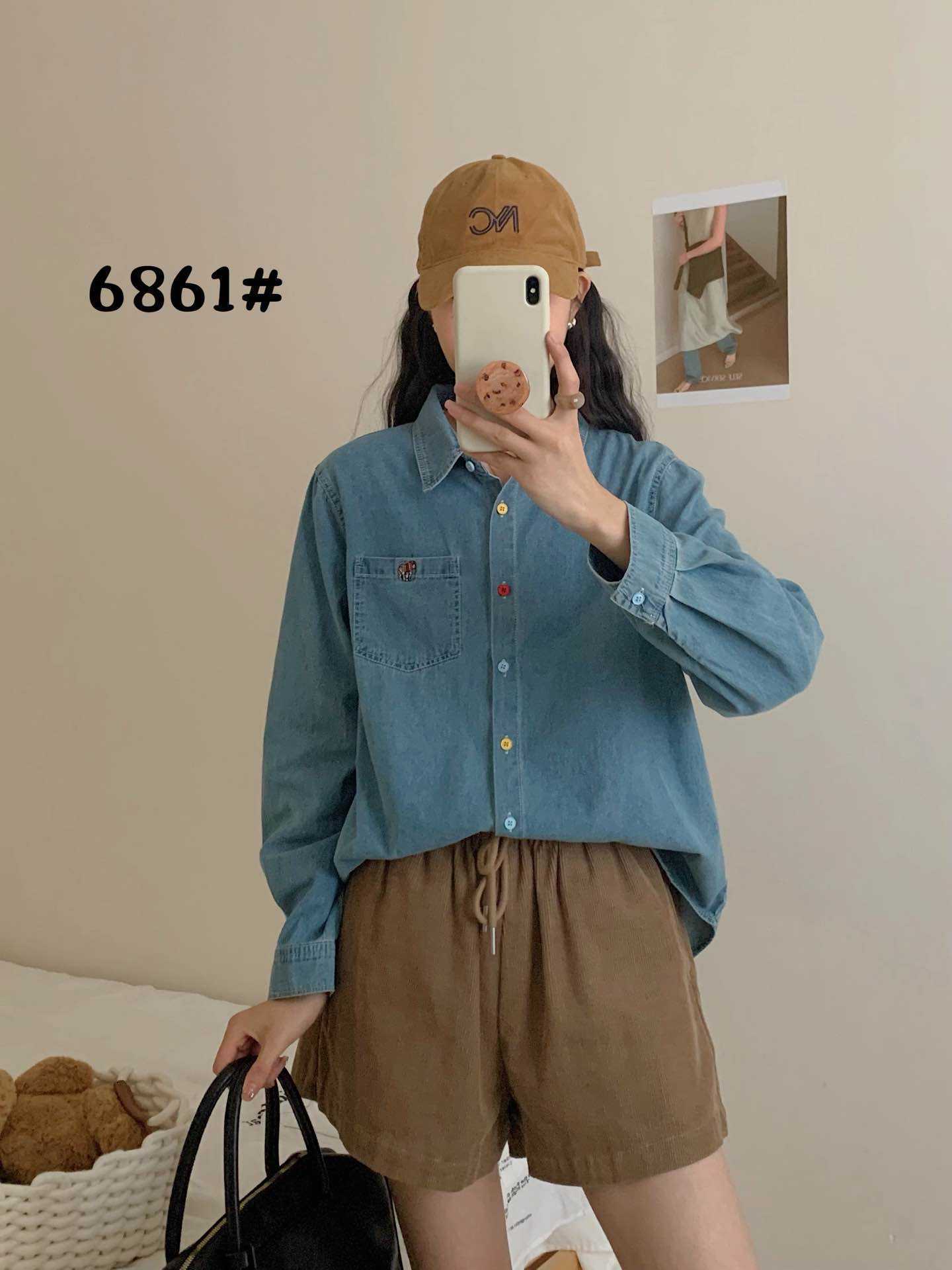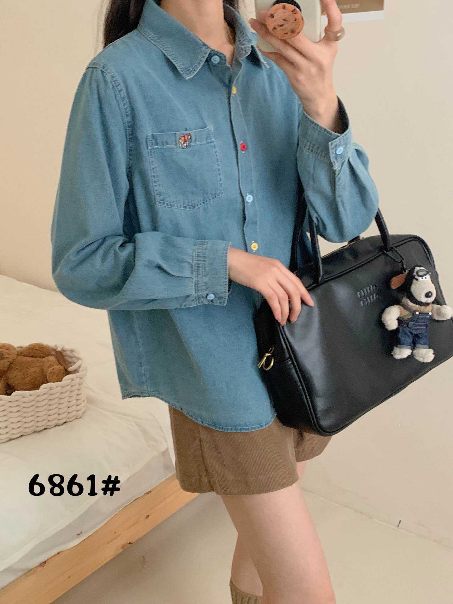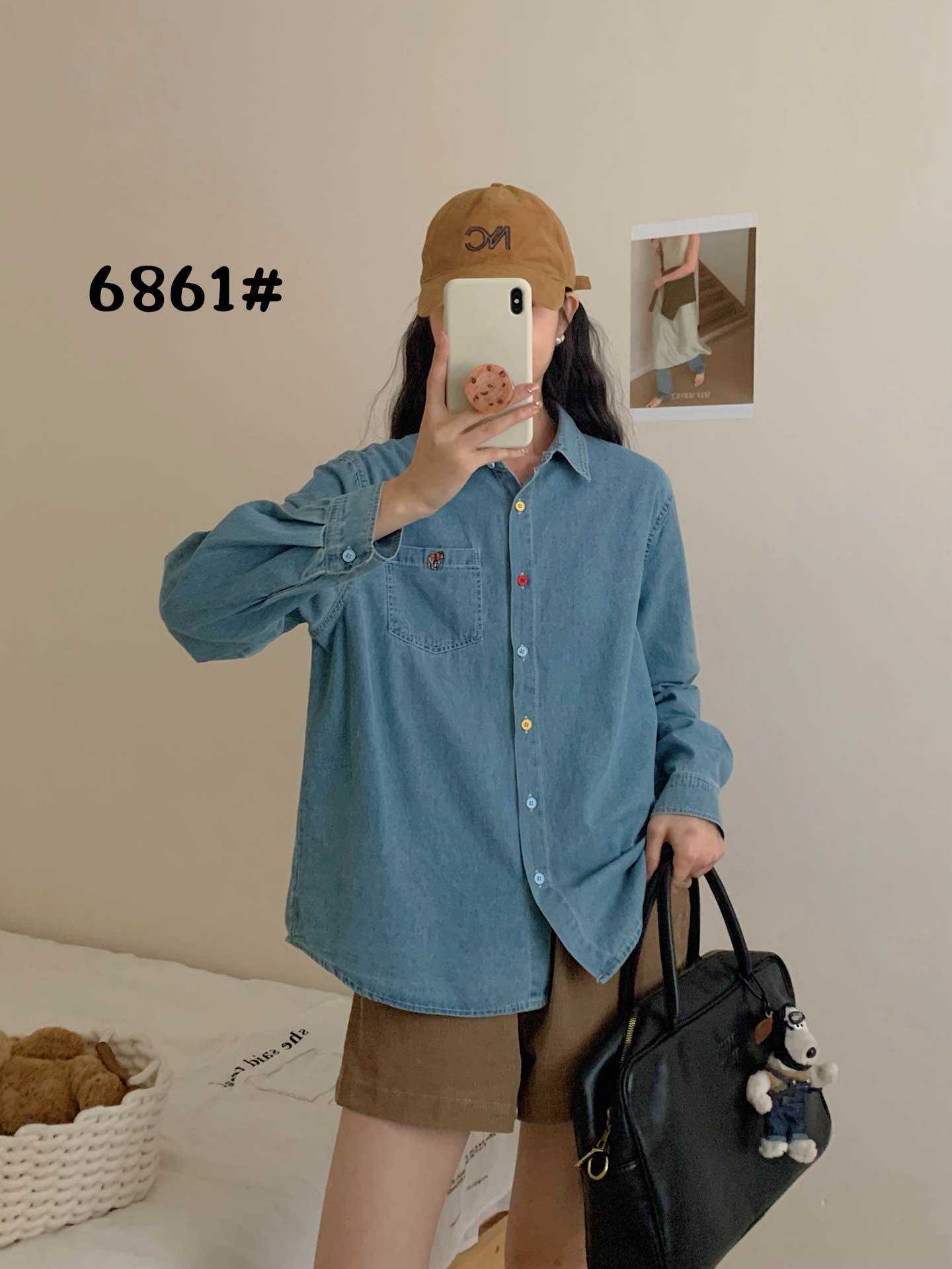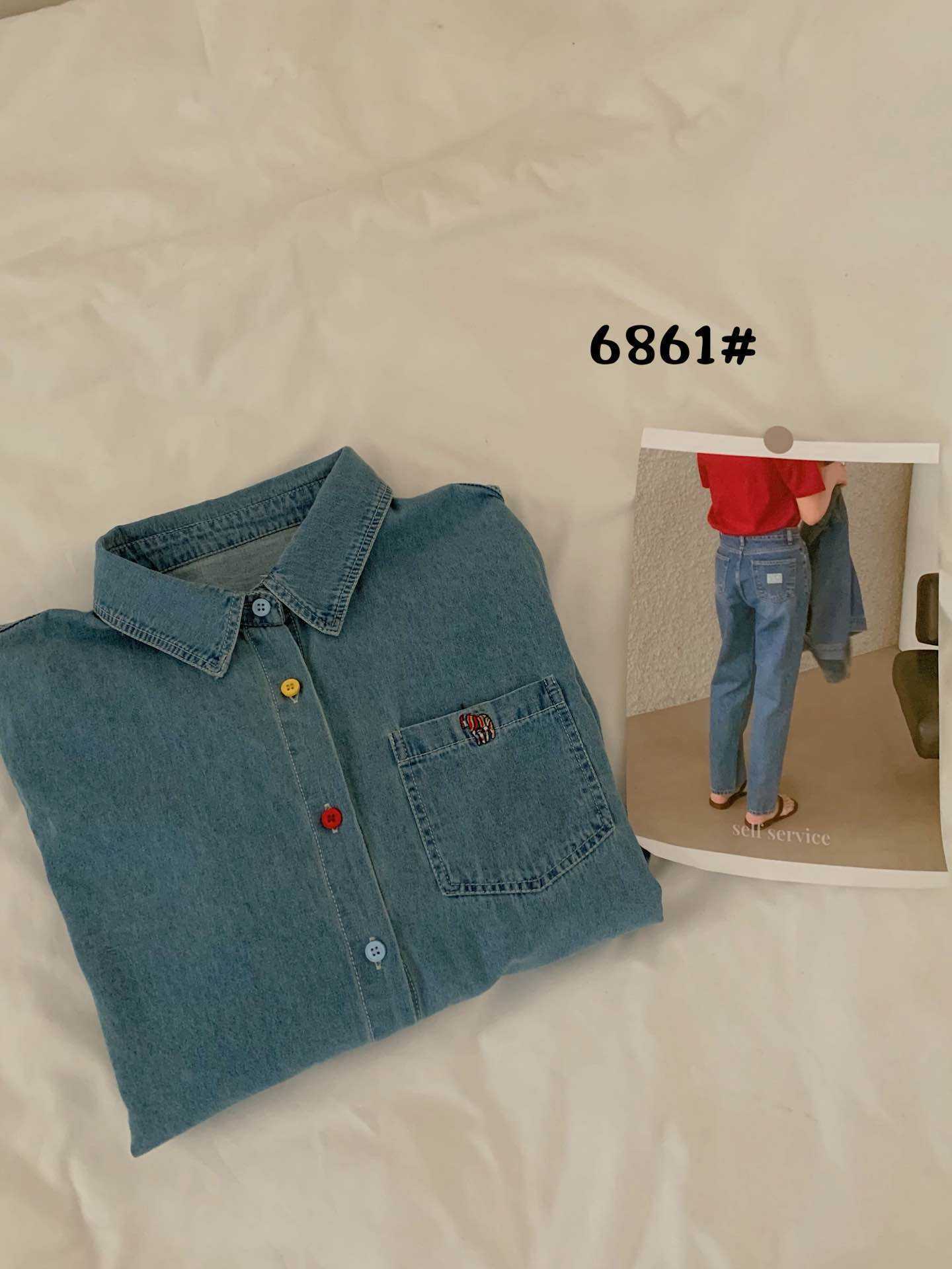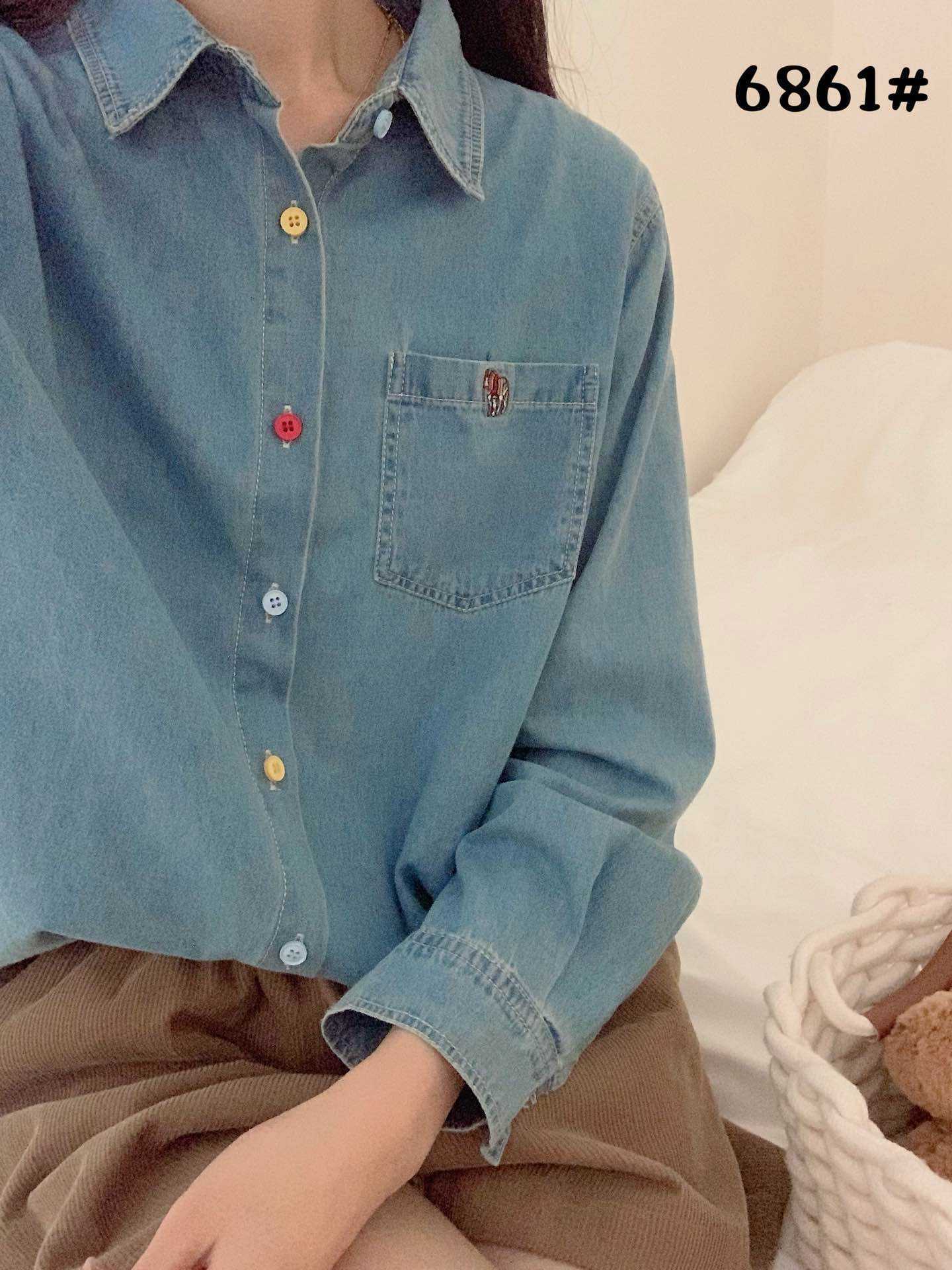 빈티지 세련된 옷깃 싱글 포켓 자수 컬러 버튼 데님 셔츠 여성 봄 새로운 유행 스택 재킷스토어 가기