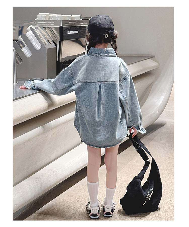 소녀 데님 코트 봄과 가을 2025 새로운 어린이 세련된 세련된 리핑 탑 데님 긴 소매 셔츠스토어 가기