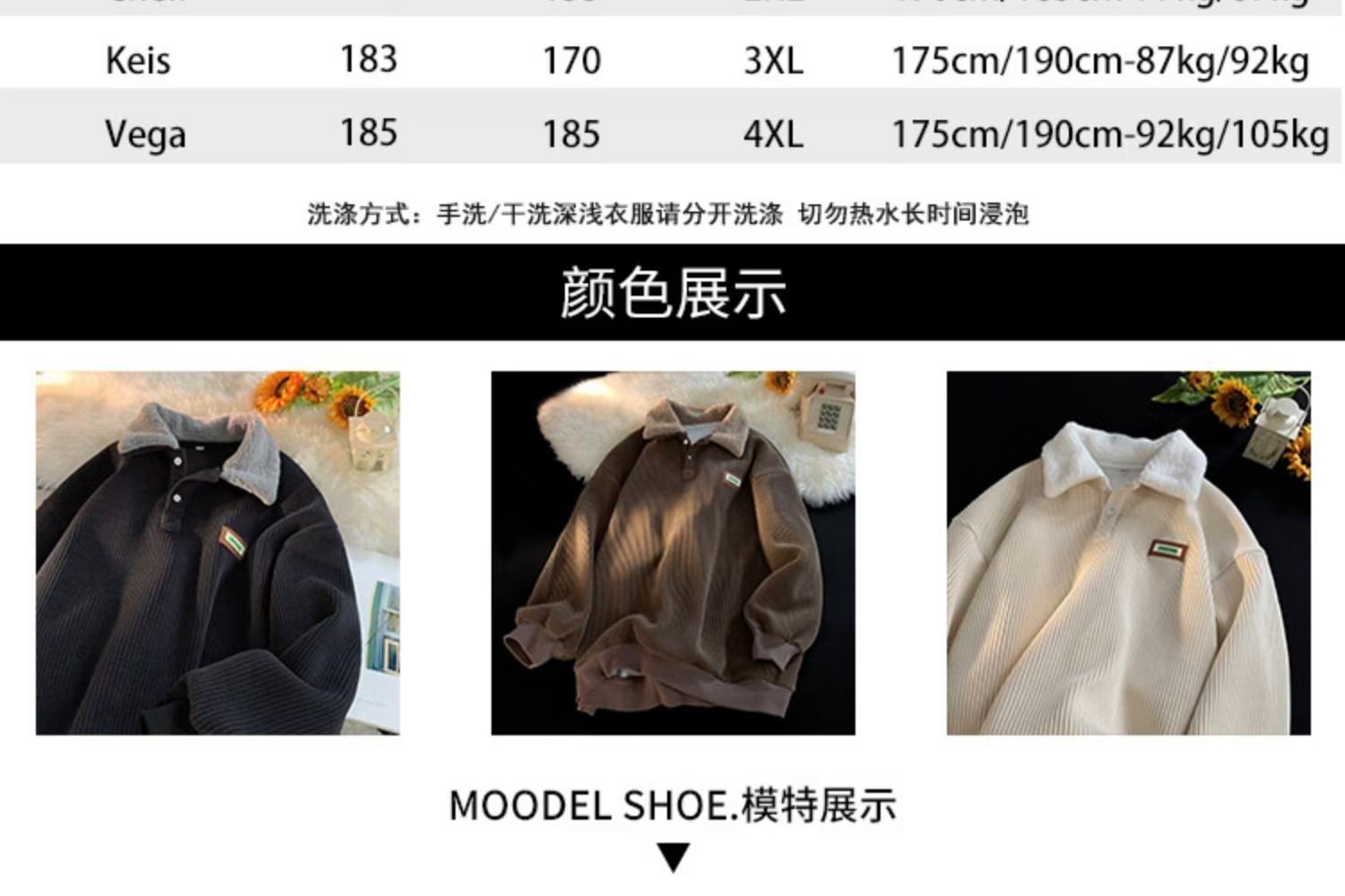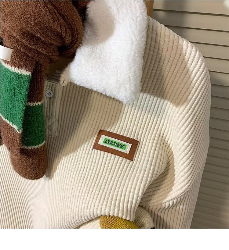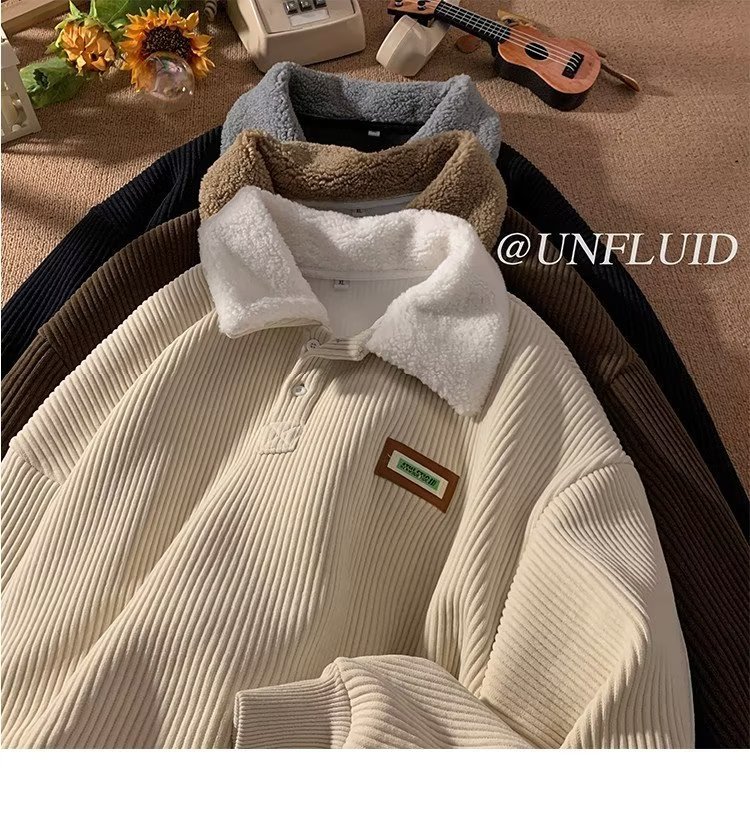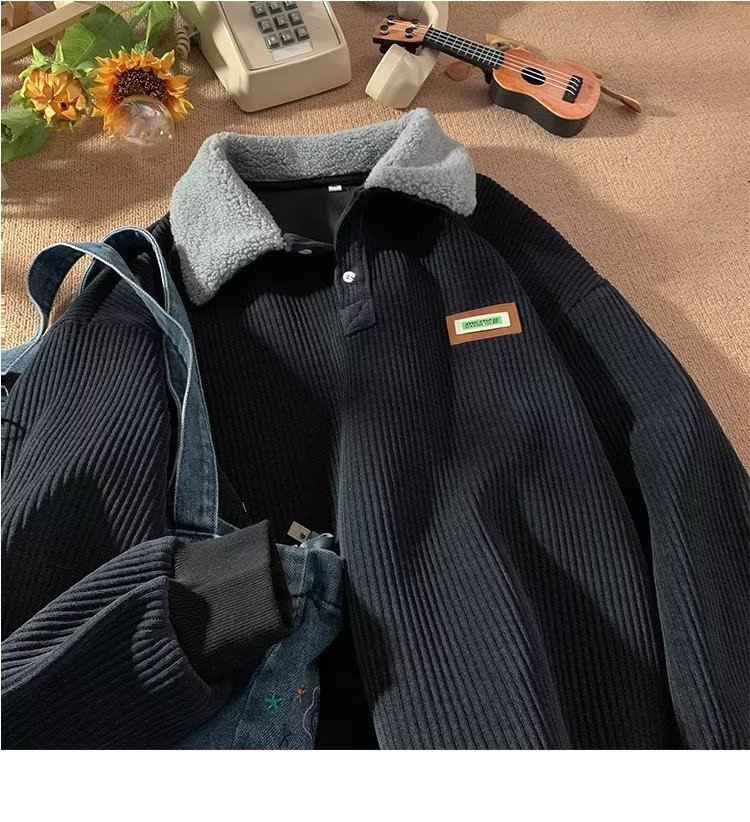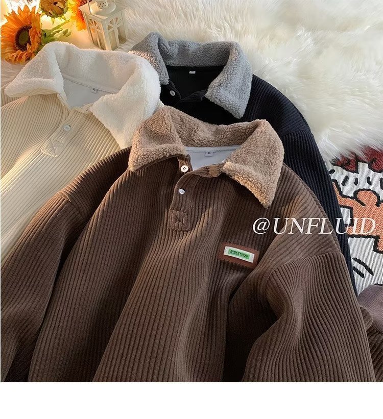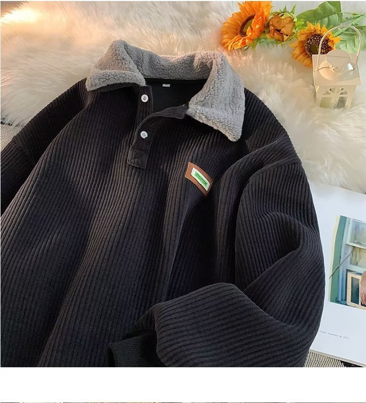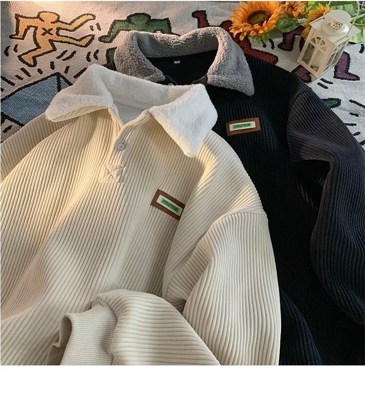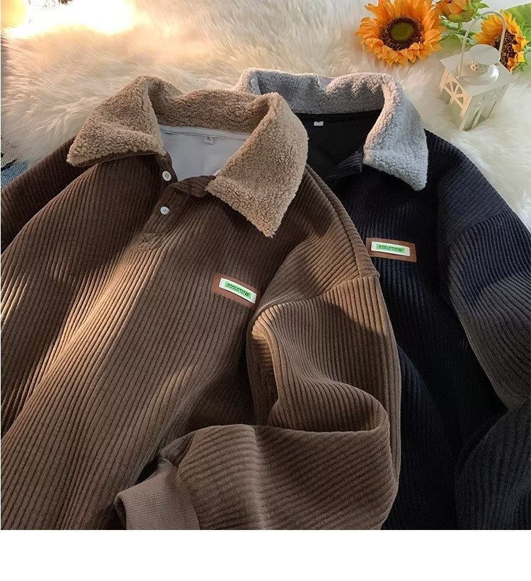 코듀로이 스웨트 셔츠 남자의 가을과 겨울 기모 두꺼운 양고기 울 폴로 칼라 재킷 남자의 겨울 홍콩 스타일 청소년스토어 가기