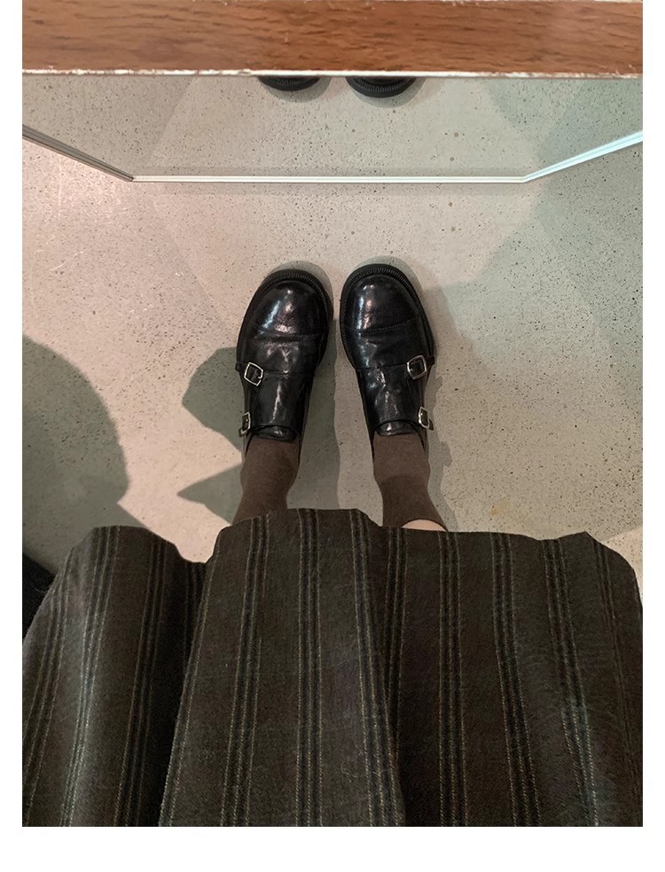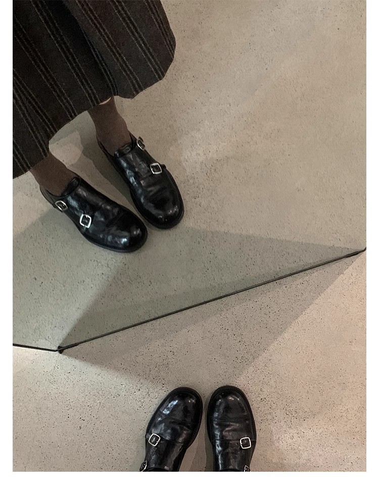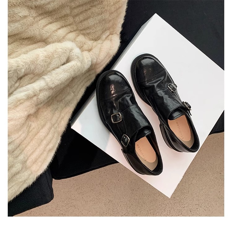 재고 빈티지 프랑스 수축 말 가죽 조각 더블 버클 라운드 발가락 두꺼운 힐 영국 아카데미 스타일 캐주얼 작은 가죽 신발