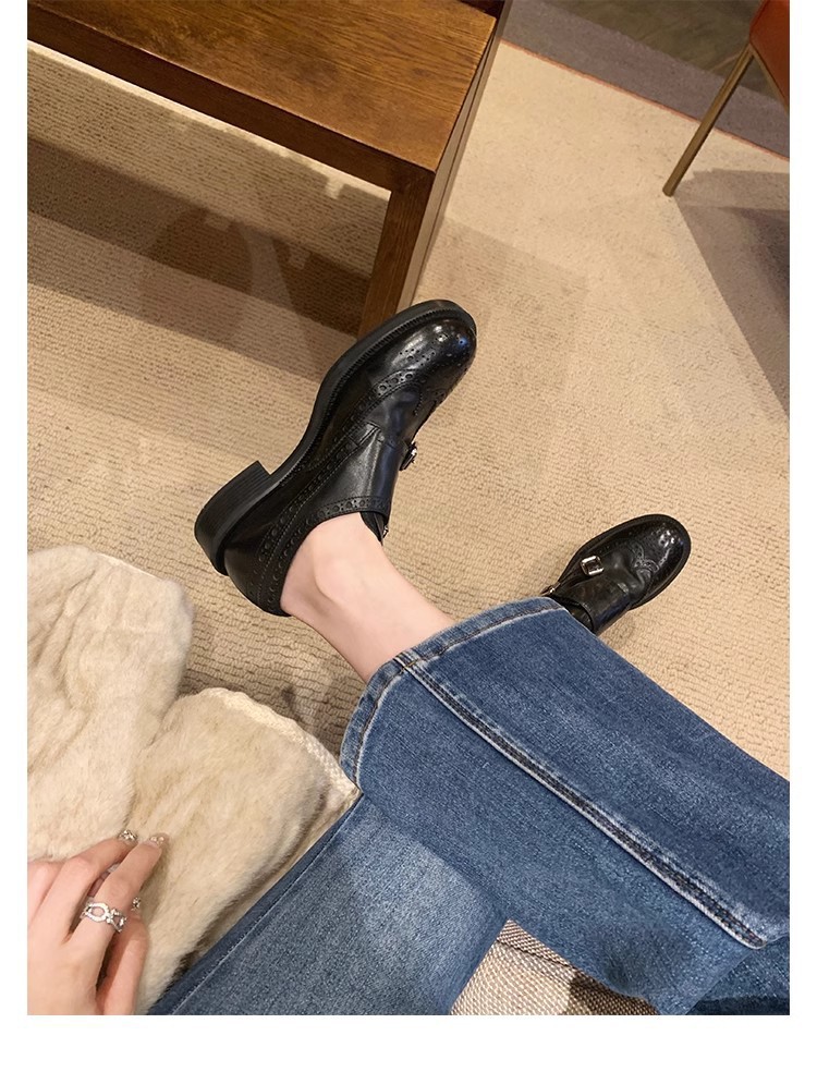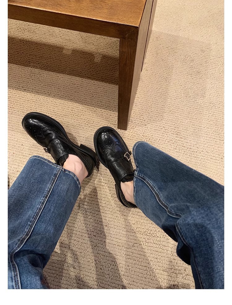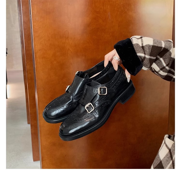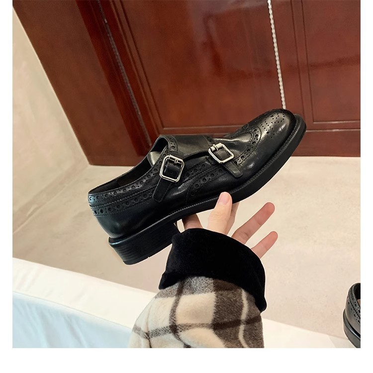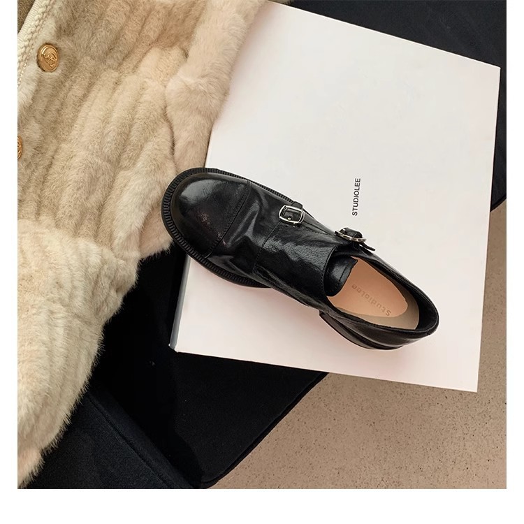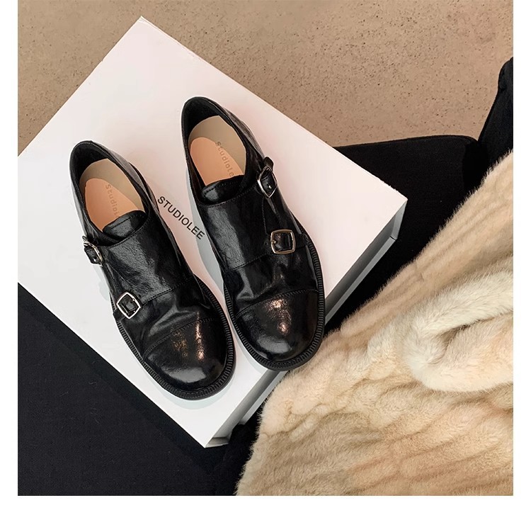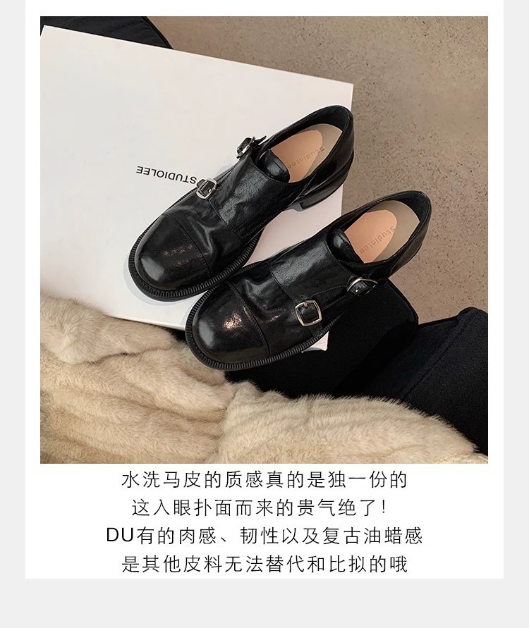 재고 빈티지 프랑스 수축 말 가죽 조각 더블 버클 라운드 발가락 두꺼운 힐 영국 아카데미 스타일 캐주얼 작은 가죽 신발스토어 가기