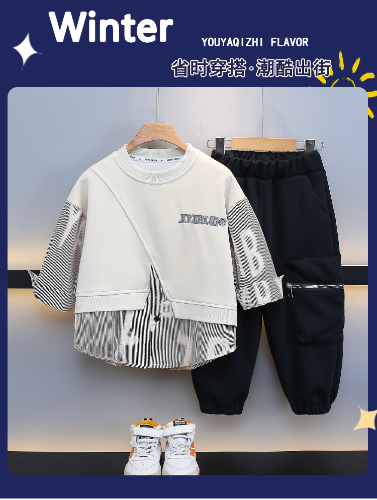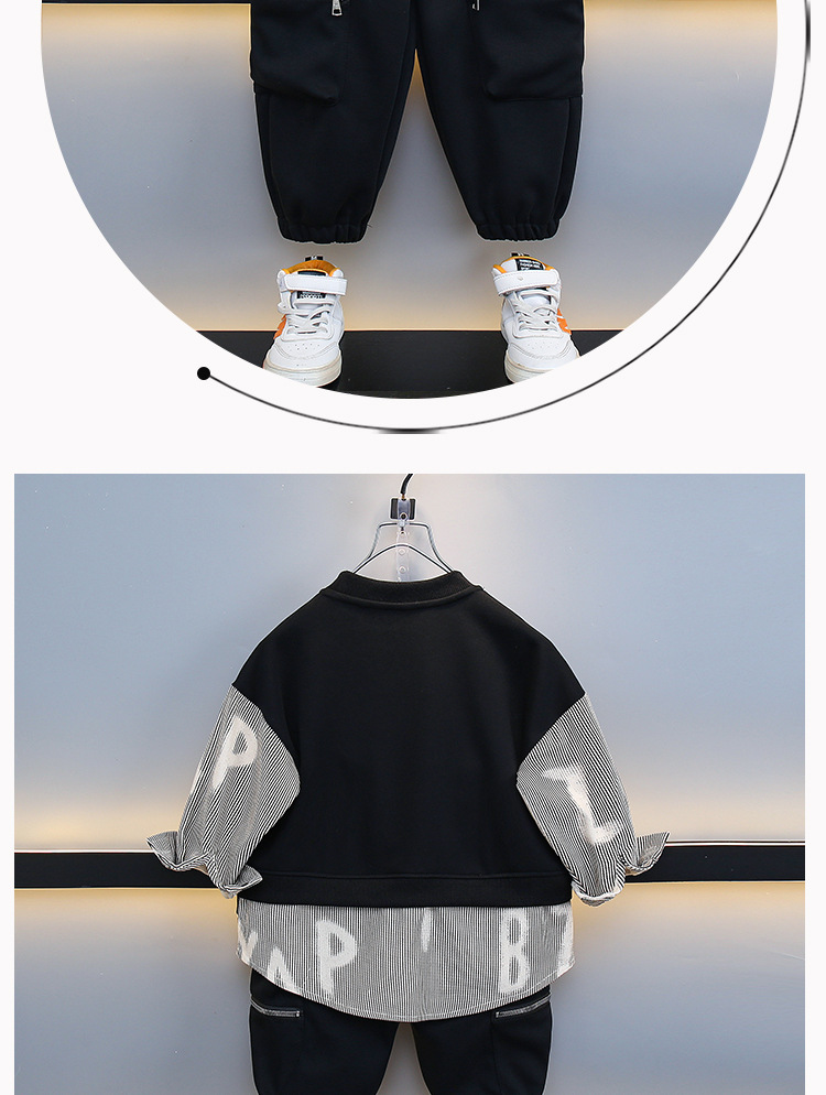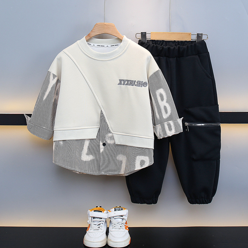 소년 봄 더블 밀크 실크 멋진 잘 생긴 가짜 투피스 스트라이프 스티칭 세트 2025 새로운 외국 스타일 레저 세트 조수