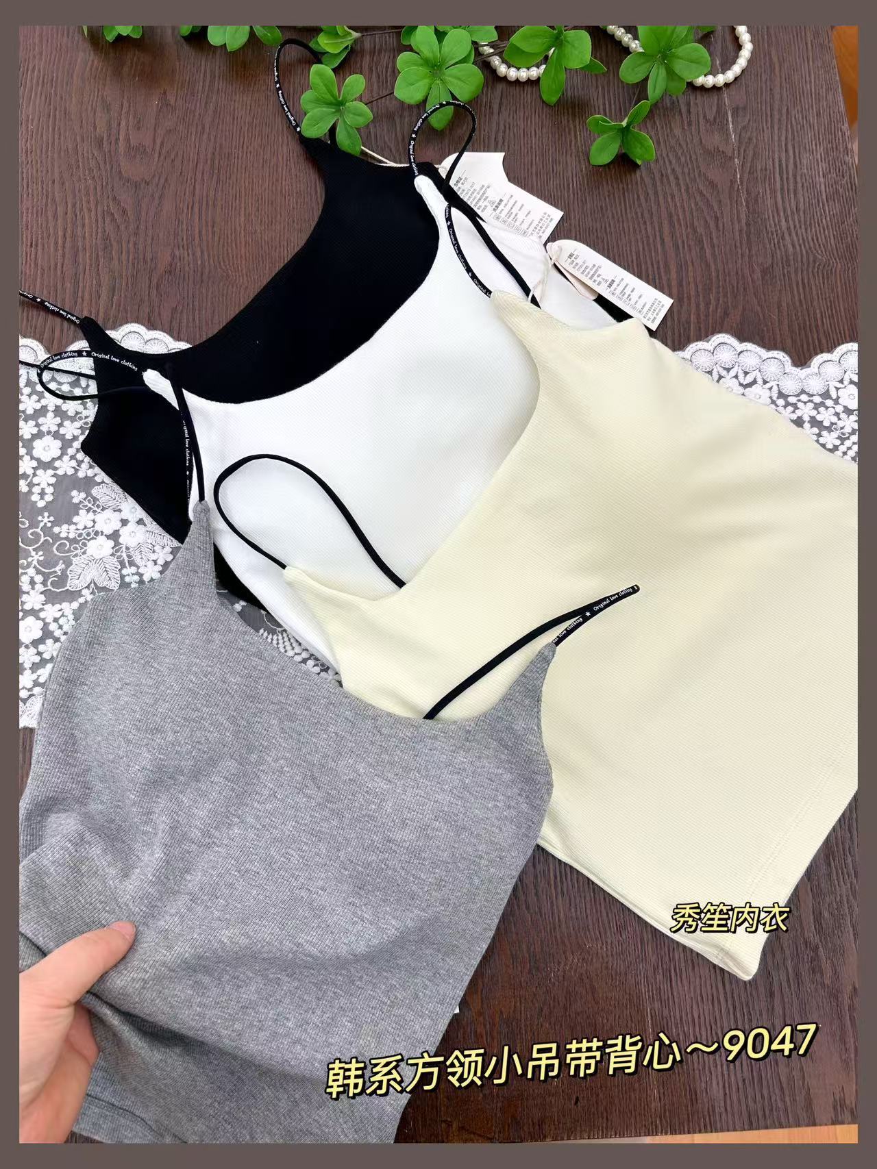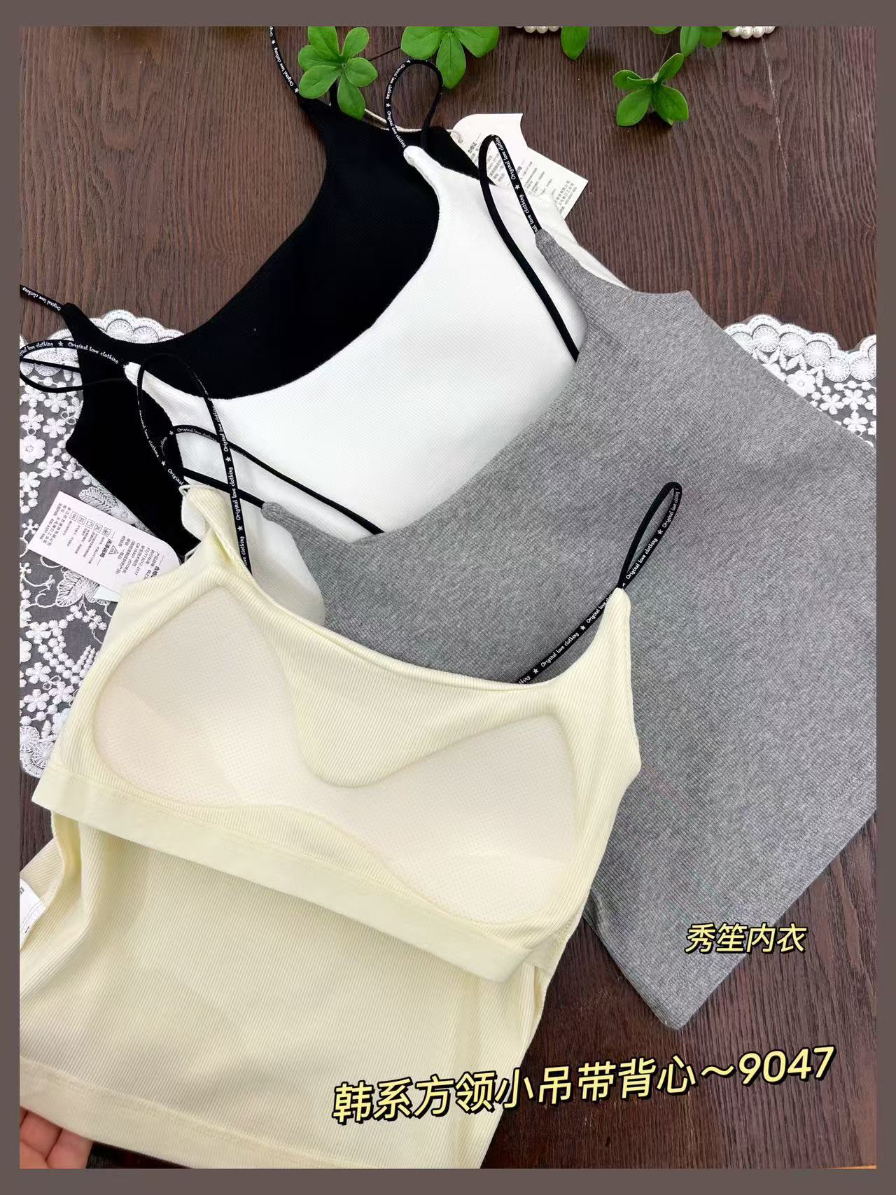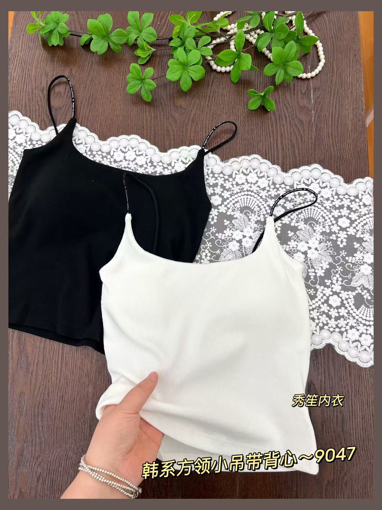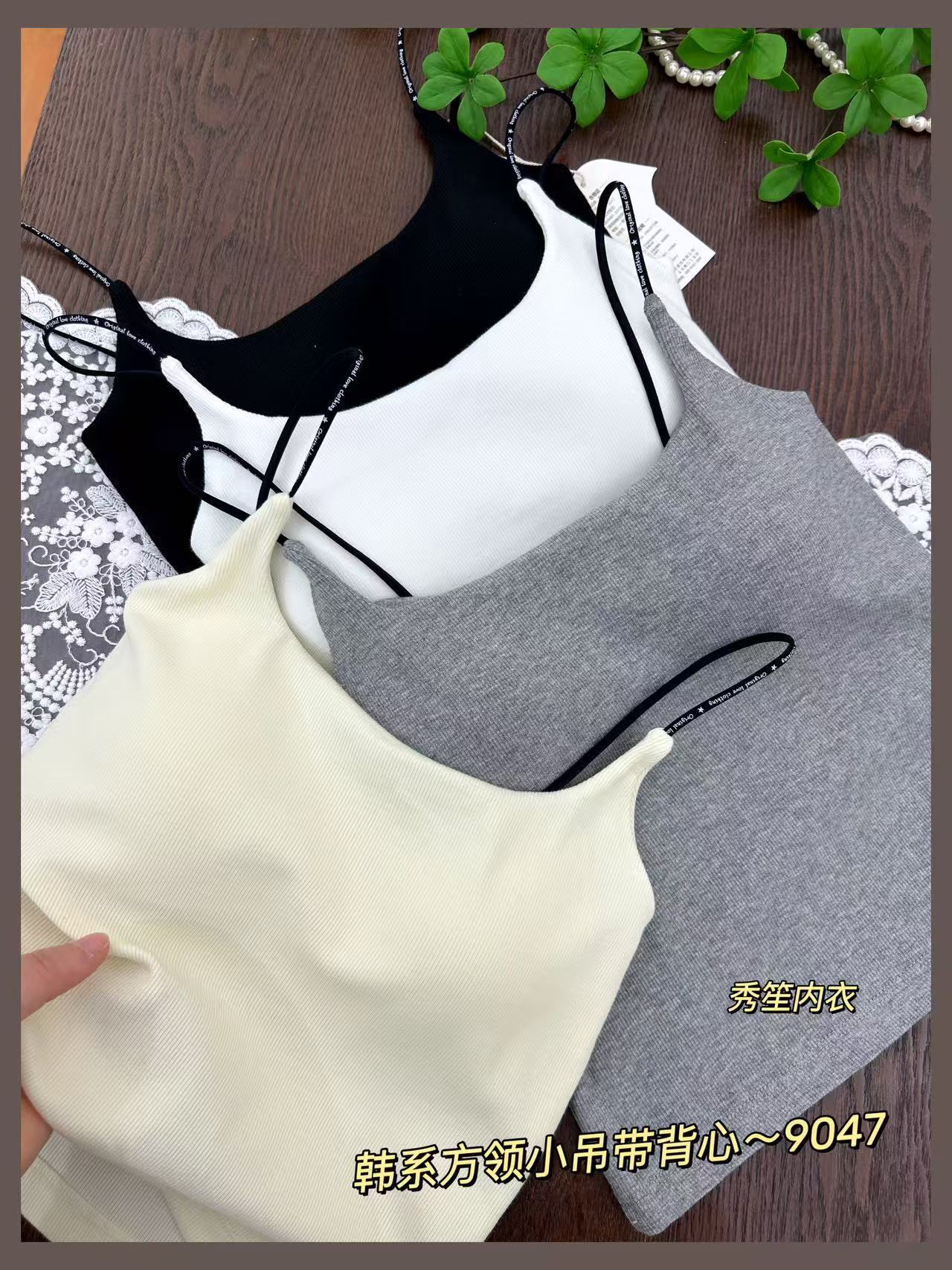 봄과 여름 새로운 9047 한국식 스퀘어 넥 스레드 작은 슬링 대조 레이스 고정 가슴 패드 슬링 조끼