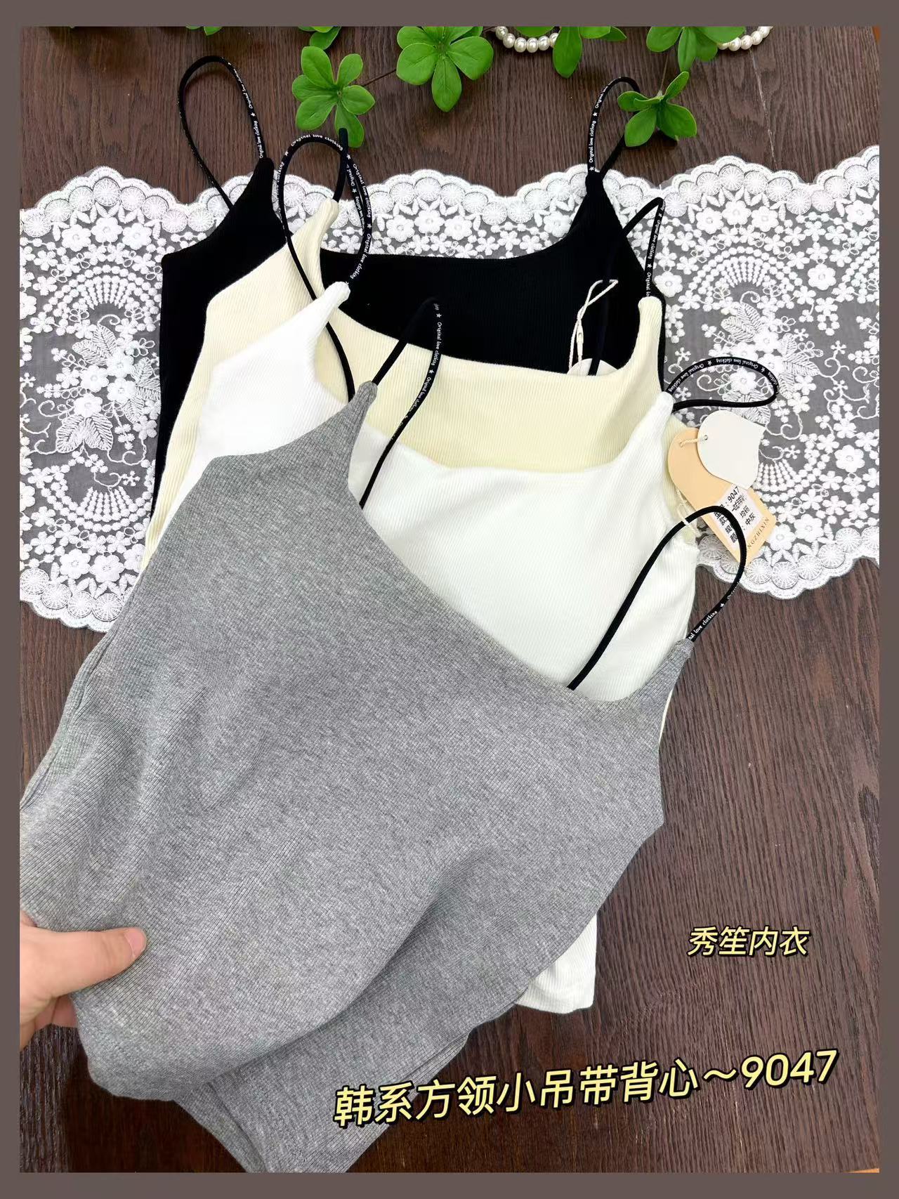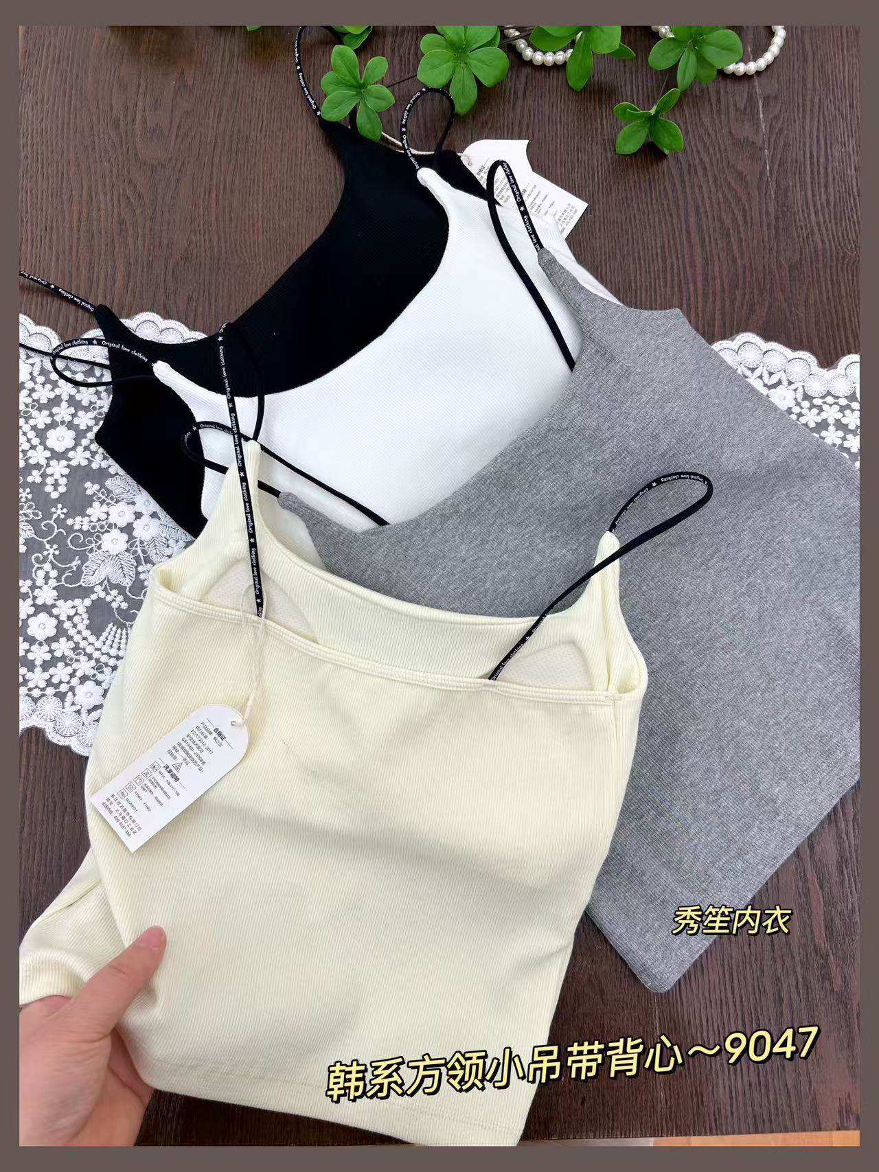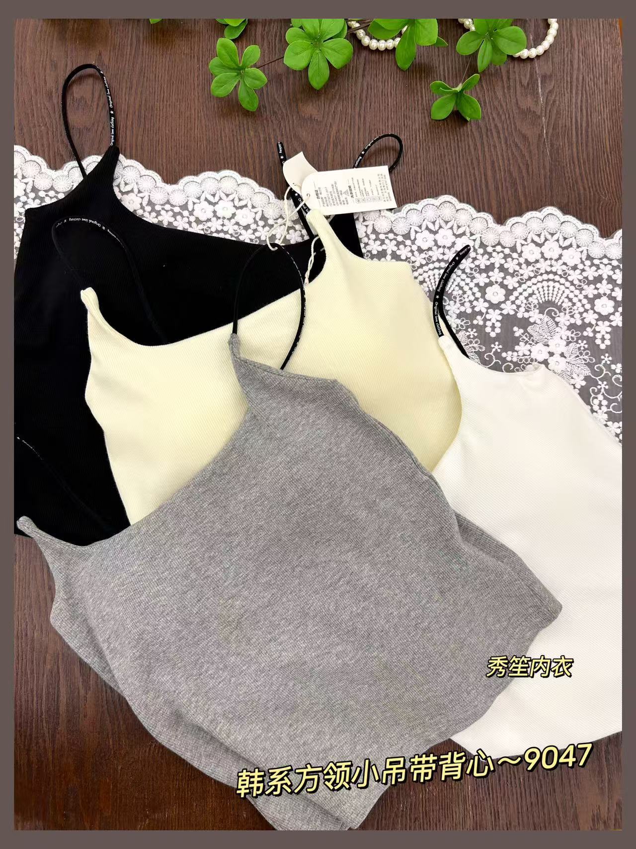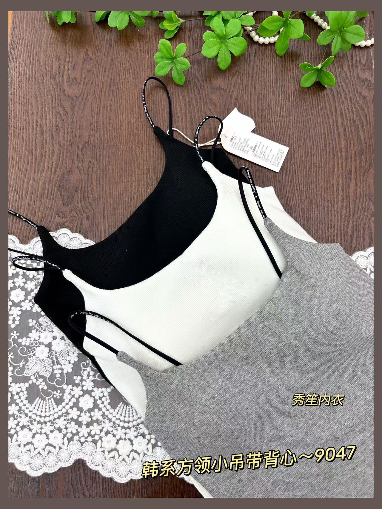 봄과 여름 새로운 9047 한국식 스퀘어 넥 스레드 작은 슬링 대조 레이스 고정 가슴 패드 슬링 조끼