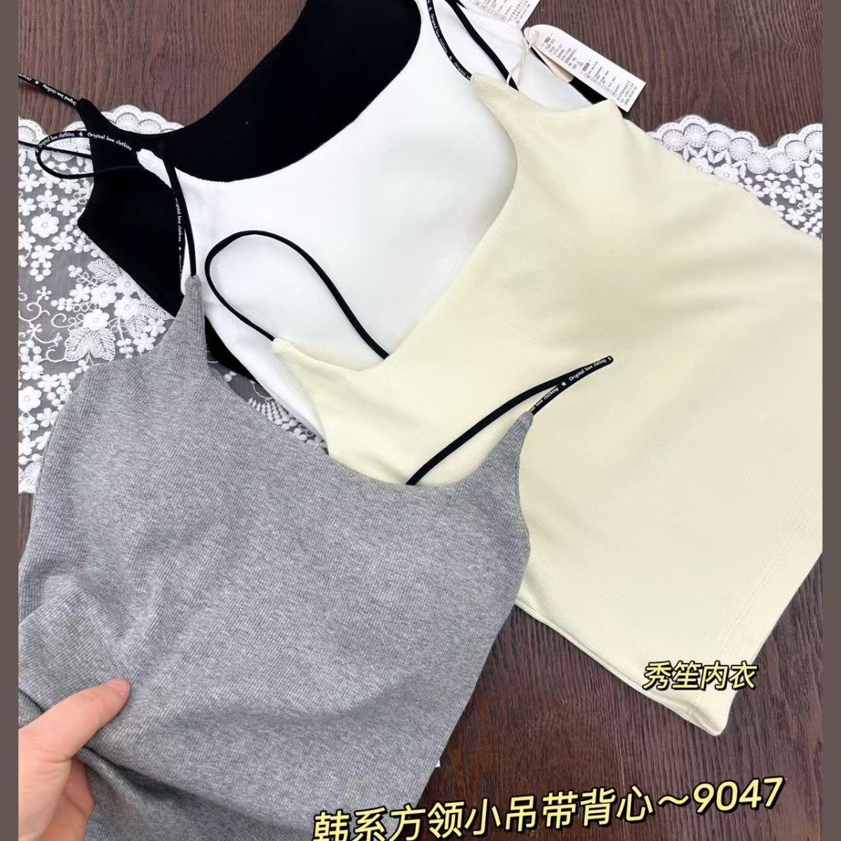 봄과 여름 새로운 9047 한국식 스퀘어 넥 스레드 작은 슬링 대조 레이스 고정 가슴 패드 슬링 조끼스토어 가기