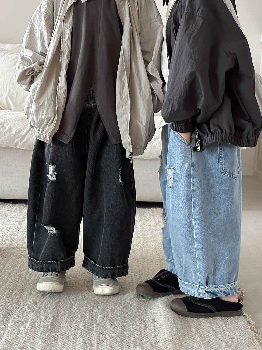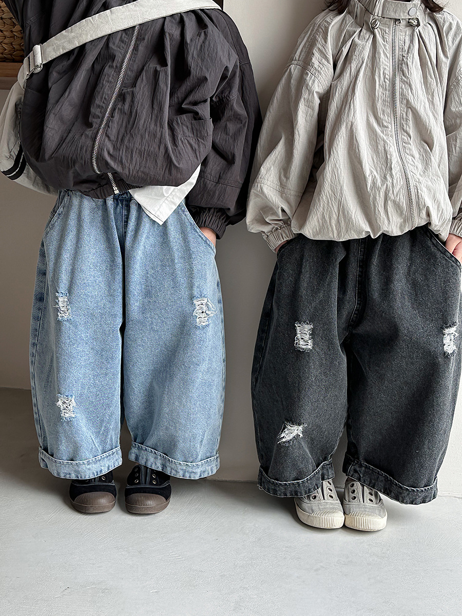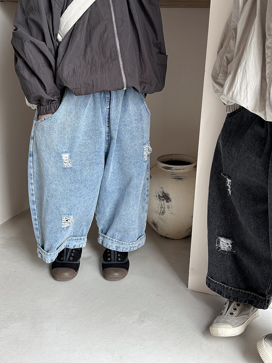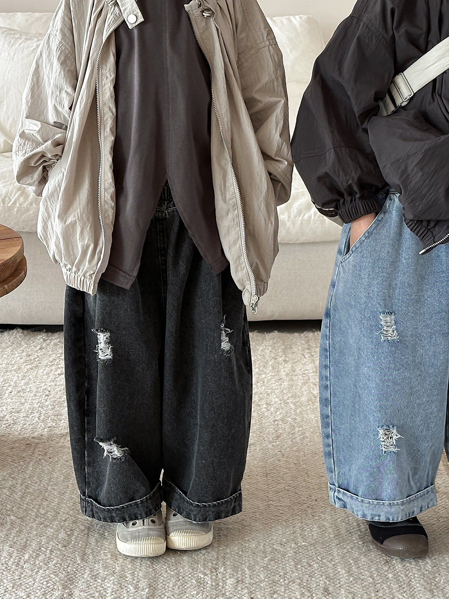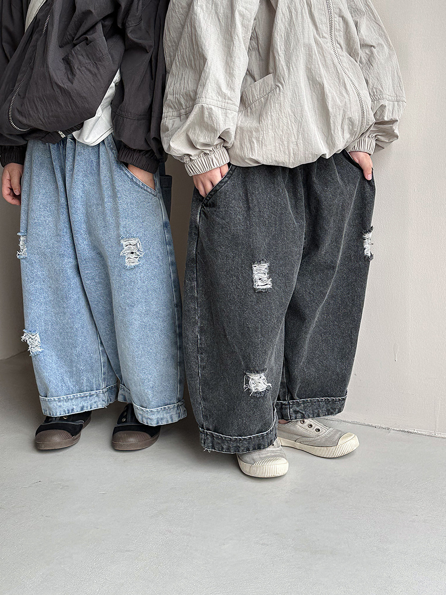Jiaye Children's Products 2025 남성과 여성을 위한 새로운 가을 찢어진 청바지, 느슨한 올드 와이드 레그 팬츠스토어 가기