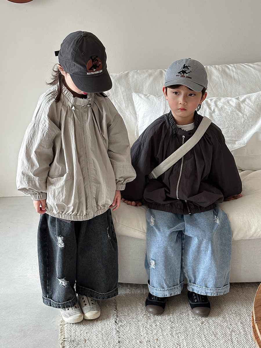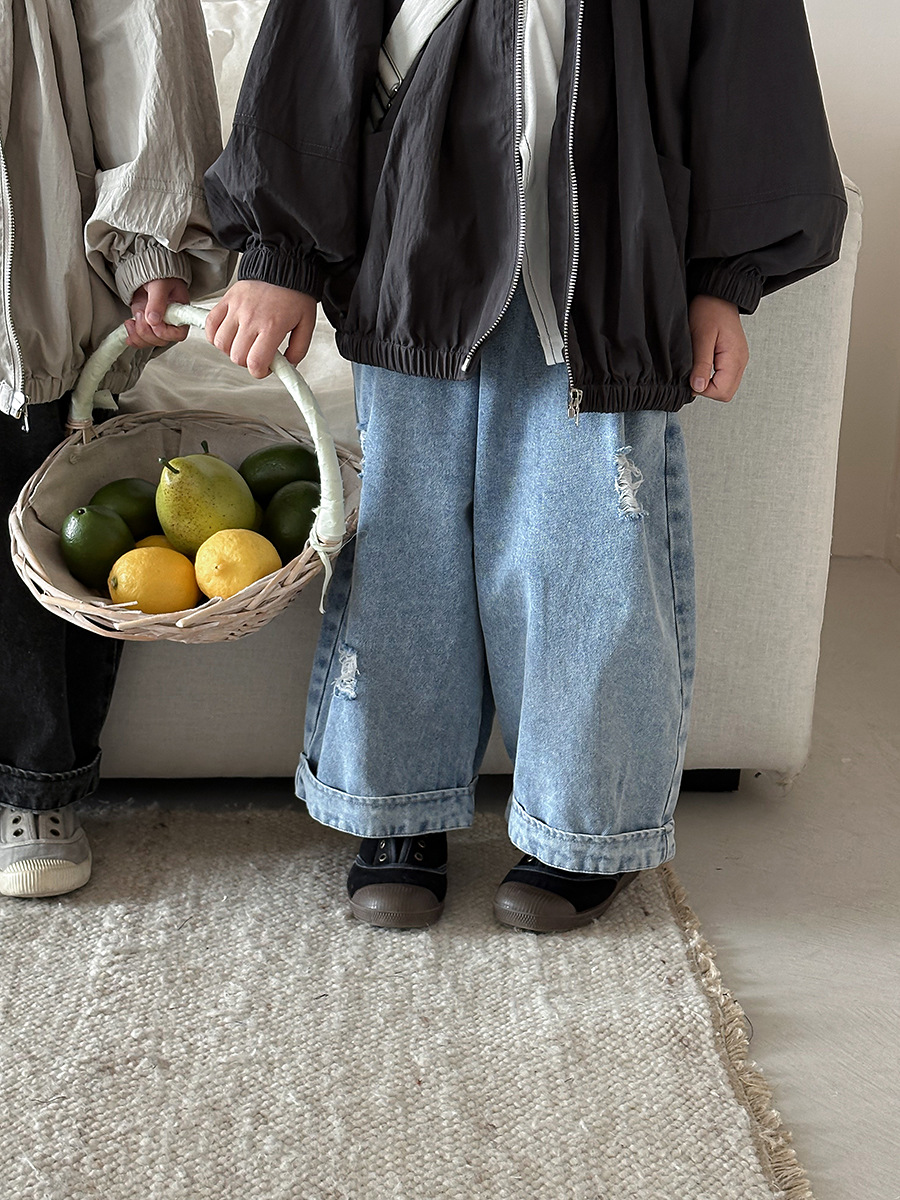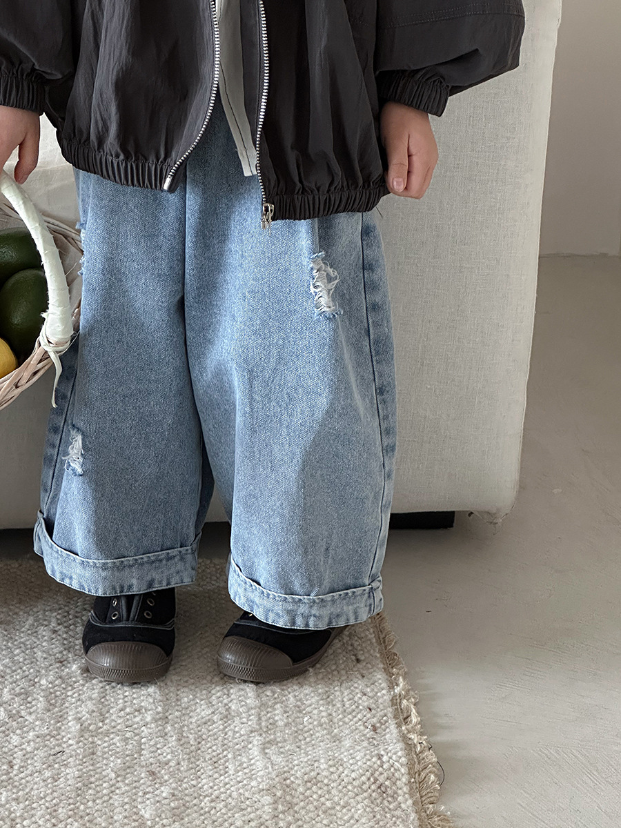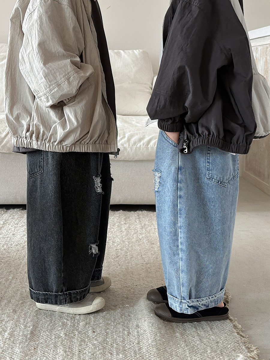 Jiaye Children's Products 2025 남성과 여성을 위한 새로운 가을 찢어진 청바지, 느슨한 올드 와이드 레그 팬츠스토어 가기