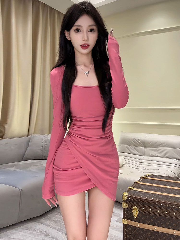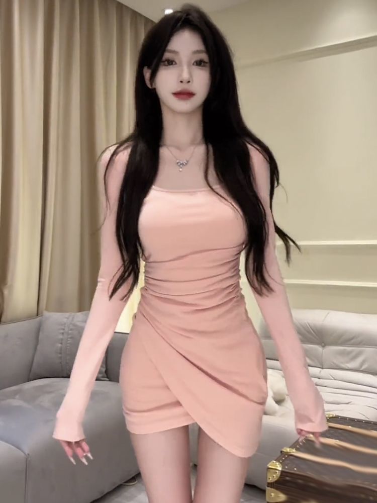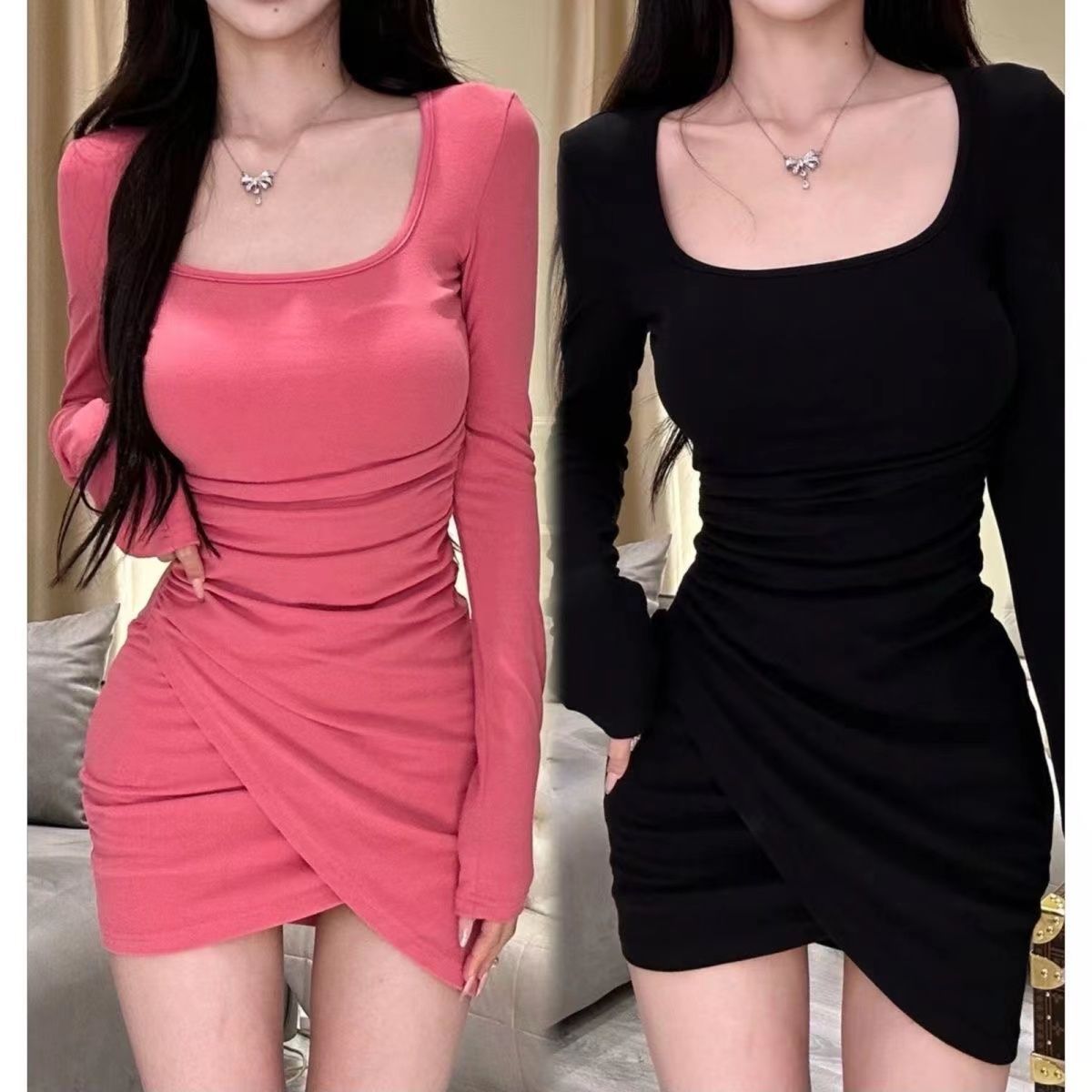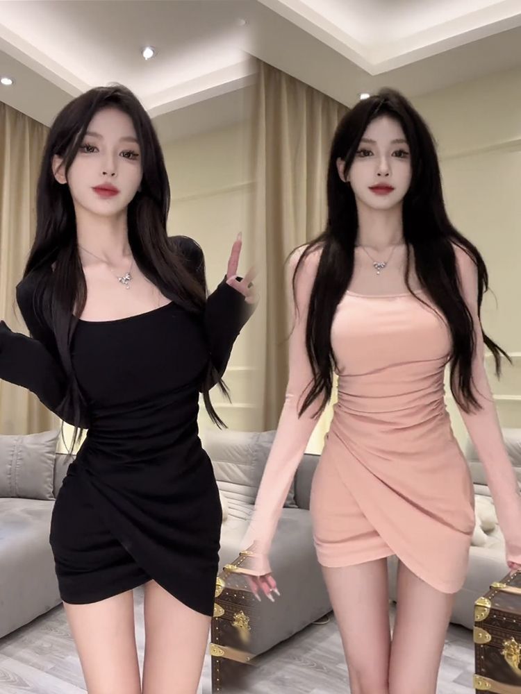 순수한 욕망 광장 칼라 긴 소매 원피스 여성의 봄과 가을 원피스 세련된 섹시한 꽉 엉덩이 스커트 뜨거운 소녀 검은 치마스토어 가기