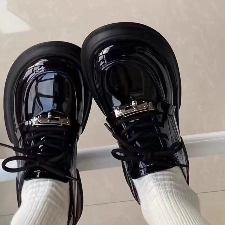 두꺼운 단독 높이 증가 작은 가죽 신발 여성 영국 스타일 2025 새로운 봄 레트로 올매치 청키 힐 레이스 업 Lefu 싱글 레이어 신발스토어 가기