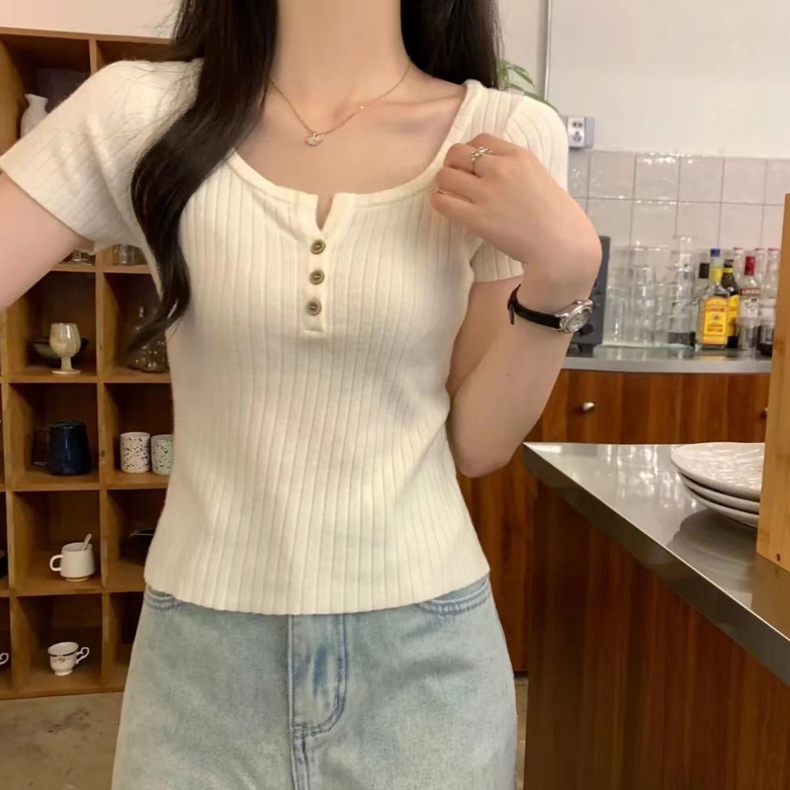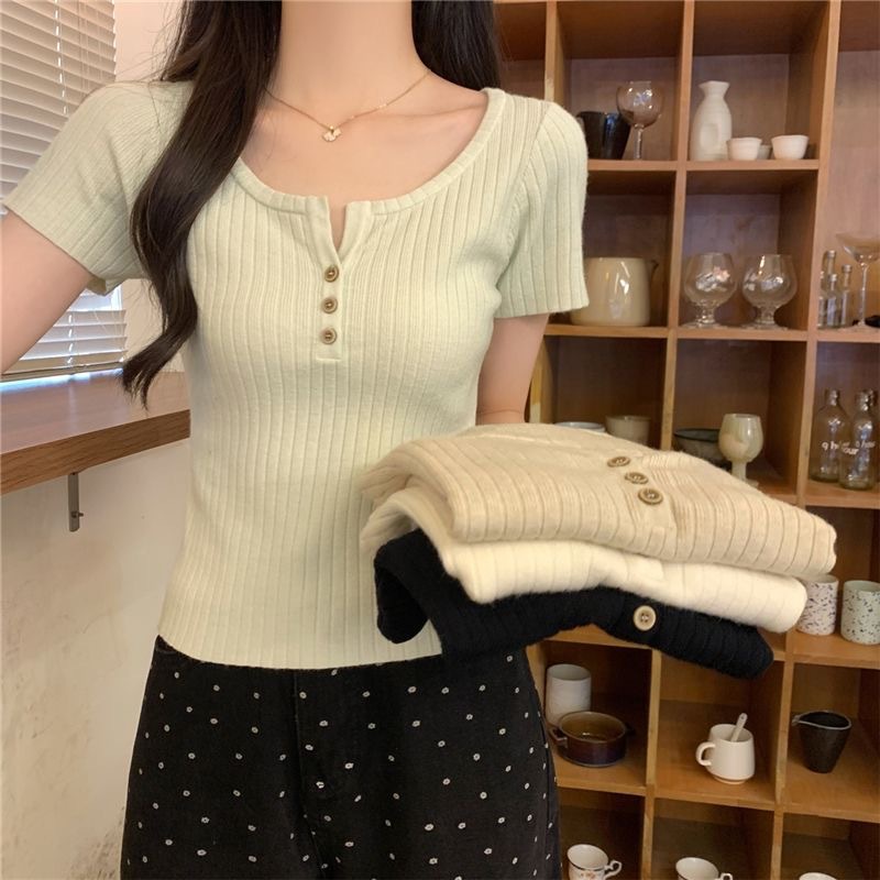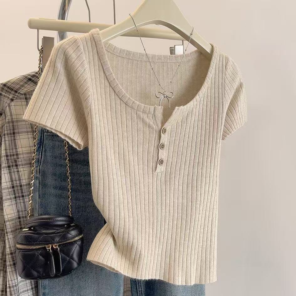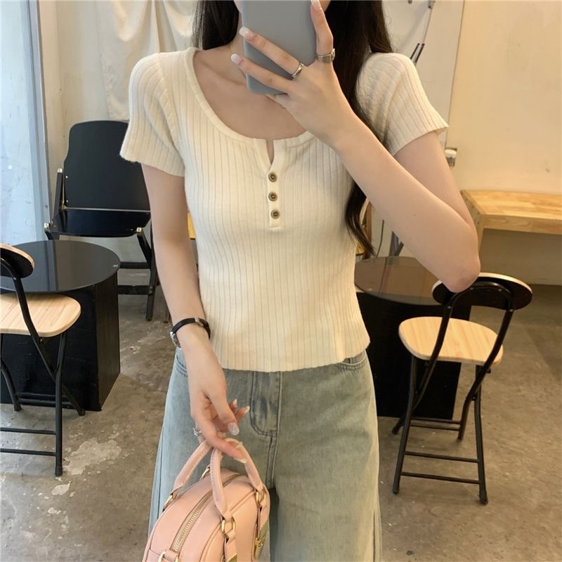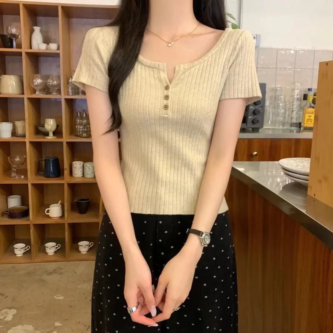 여름 프랑스 스타일 U-목 쇄골 아이스 실크 니트 반팔 티셔츠 여성용 하이 엔드 슬림-핏 어깨베이스 탑스토어 가기