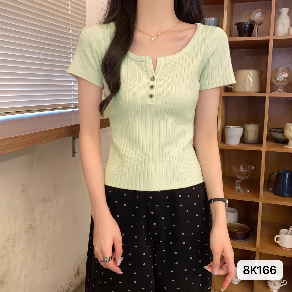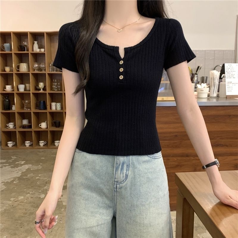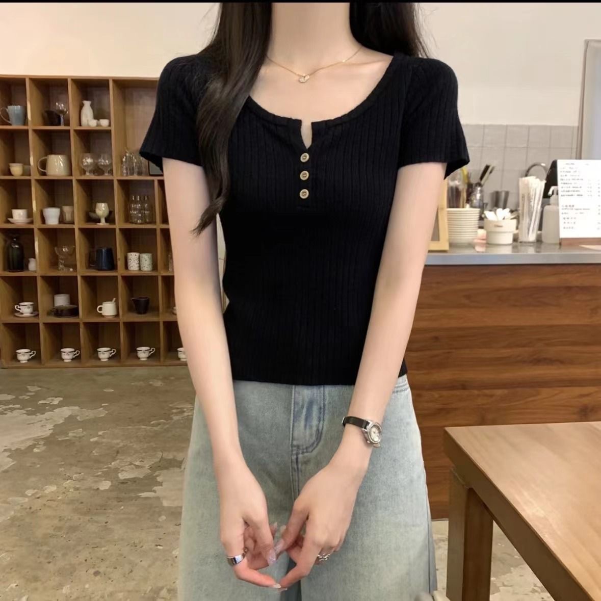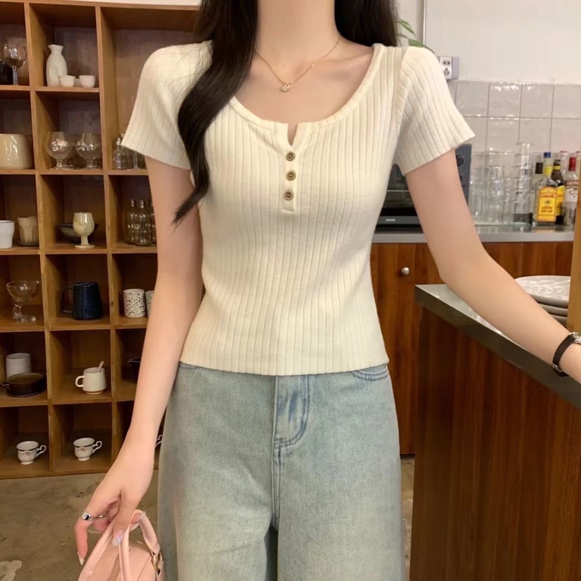 여름 프랑스 스타일 U-목 쇄골 아이스 실크 니트 반팔 티셔츠 여성용 하이 엔드 슬림-핏 어깨베이스 탑스토어 가기
