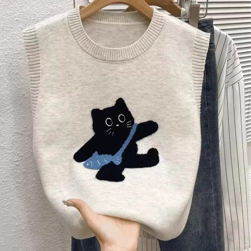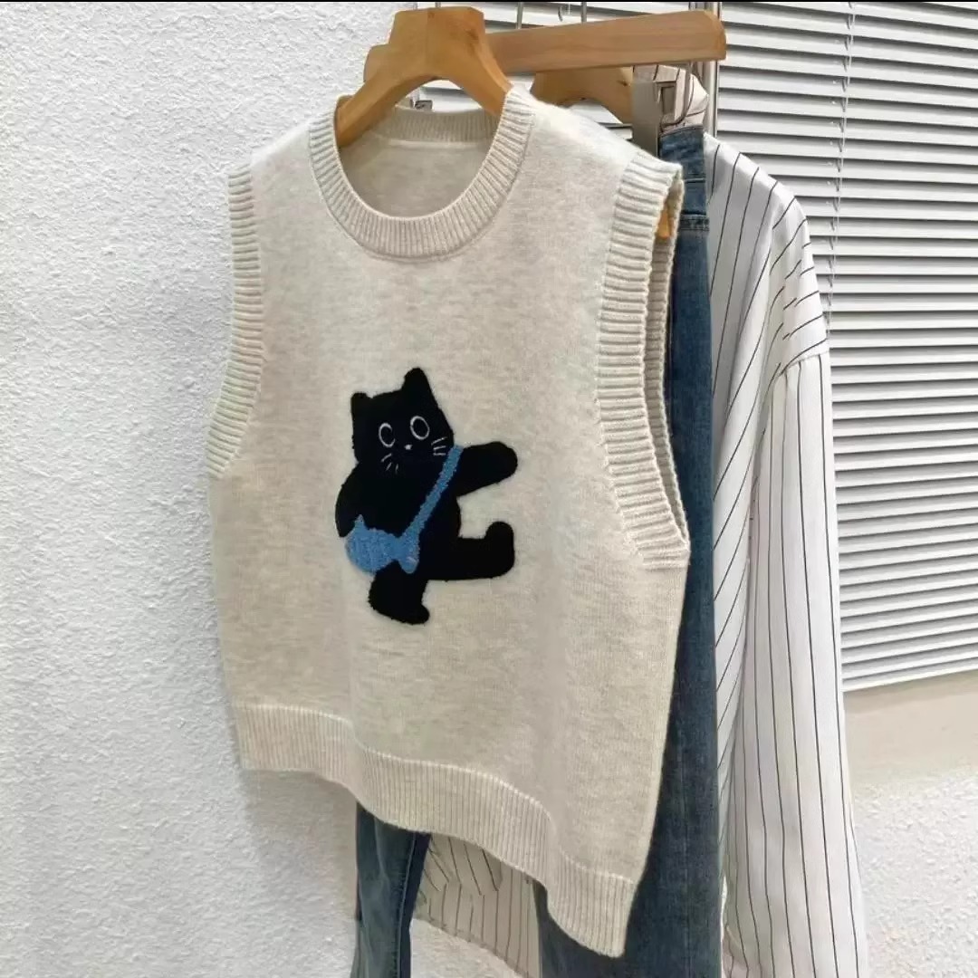 조끼 니트 2025 봄 새로운 여성의 나이를 줄이는 고양이 스웨터 조끼 둥근 목 느슨한 외복스토어 가기