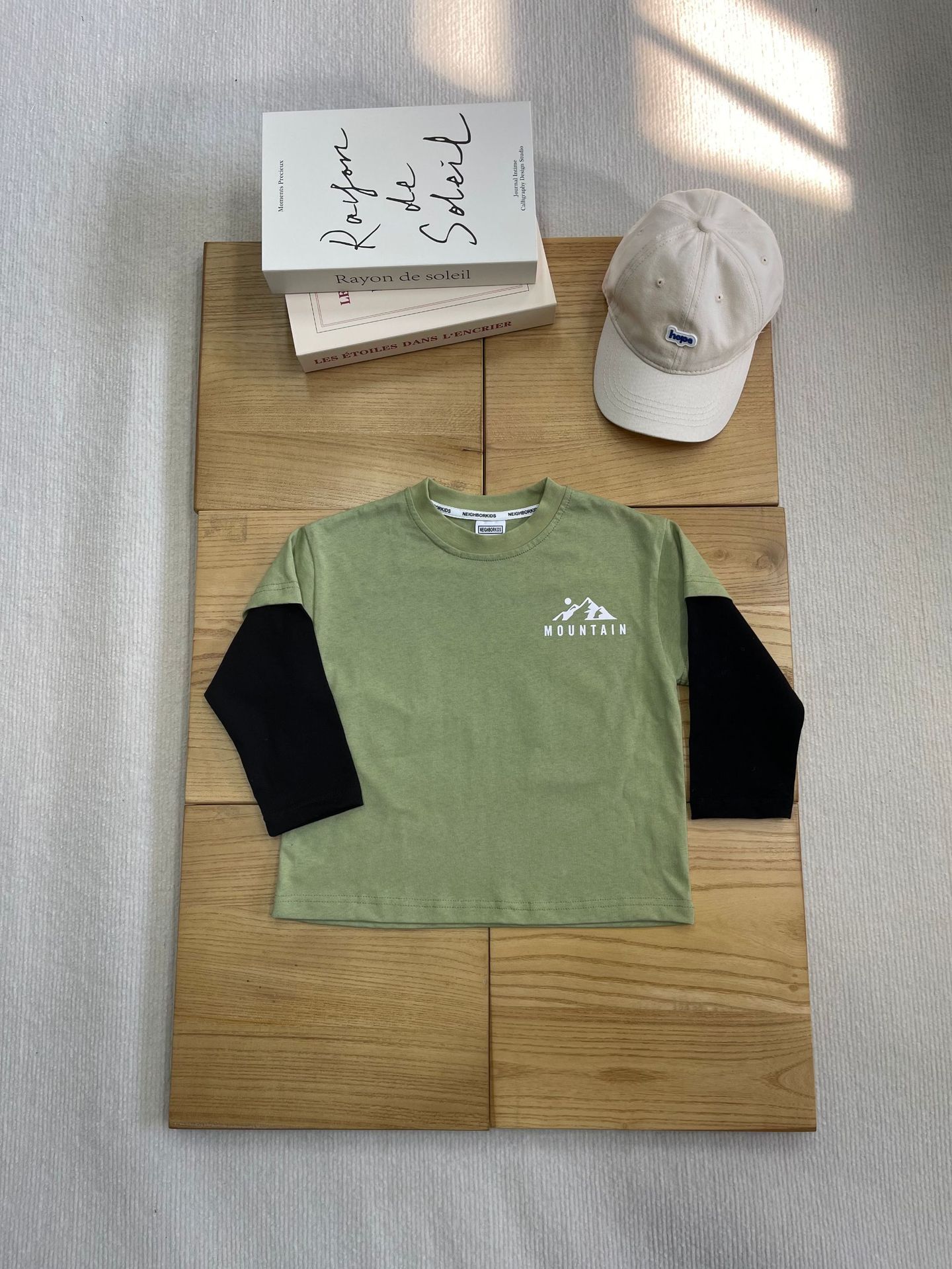 2025 어린이 봄 새로운 야외 산 캠핑 스타일 라운드 넥 대비 색상 가짜 투피스 중대형 어린이 긴팔 티셔츠 유행스토어 가기