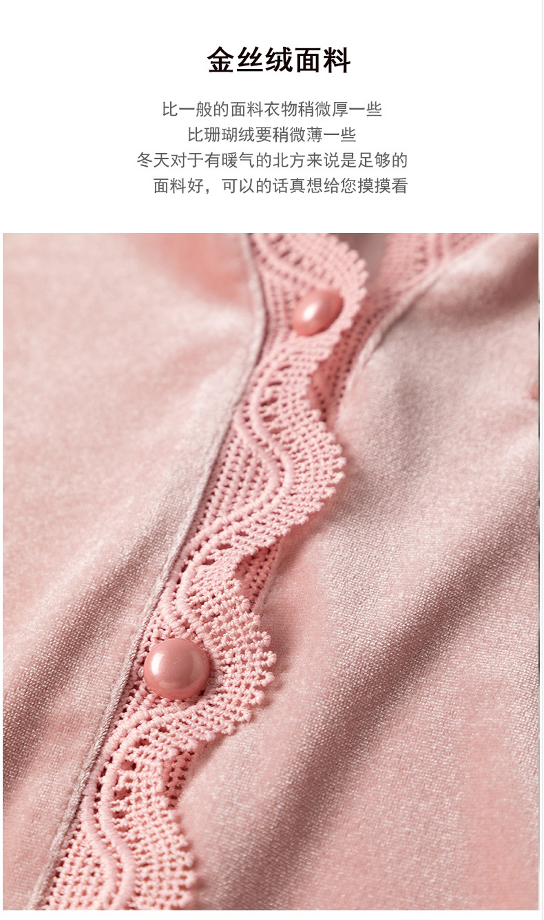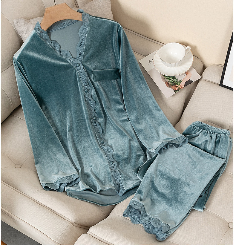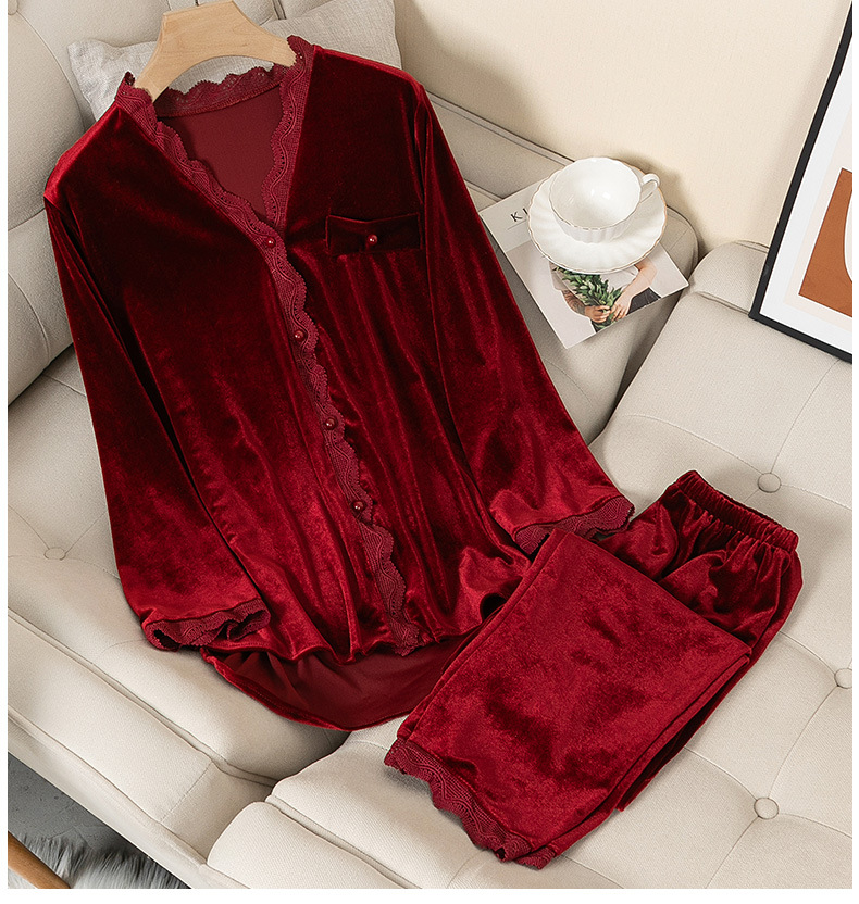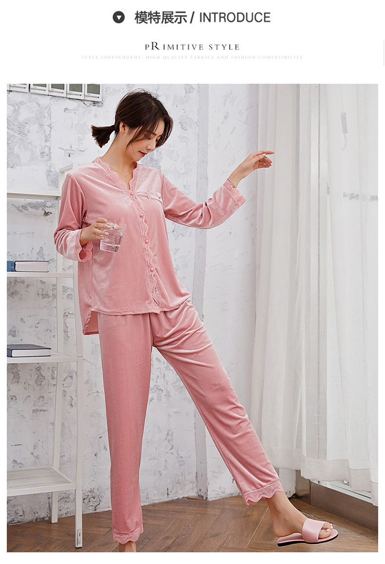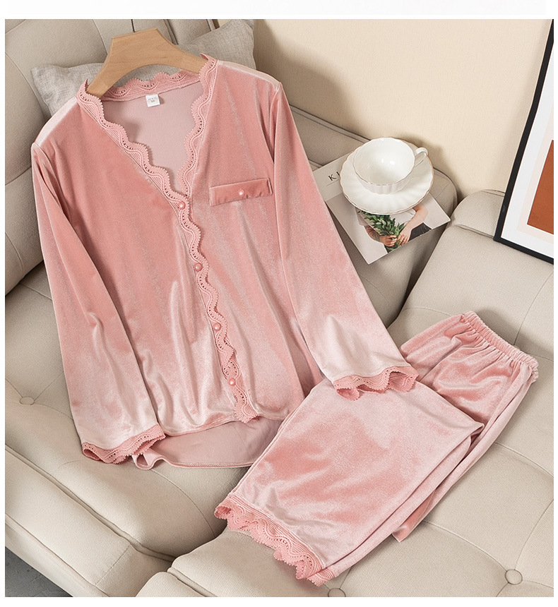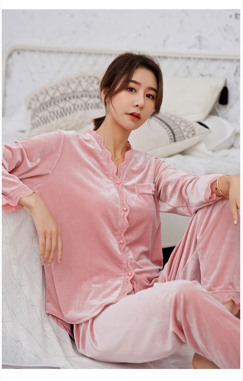 새로운 골드 벨벳 파자마 여성의 봄과 가을 긴 소매 레이스 외부 달콤한 두 조각 세트 라이브 인터넷 축하 홈 옷스토어 가기