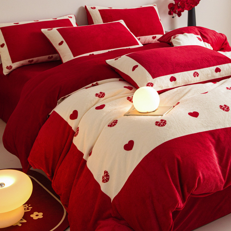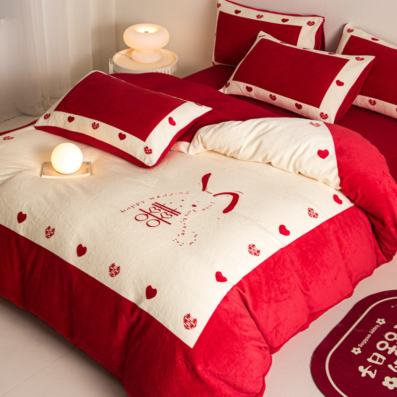 冬季牛奶绒结婚四件套大红色法兰珊瑚绒被套陪嫁喜被婚庆床上用品스토어 가기