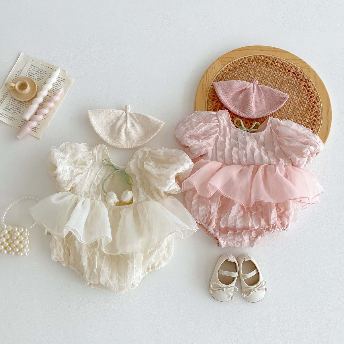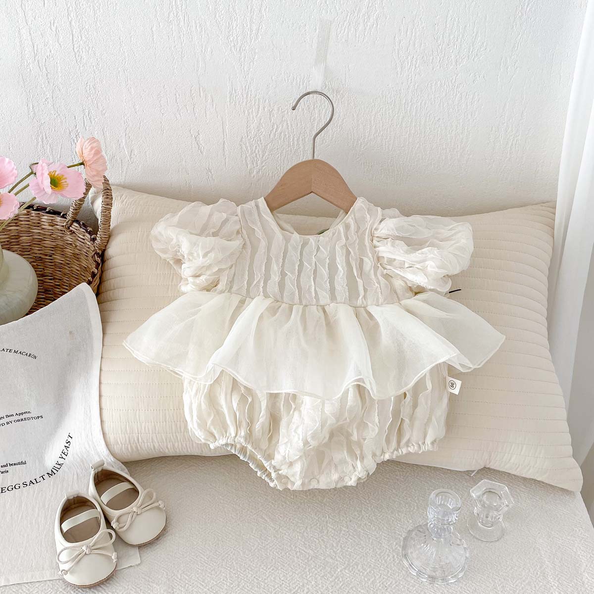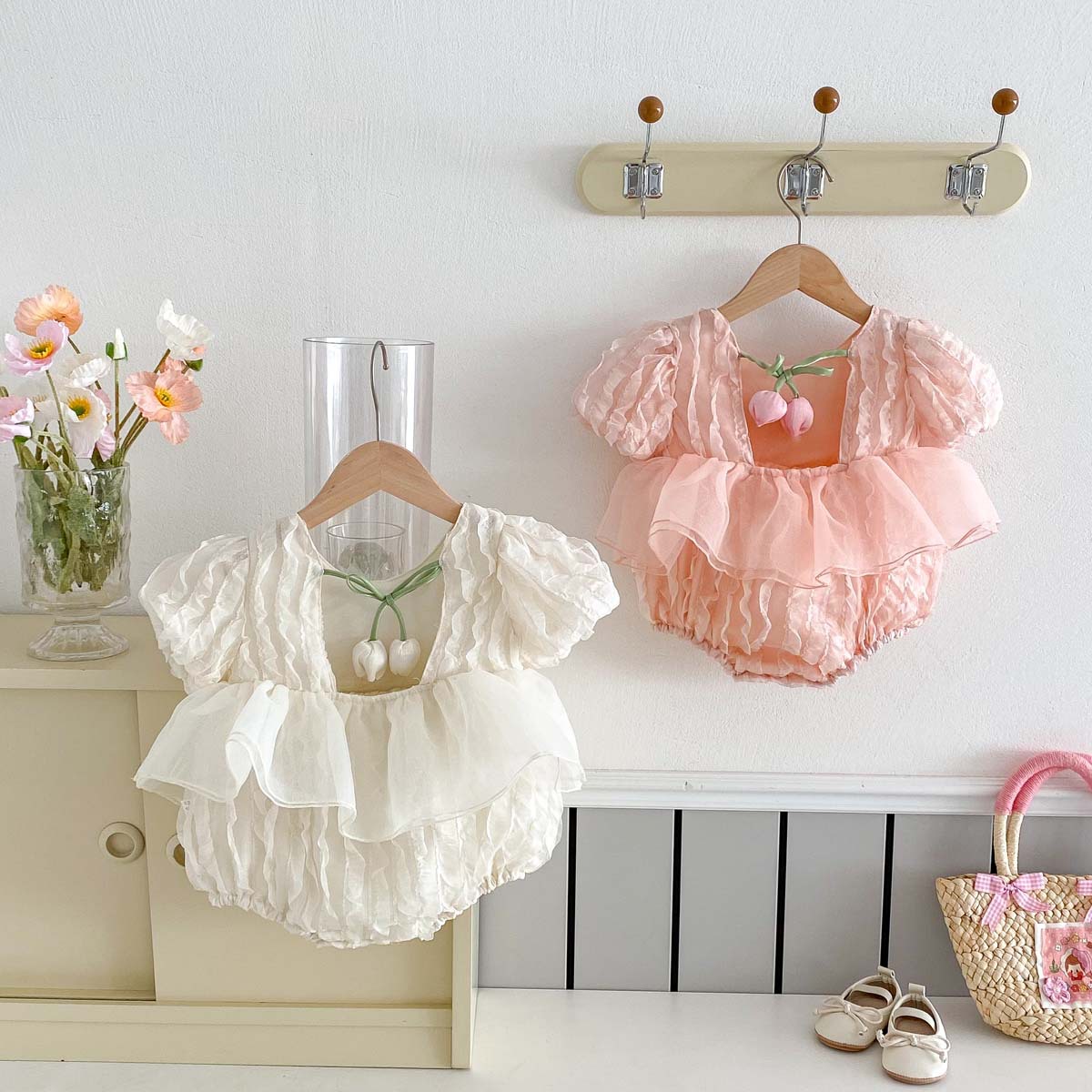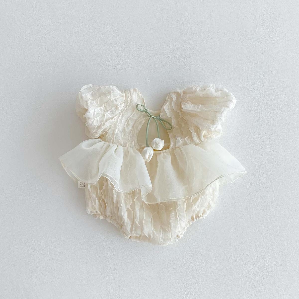 어린이 여름 새 퍼프 슬리브 반팔 점프 수트 아기 소녀 달콤한 튤립 백리스 레이스 Hassle스토어 가기