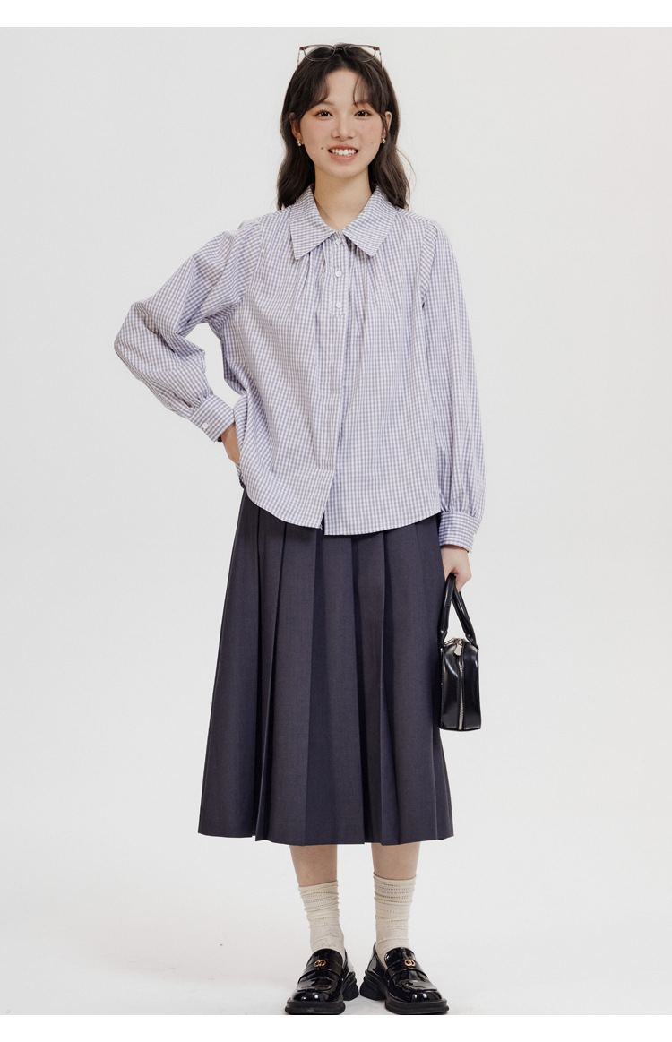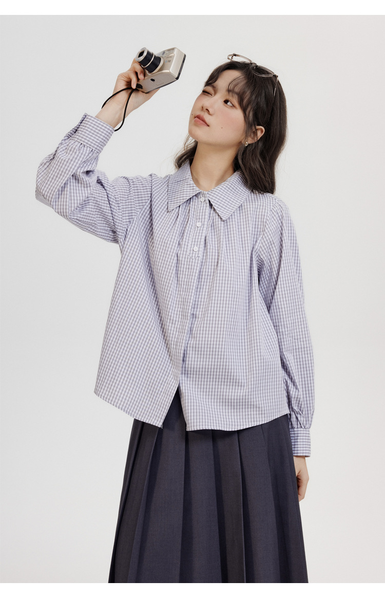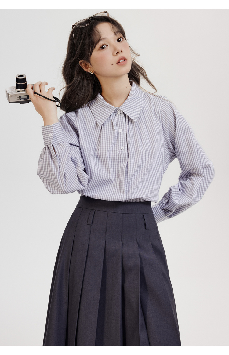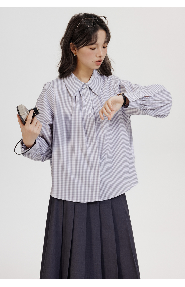 봄 2025 새로운 일본식 미니 액스 디자인 센스 버튼 풀오버 폴로 칼라 격자 무늬 스택 여성용 긴 소매 셔츠
