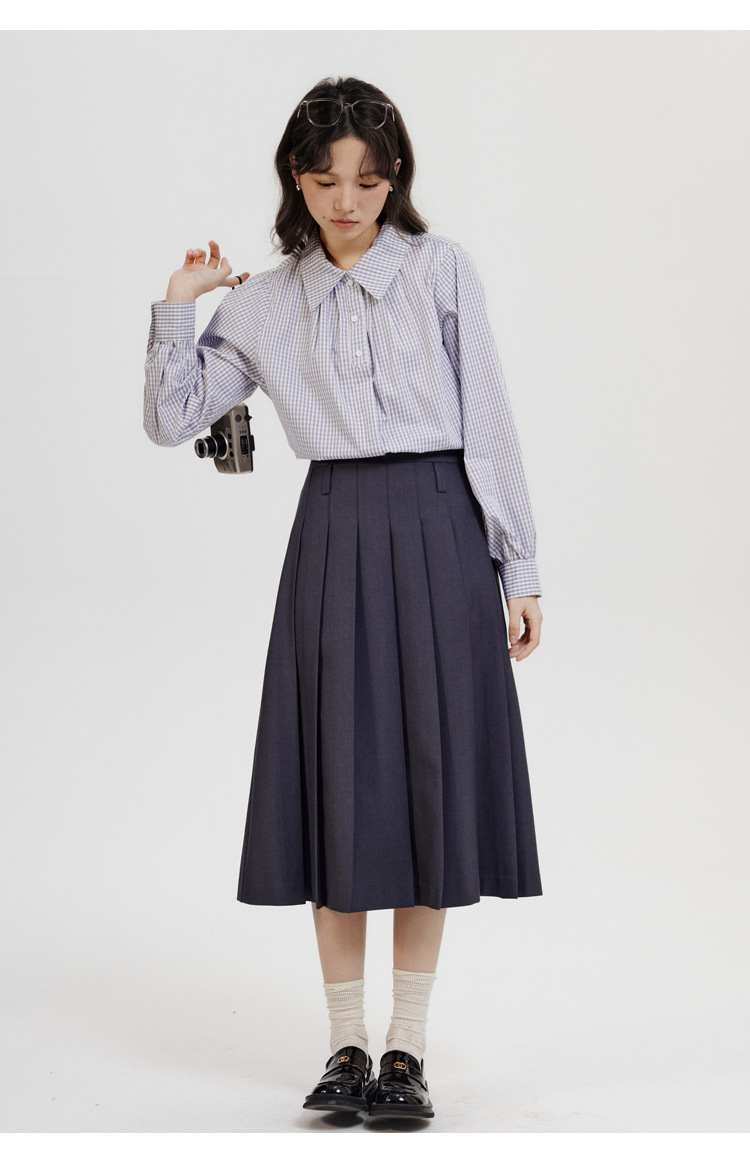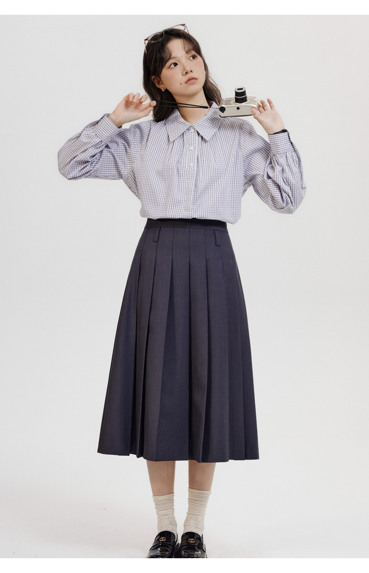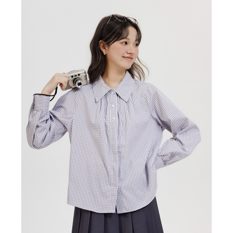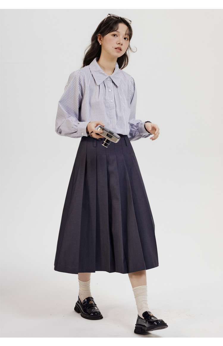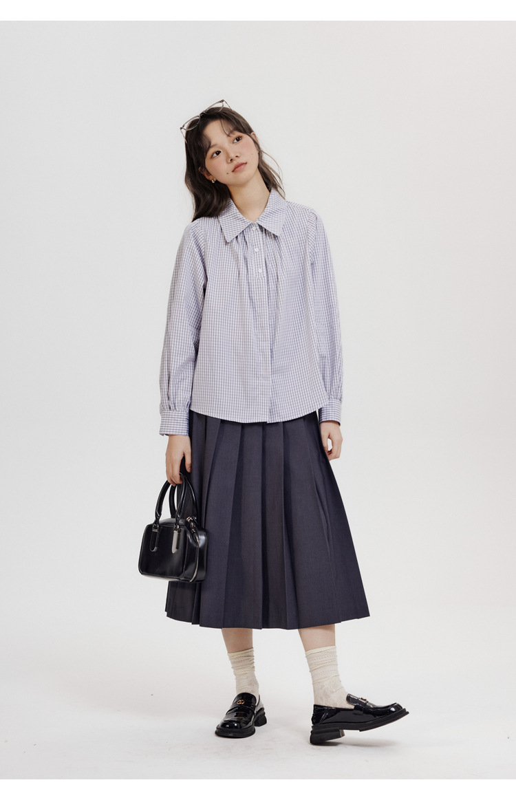 봄 2025 새로운 일본식 미니 액스 디자인 센스 버튼 풀오버 폴로 칼라 격자 무늬 스택 여성용 긴 소매 셔츠