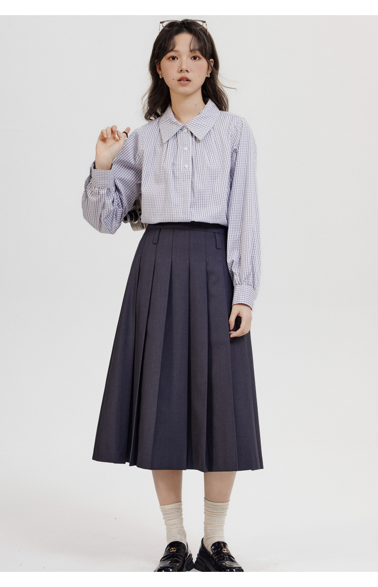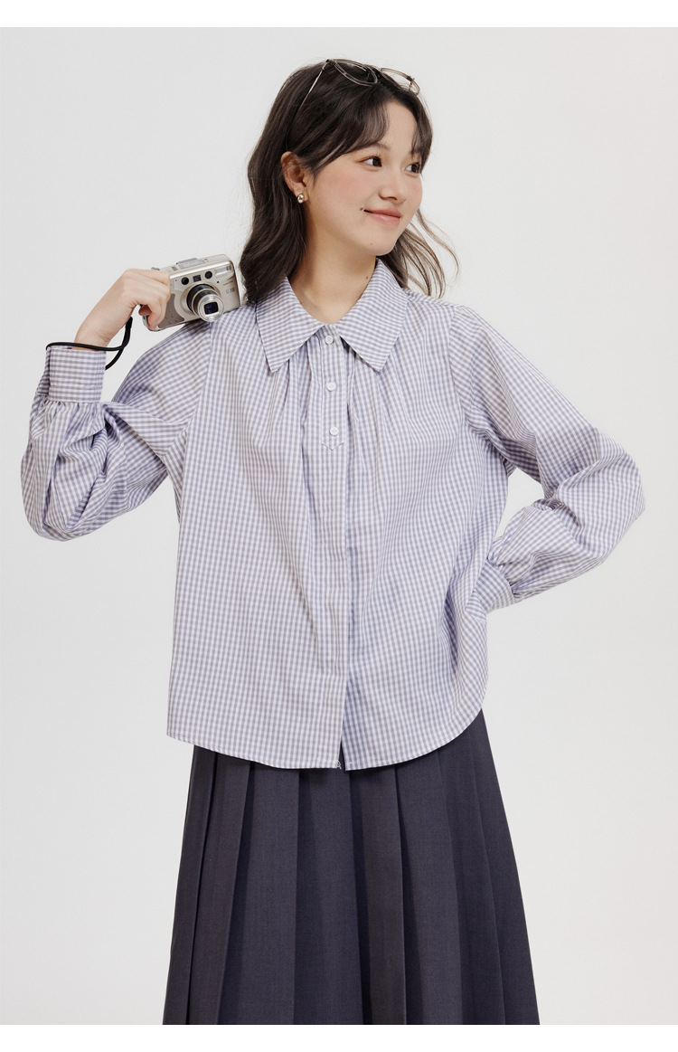 봄 2025 새로운 일본식 미니 액스 디자인 센스 버튼 풀오버 폴로 칼라 격자 무늬 스택 여성용 긴 소매 셔츠스토어 가기