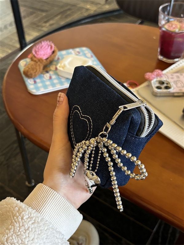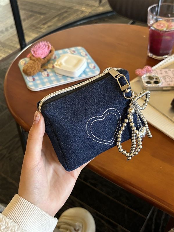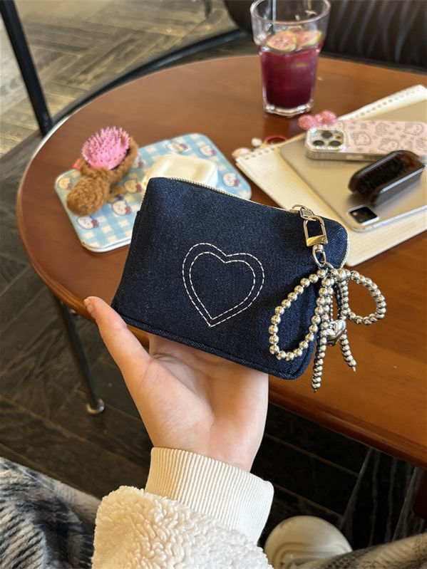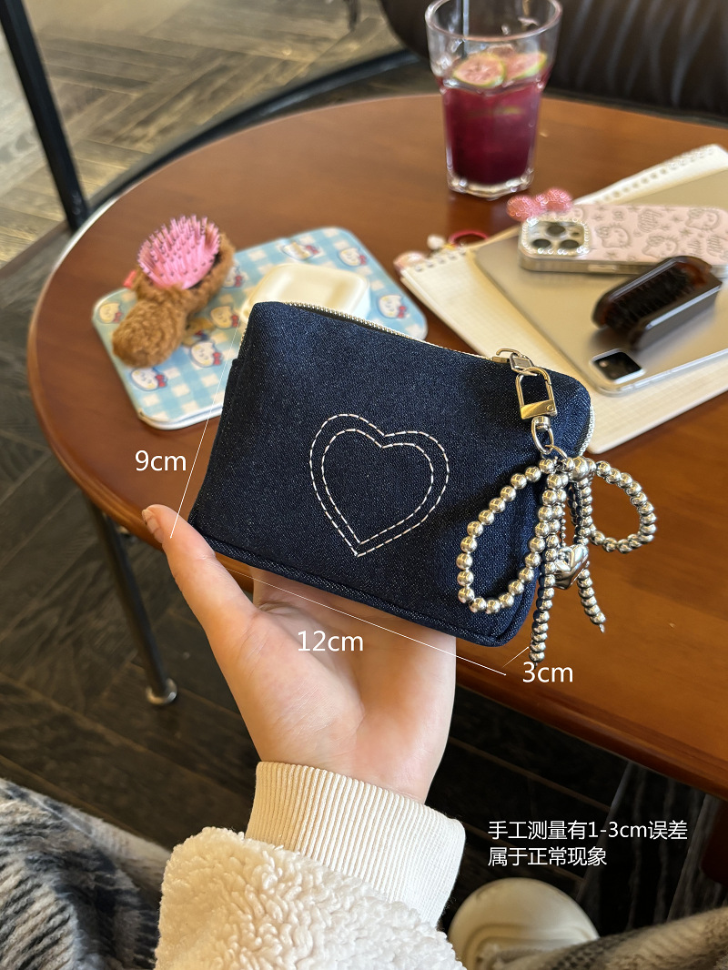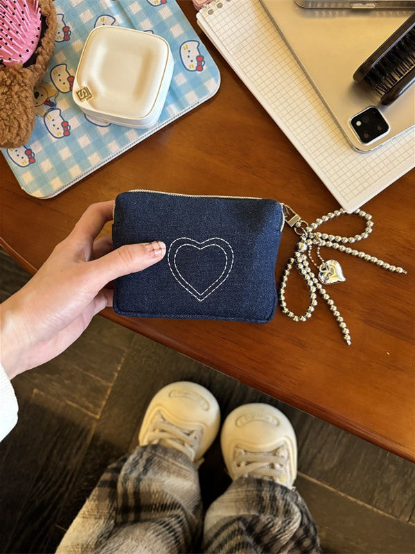 간단한 데님 사랑 자수 화장품 가방 인증서 가방 이어폰 가방 휴대용 작은 가방 먼지 방지 동전 지갑 빨간 가방