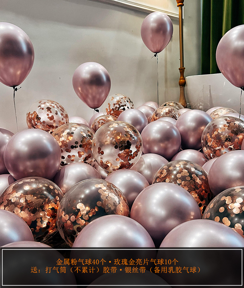 웨딩 룸 장식 장면 레이아웃을 위해 금속 스팽글 생일 매듭과 혼합 된 풍선 핑크 공기 중에 떠 다니는 헬륨으로 채워진 질소 풍선