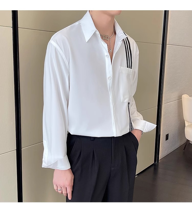 프랑스 스타일 우아한 흰색 셔츠 남자의 하이 엔드 느슨한 긴 소매 줄무늬 디자인 센스 포켓 작업복 셔츠 비즈니스 캐주얼스토어 가기