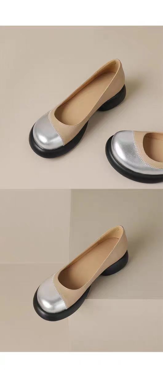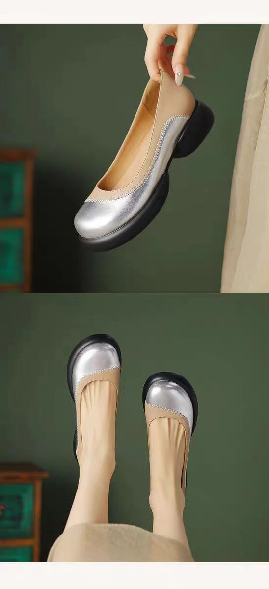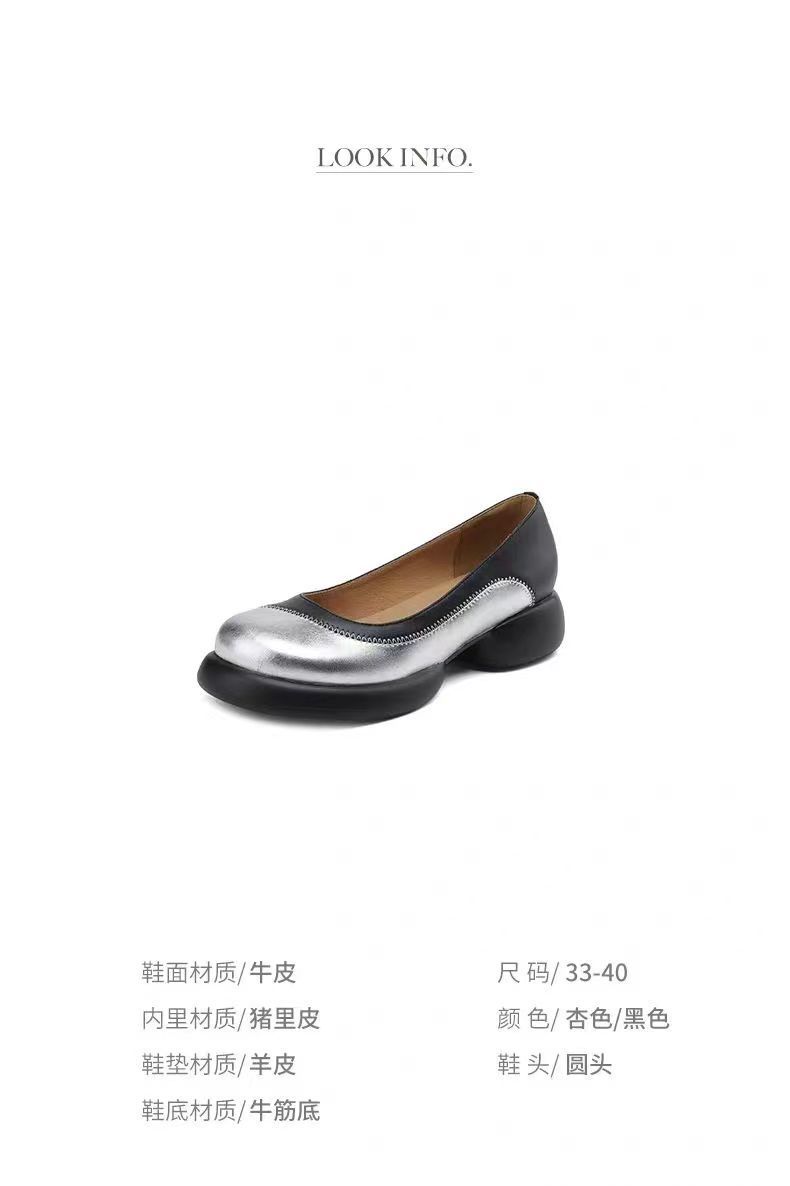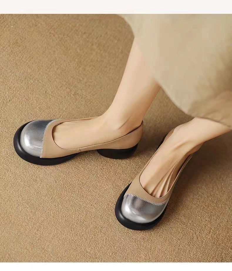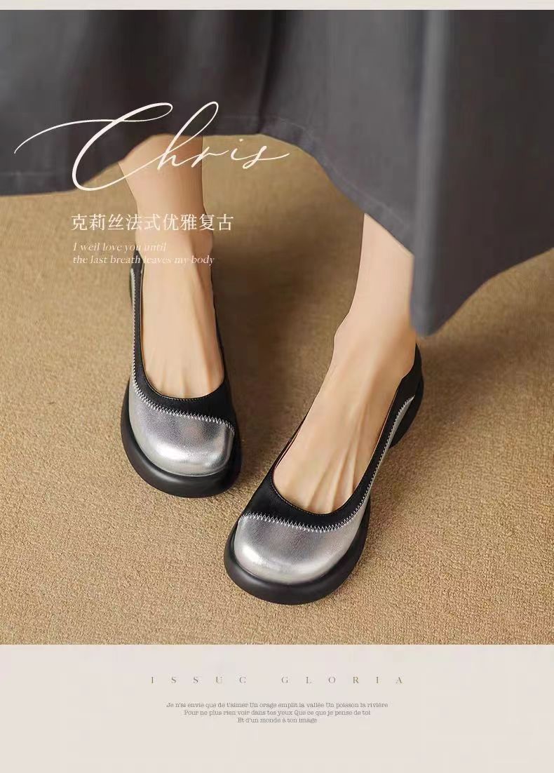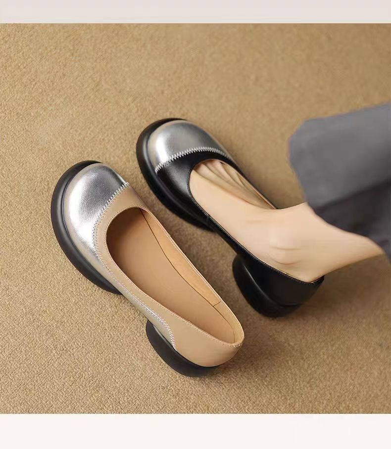 2024 새로운 스타일 향기로운 스타일 인공 가죽 라운드 헤드 컬러 매칭 얕은 입 싱글 레이어 신발 여성 레트로 스타일 캐주얼 두꺼운 바닥 두꺼운 힐 여성 신발