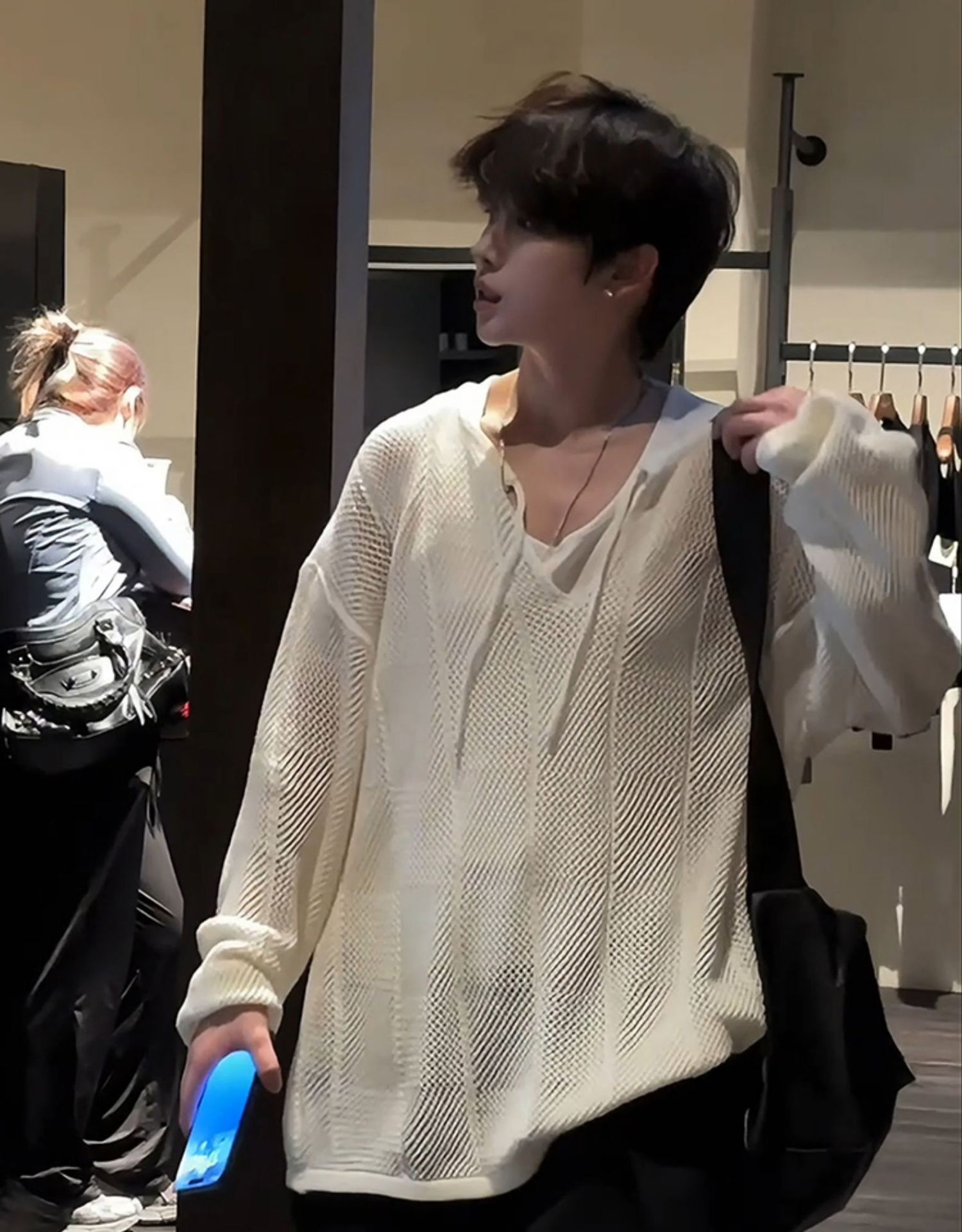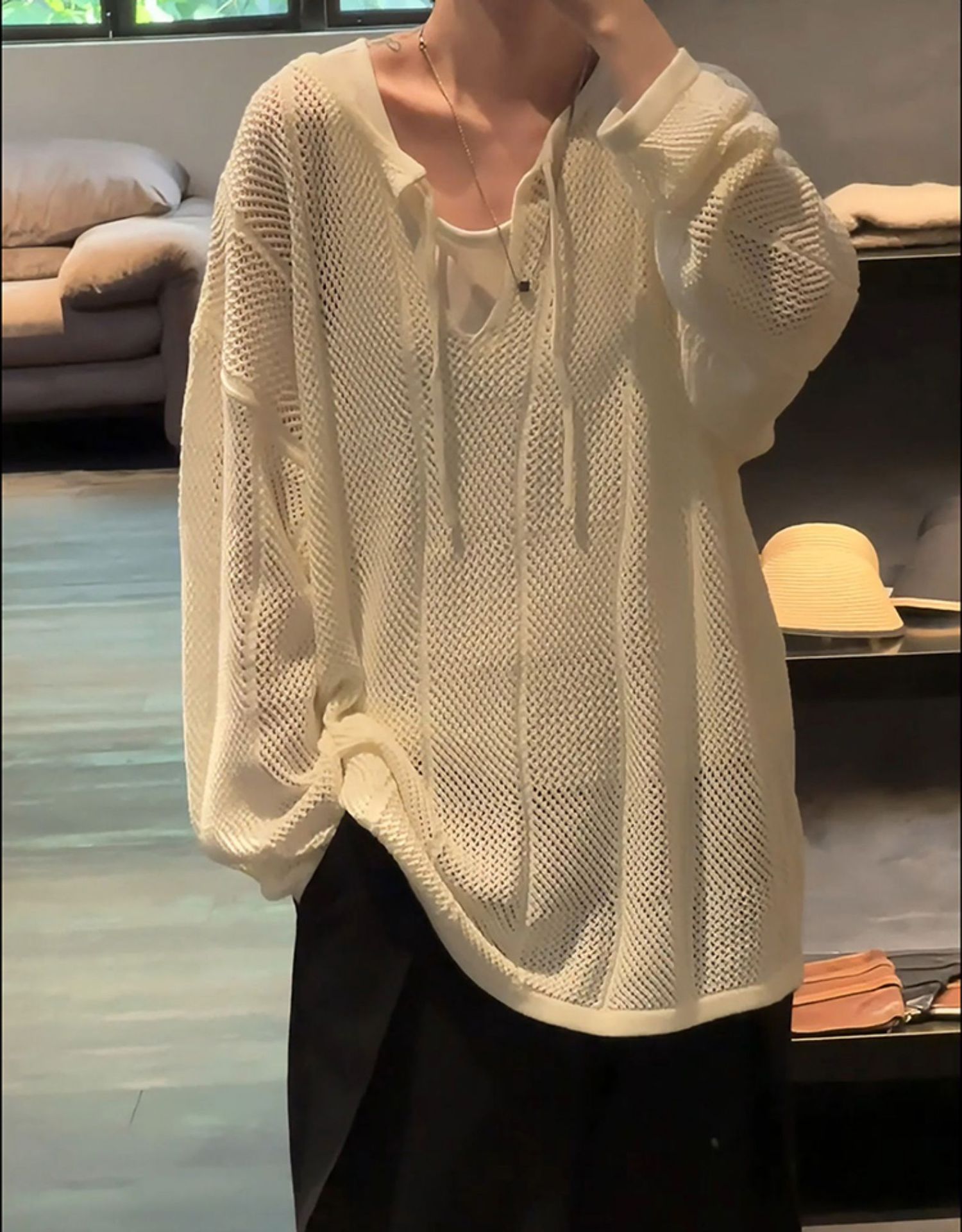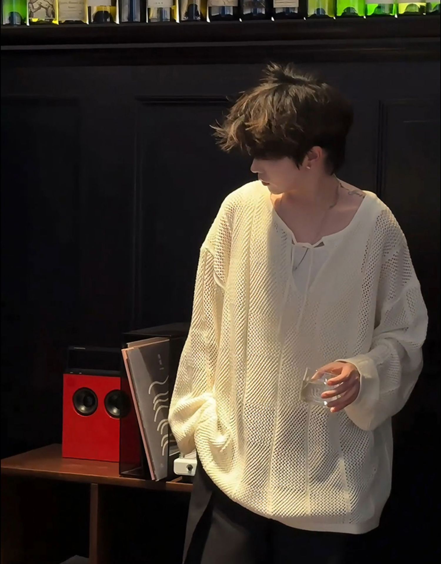 중공 긴 소매 티셔츠 남자의 여름 틈새 디자인 니트웨어 느슨한 휴식 스타일 게으른 스타일 탑