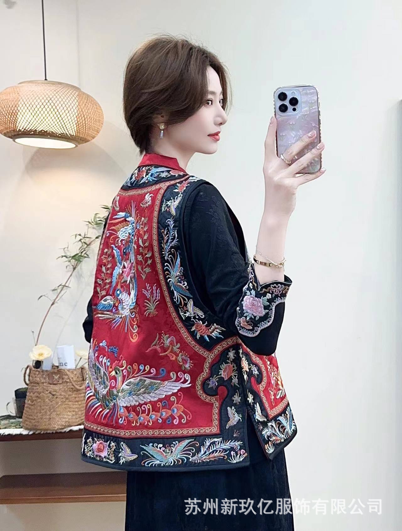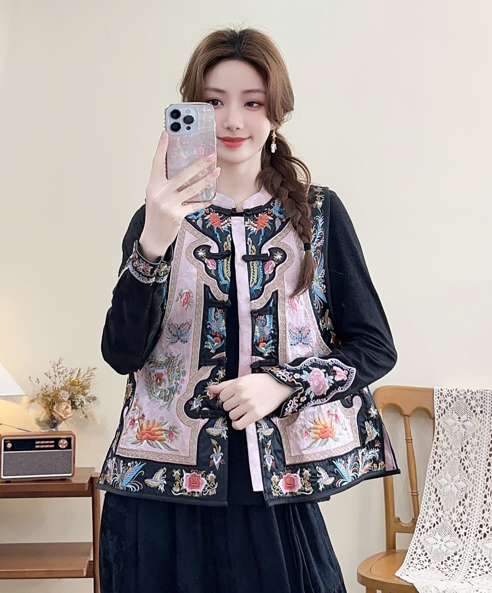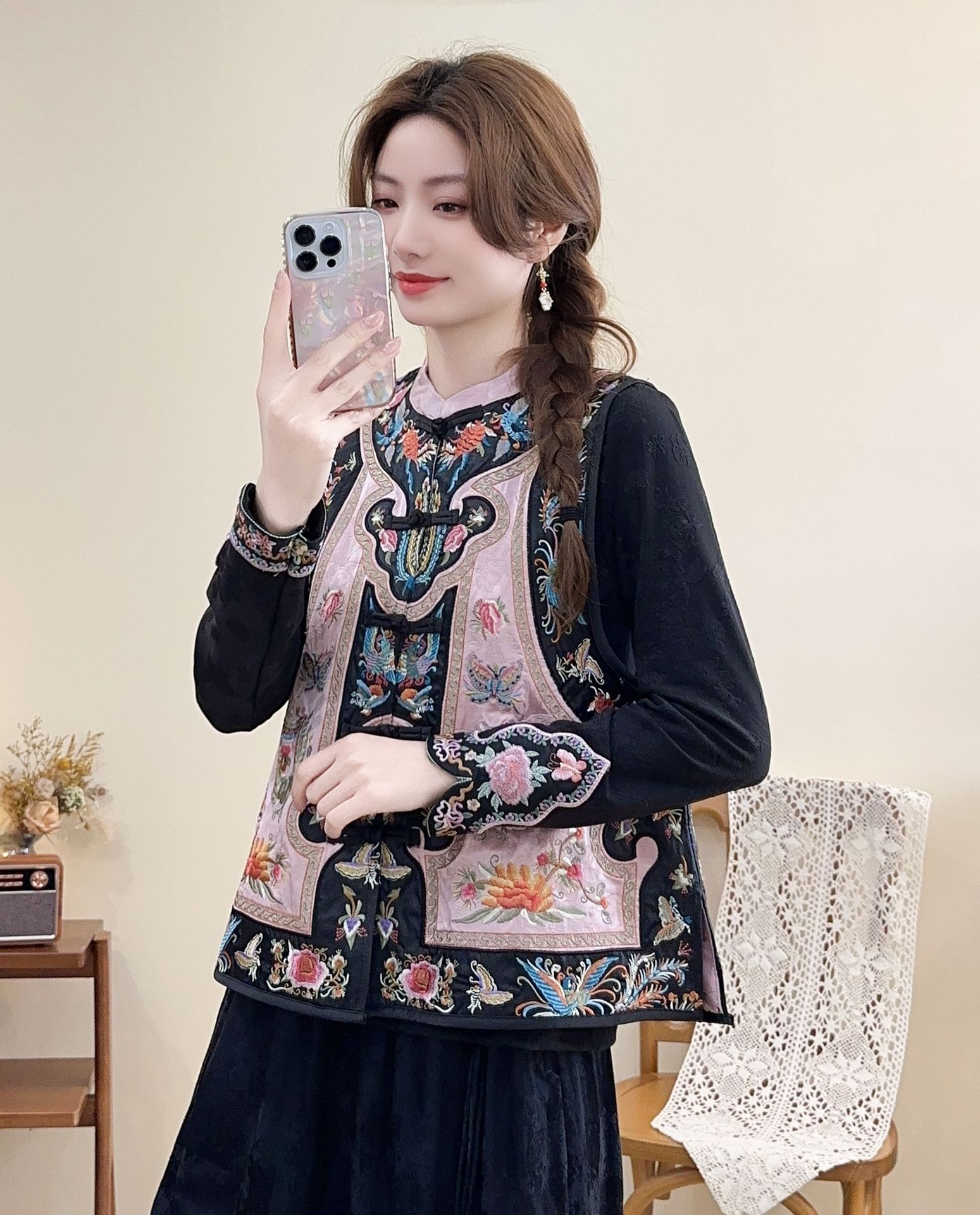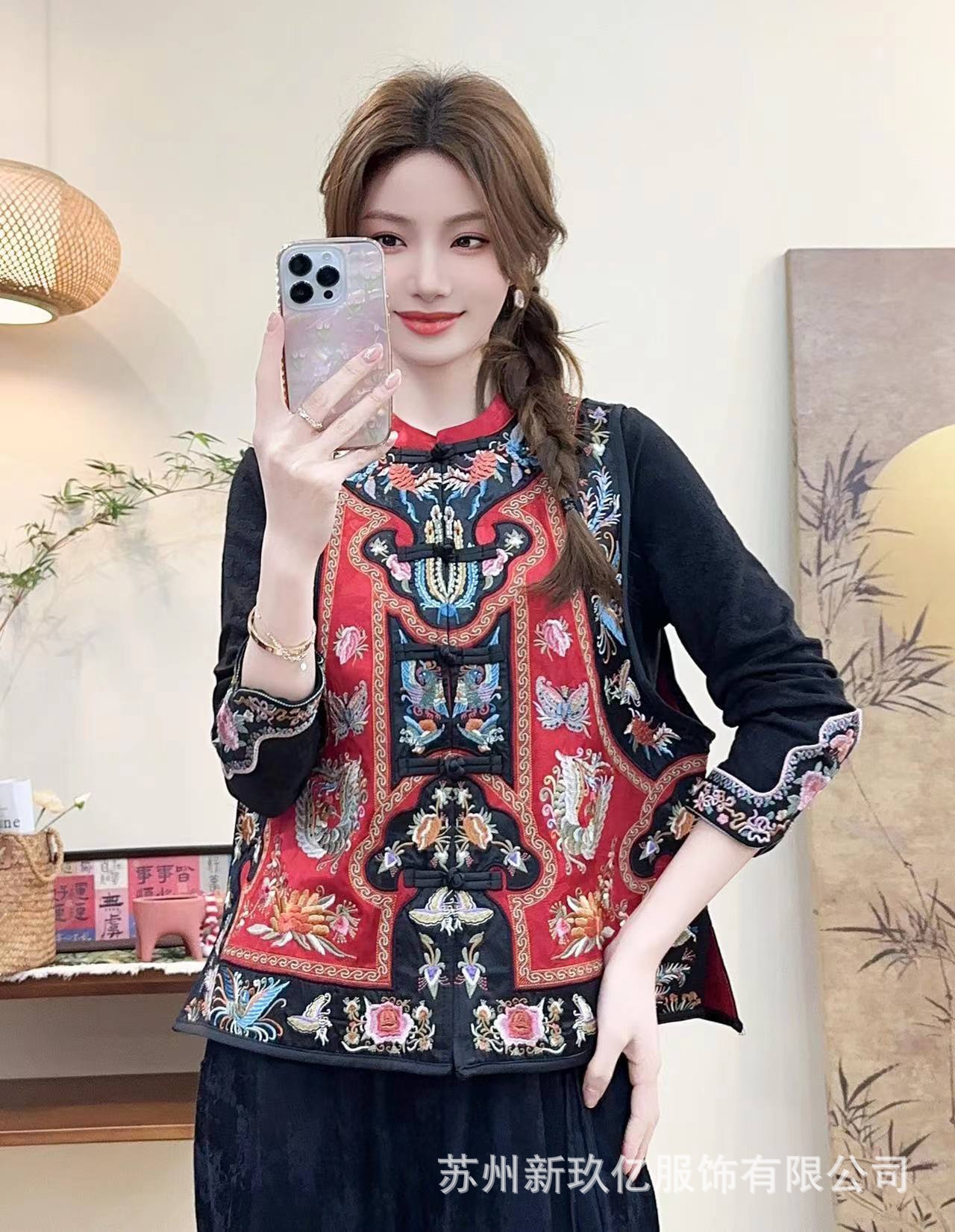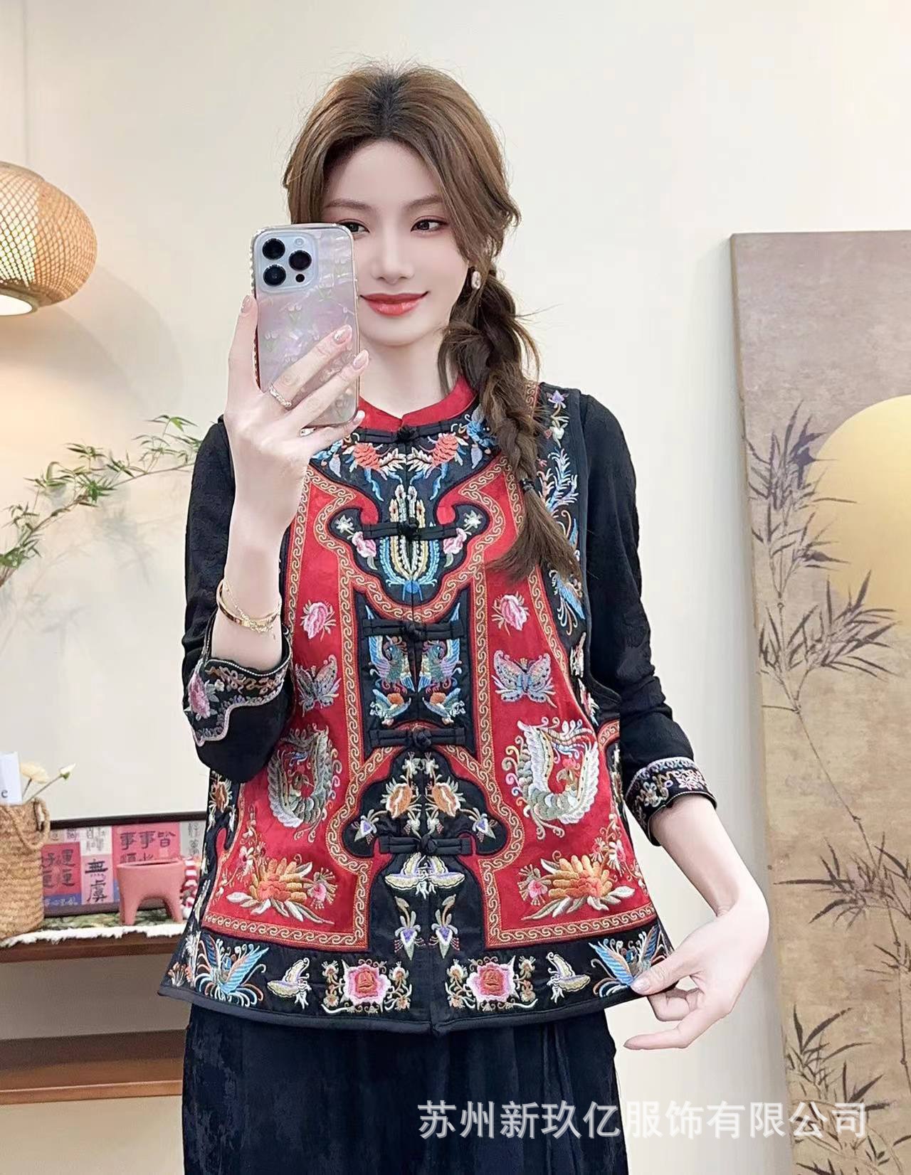 2025 민족 스타일 빈티지 칼라 조끼 여성 싱글 가슴 대비 컬러 스티칭 코튼 리넨 자카드 자수 싱글 레이어 조끼