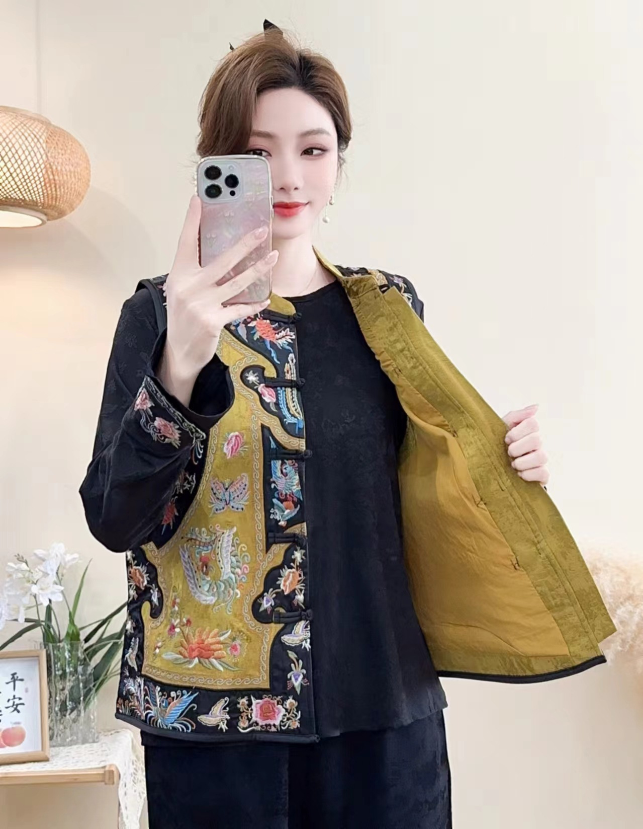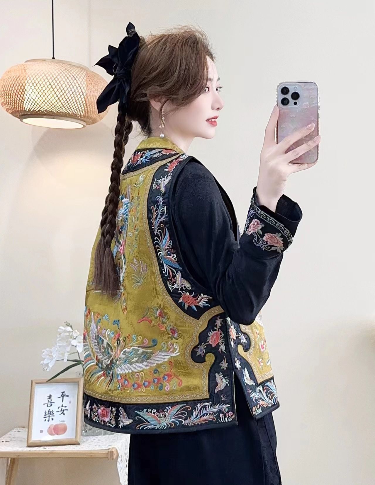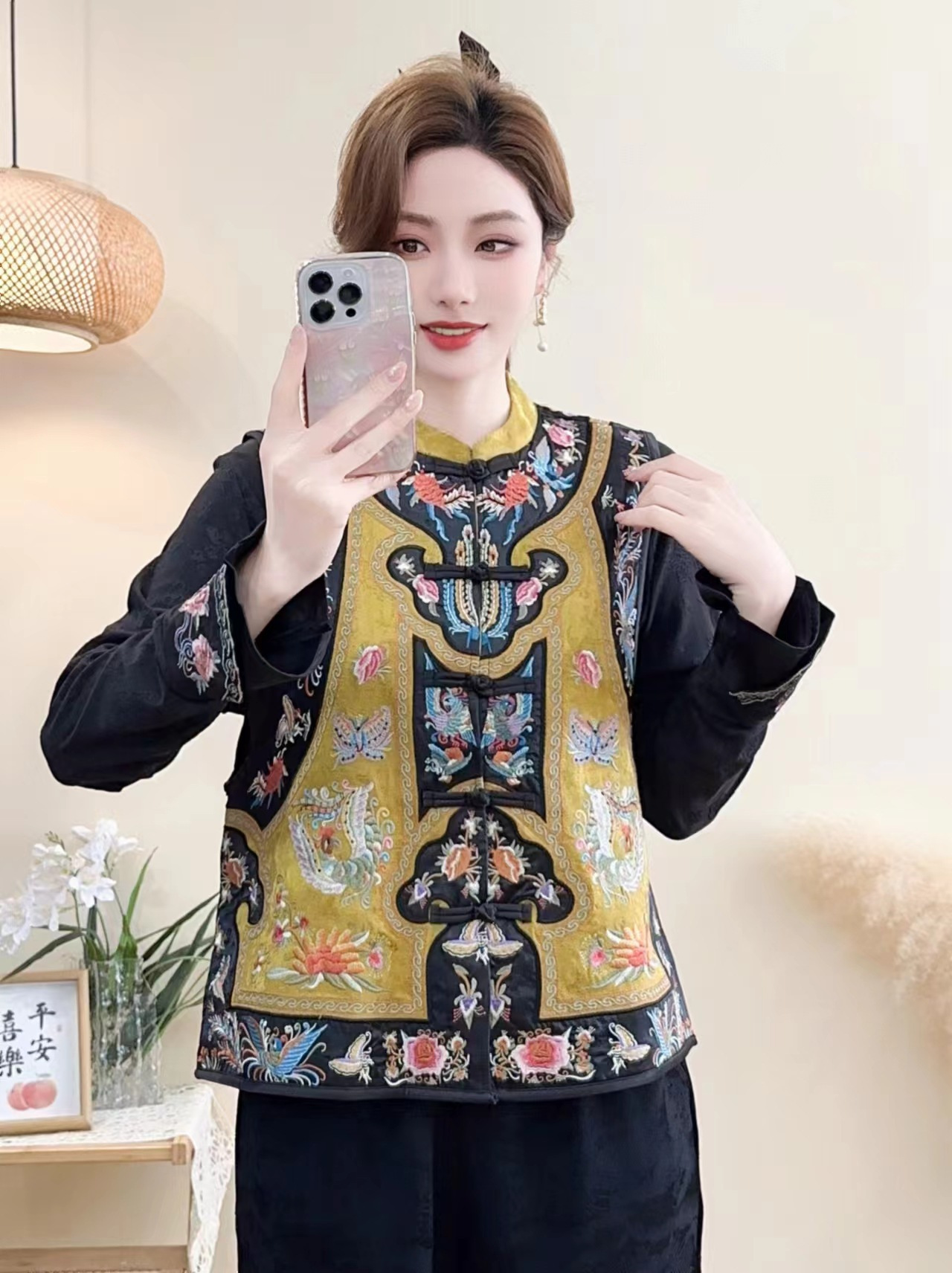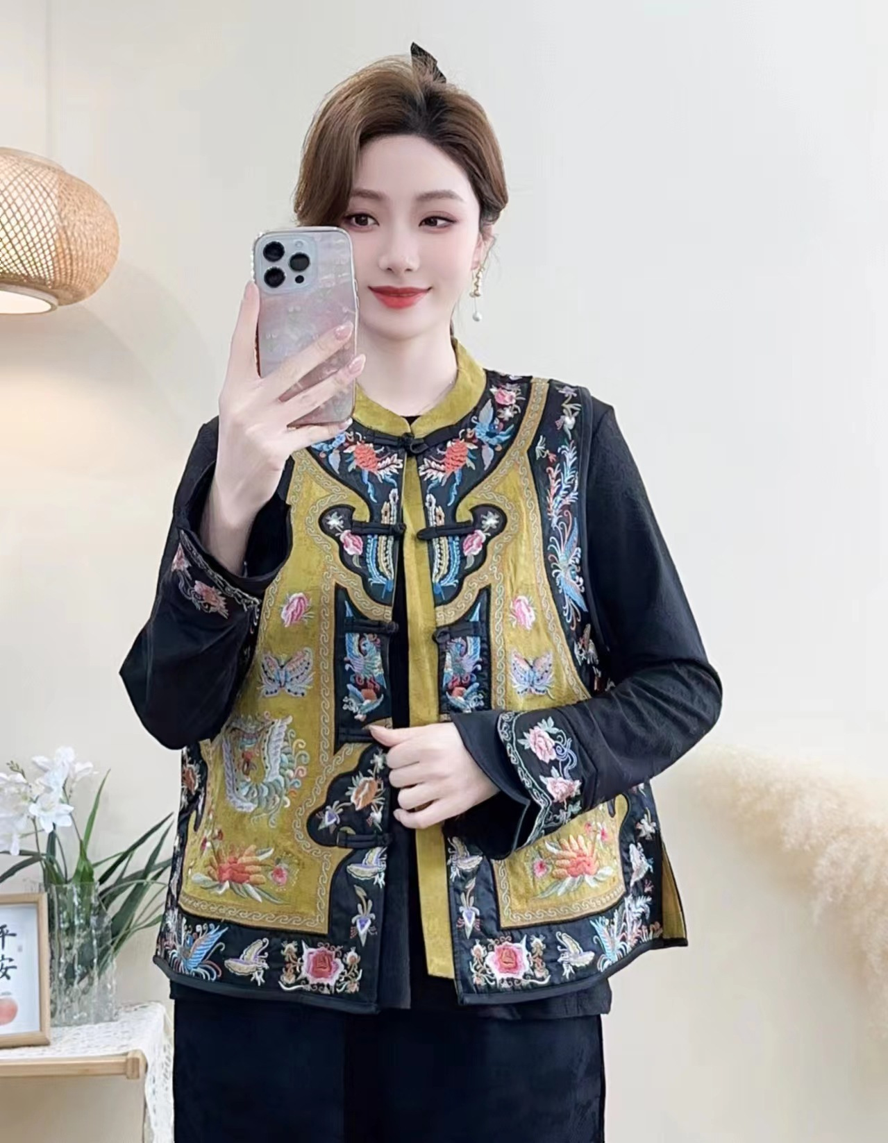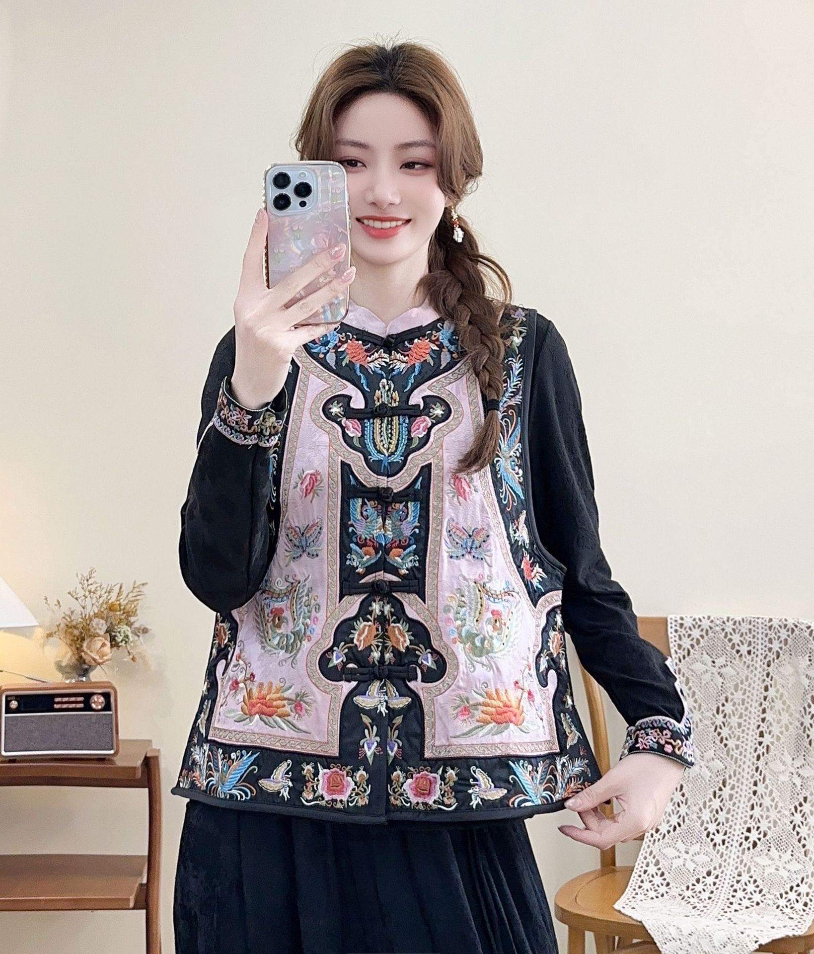 2025 민족 스타일 빈티지 칼라 조끼 여성 싱글 가슴 대비 컬러 스티칭 코튼 리넨 자카드 자수 싱글 레이어 조끼