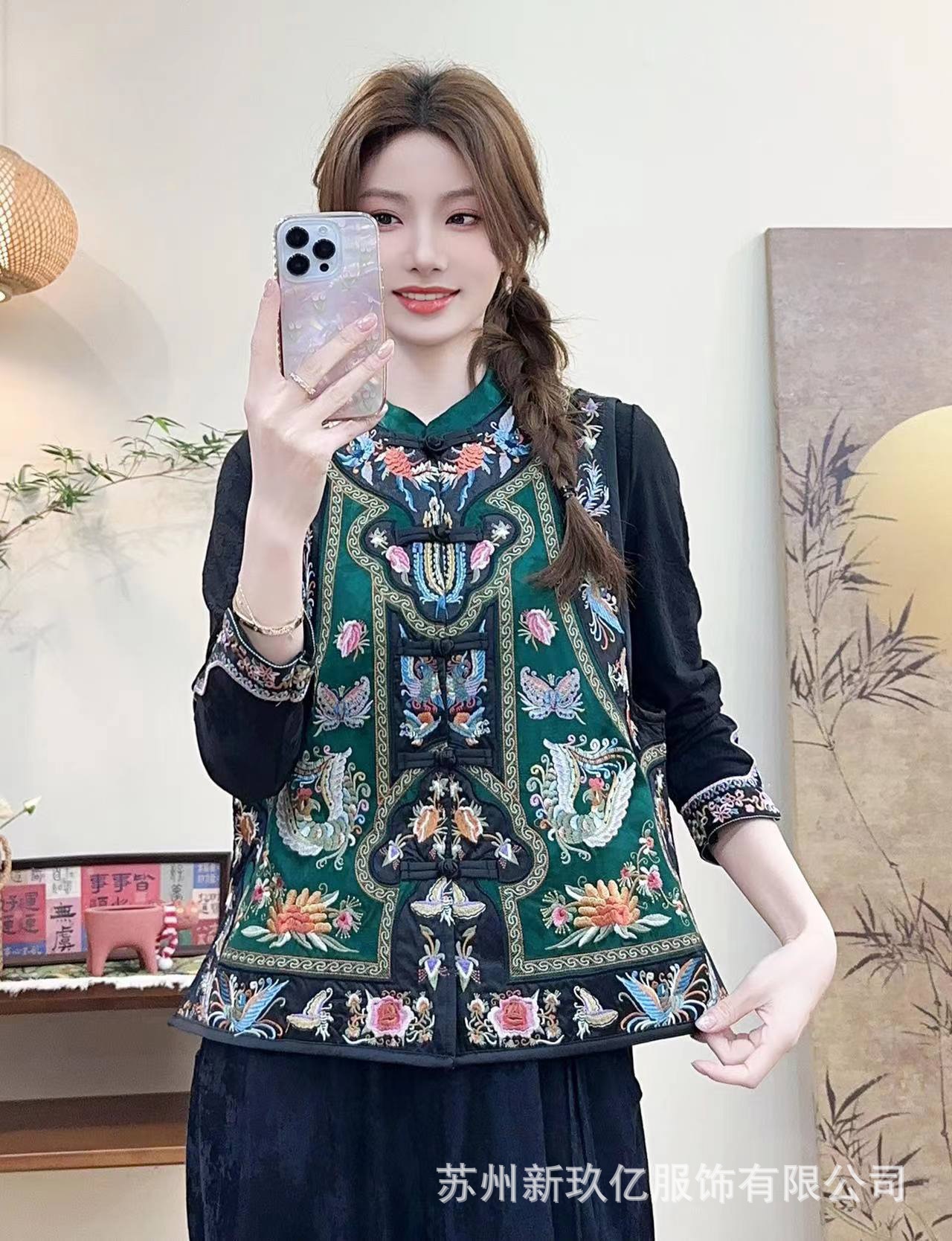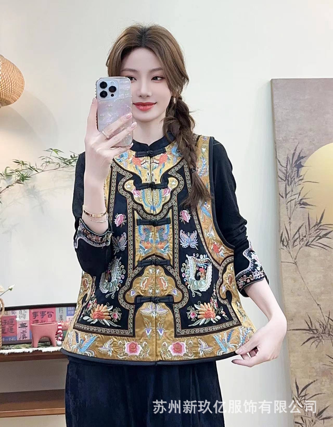 2025 민족 스타일 빈티지 칼라 조끼 여성 싱글 가슴 대비 컬러 스티칭 코튼 리넨 자카드 자수 싱글 레이어 조끼스토어 가기