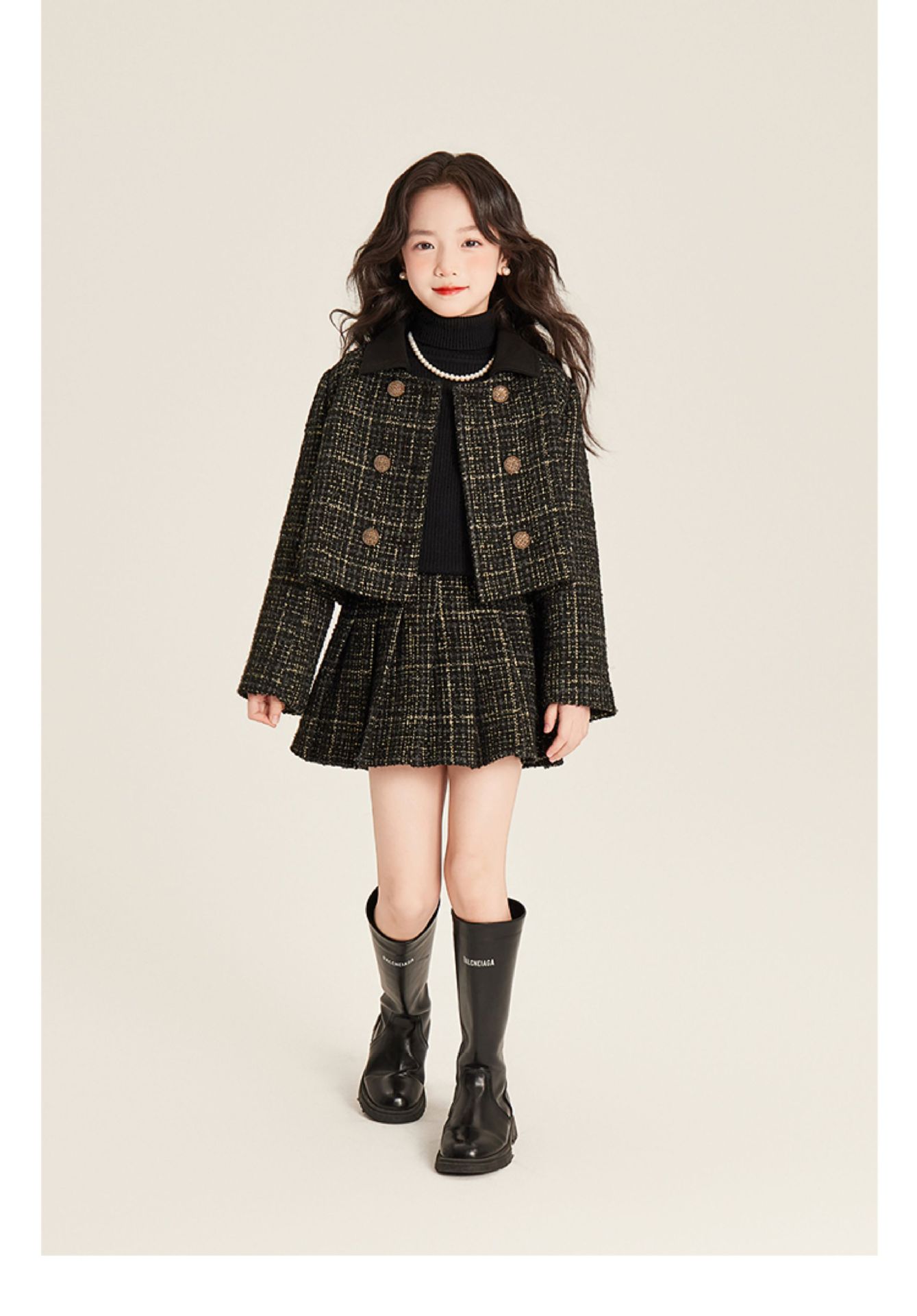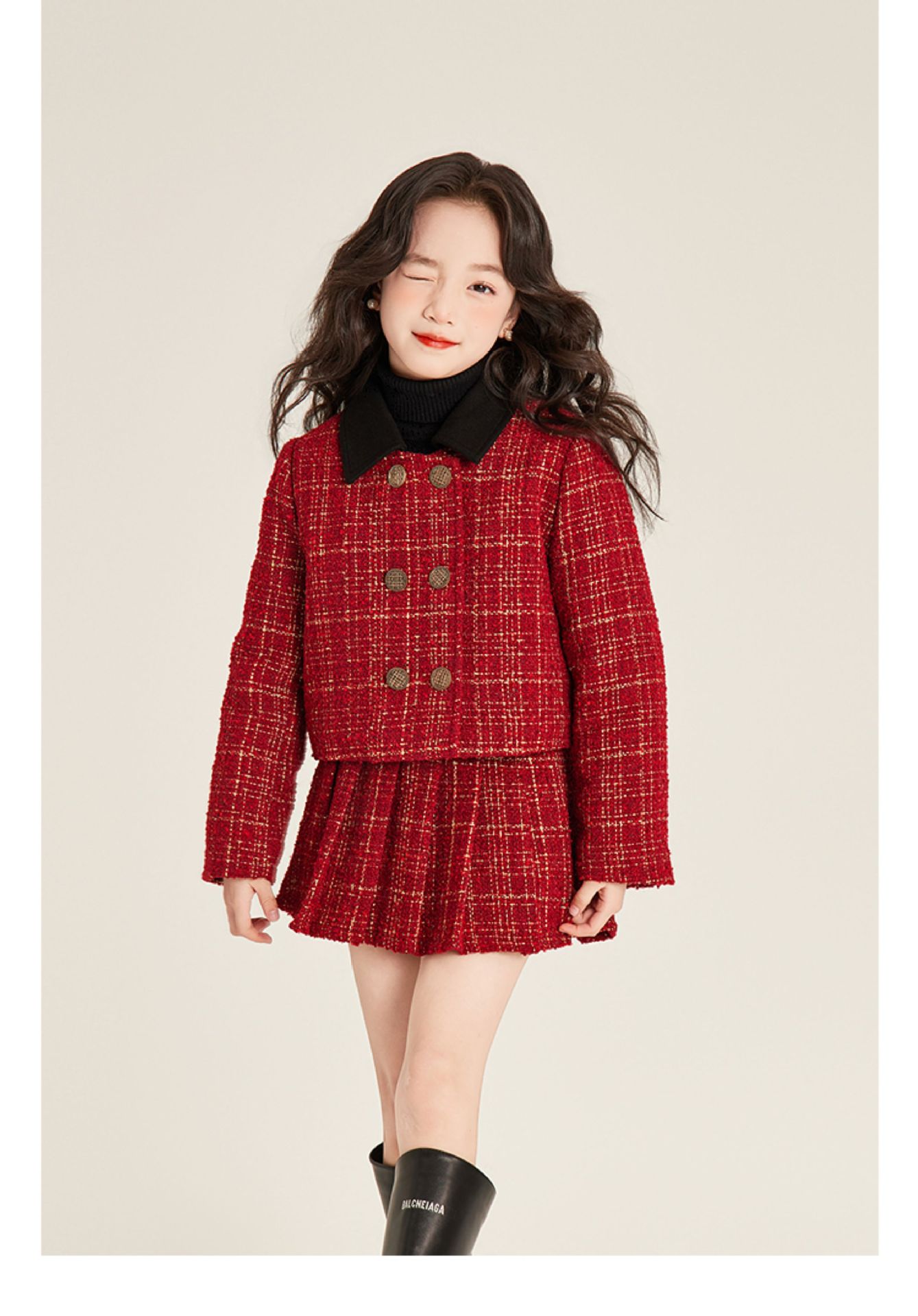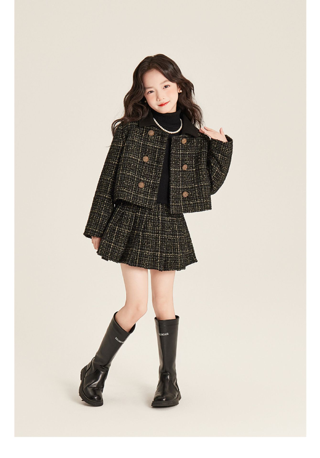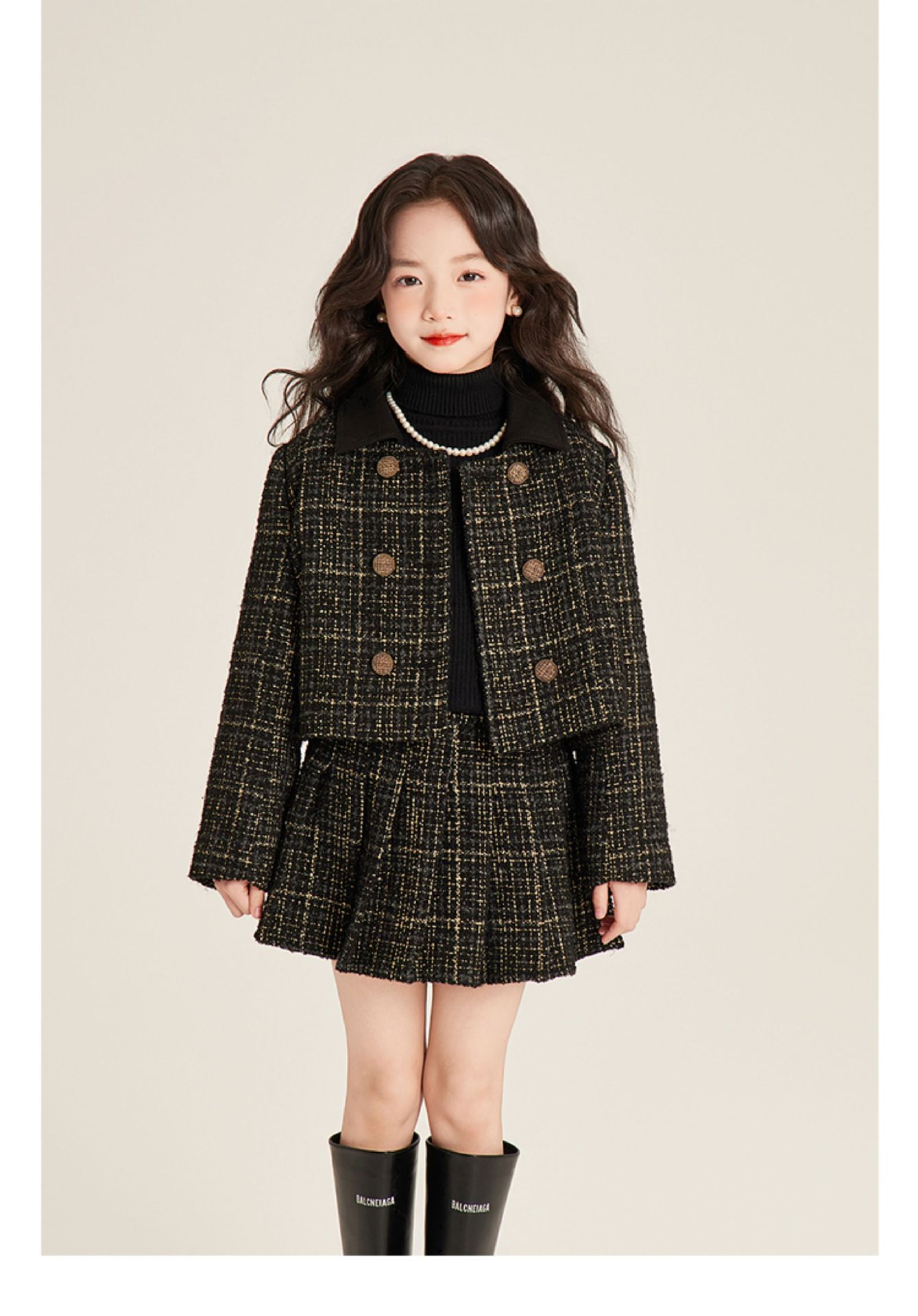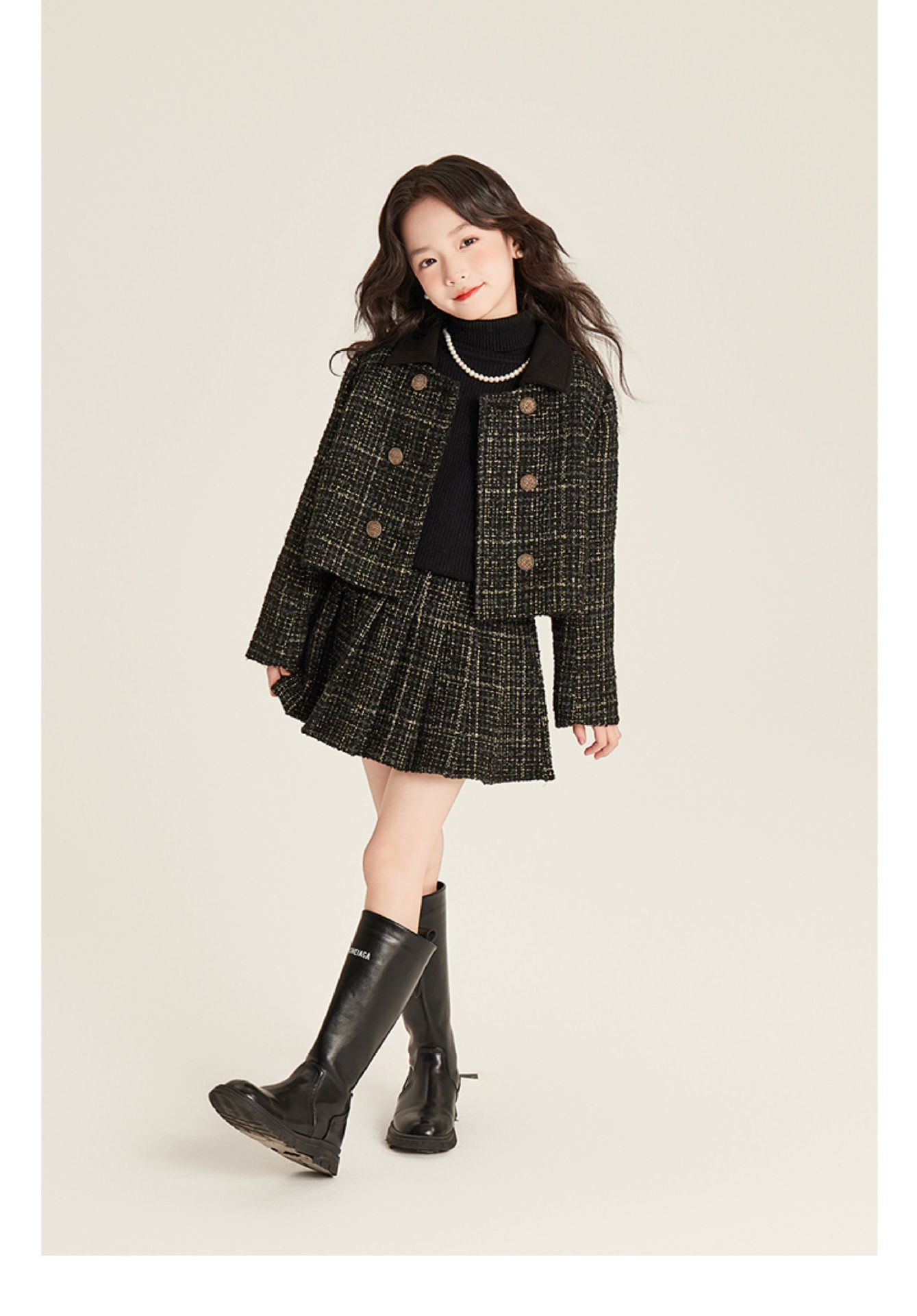 Amybaby 소녀 세트 겨울 2024 새로운 패션 작은 향기로운 민소매 둥근 목 조끼 스커트 주름 치마 코트