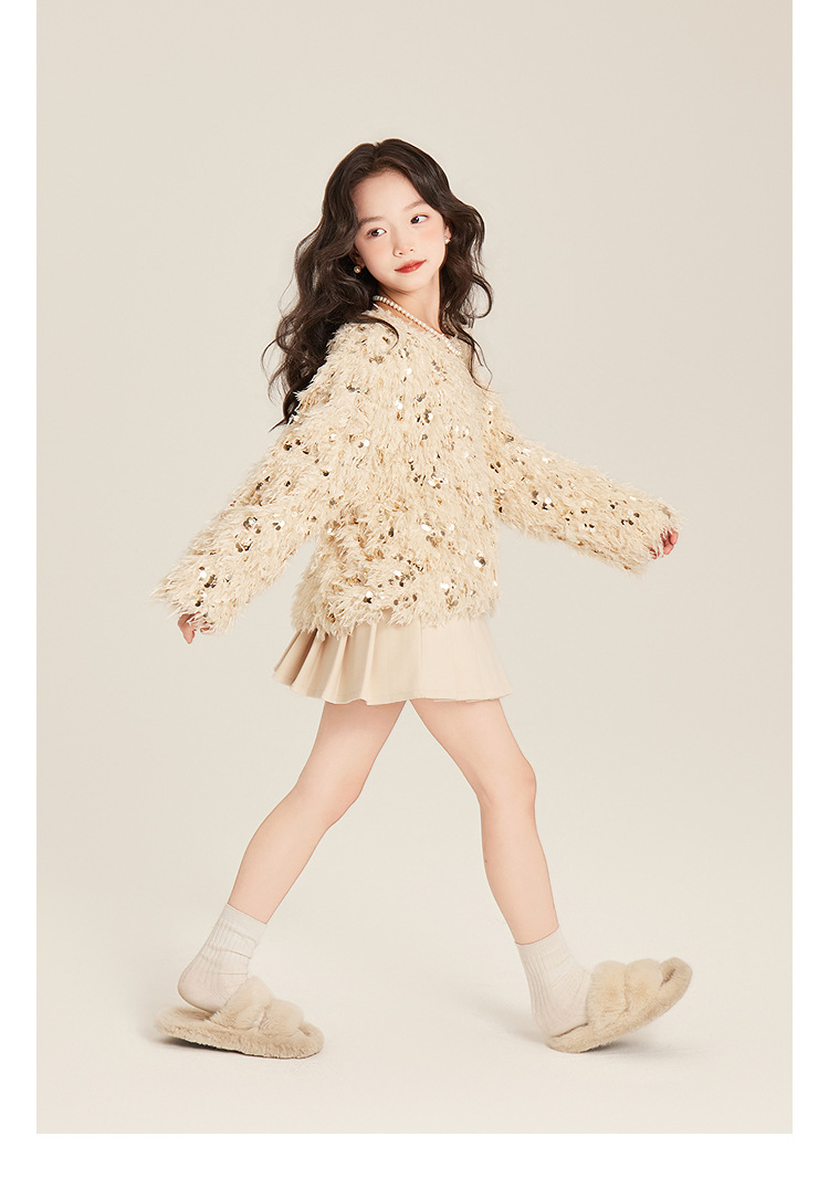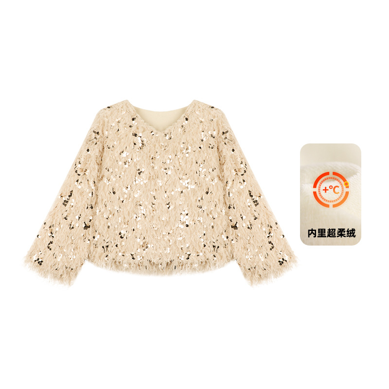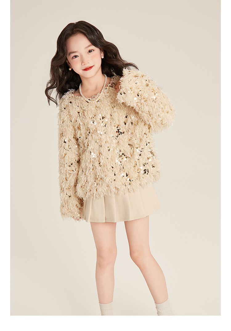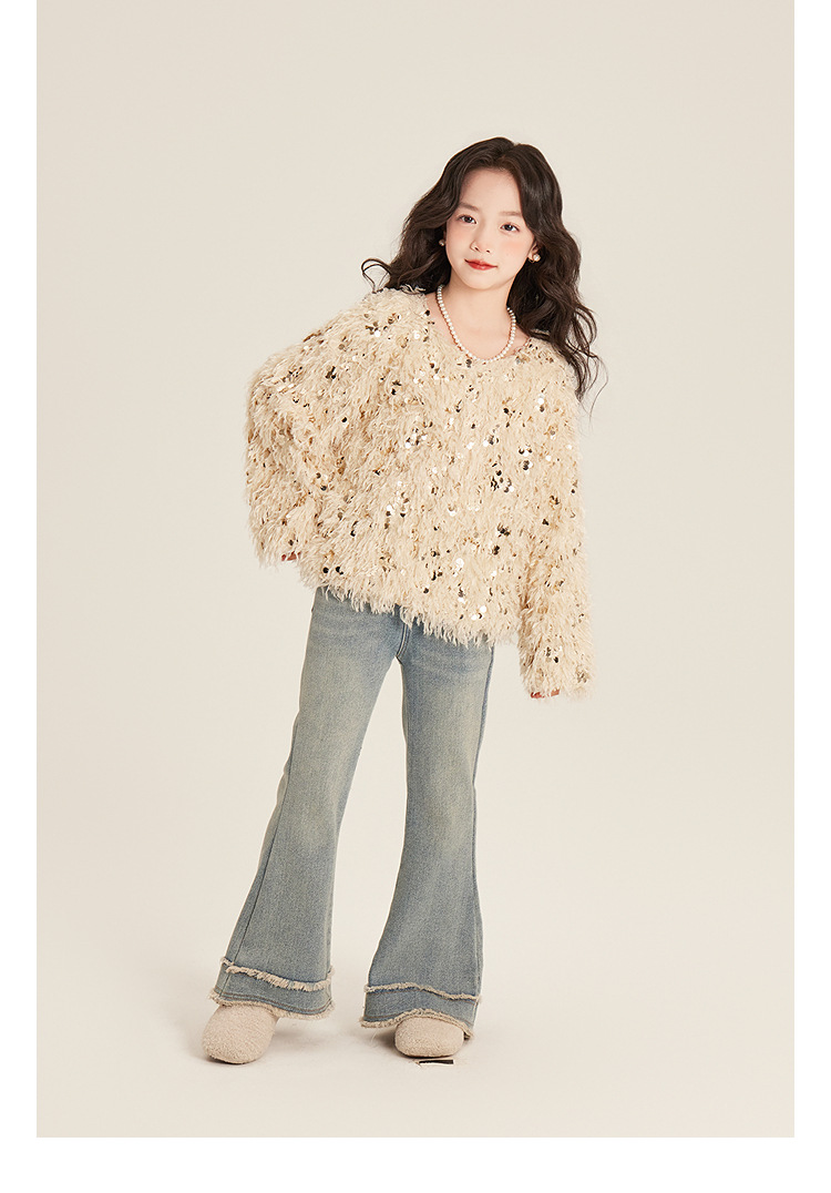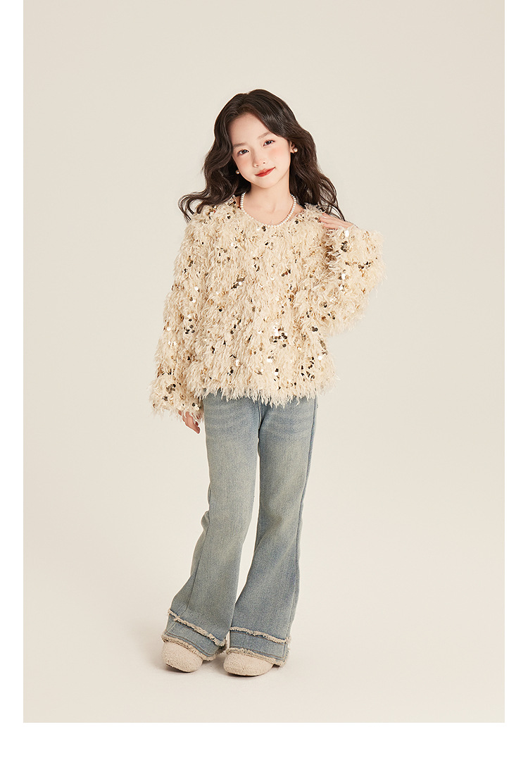 Amybaby Girl's Winter 2024 새로운 프랑스 스타일 우아한 분위기 깃털 Sequin Tassel Top
